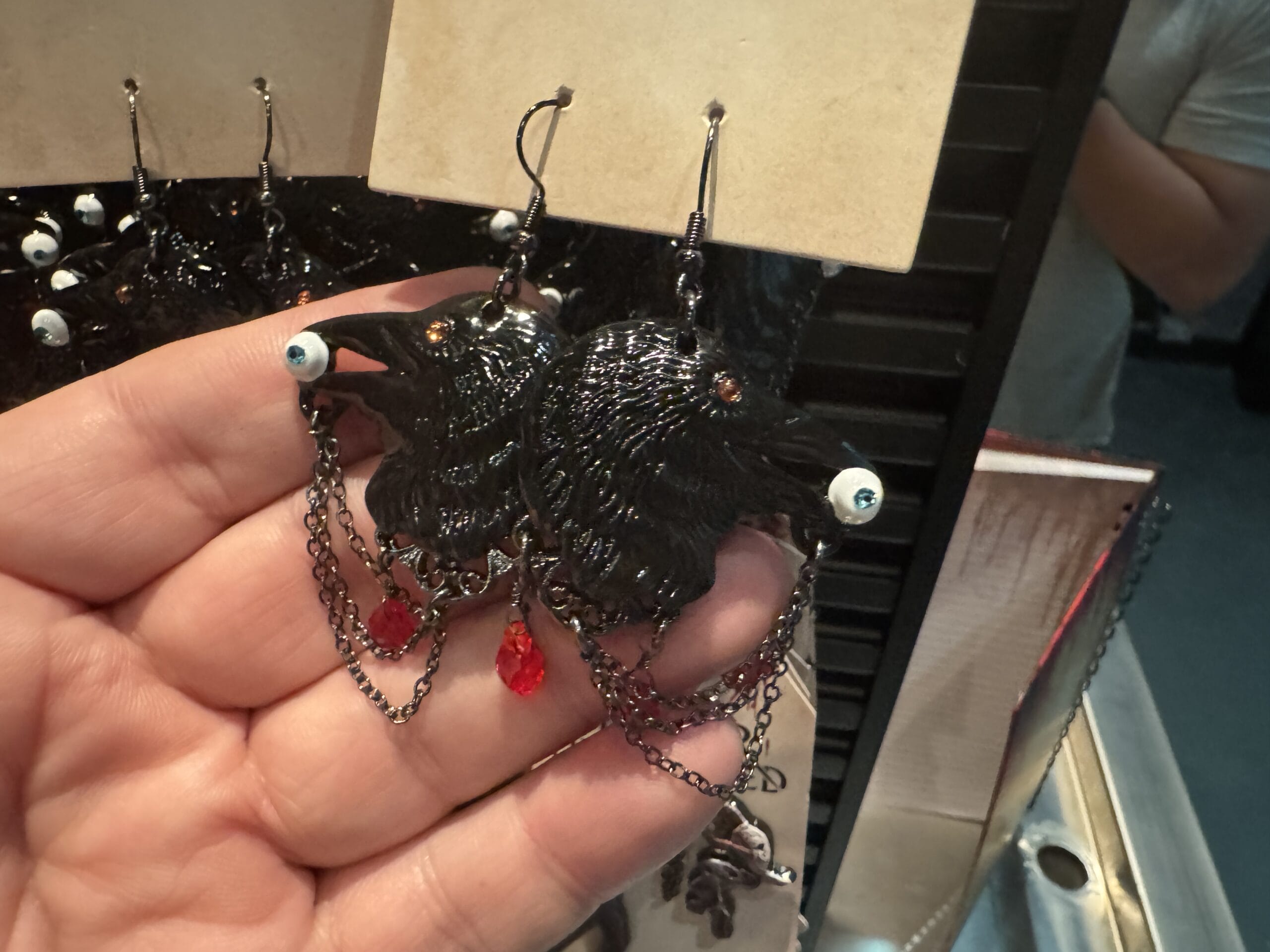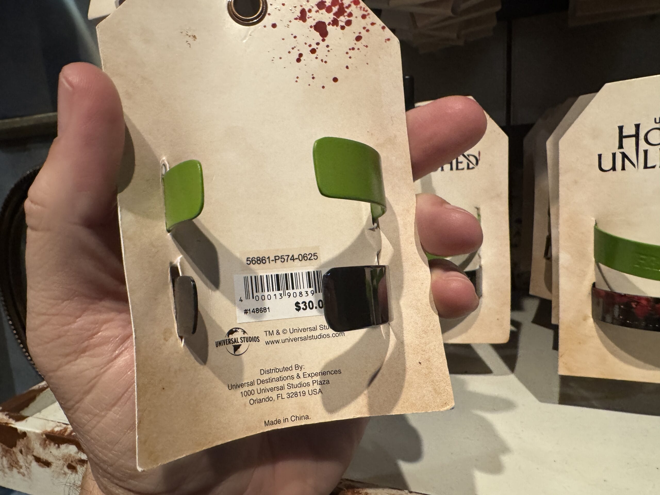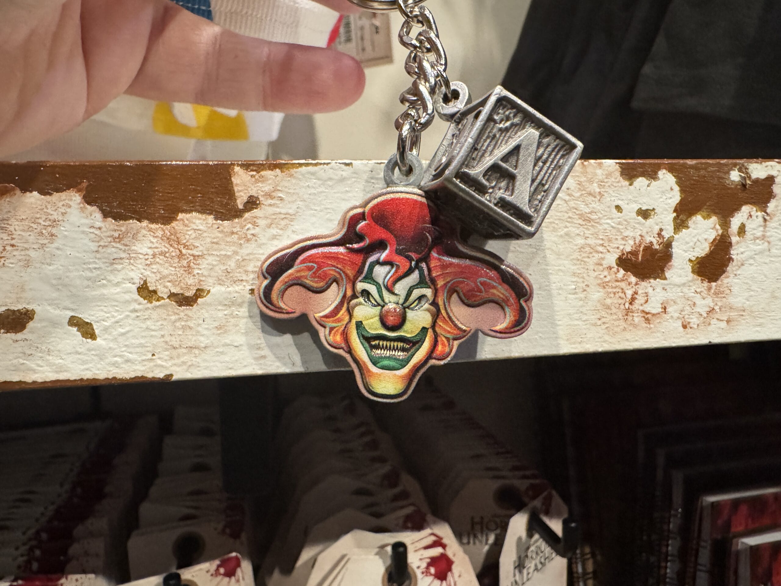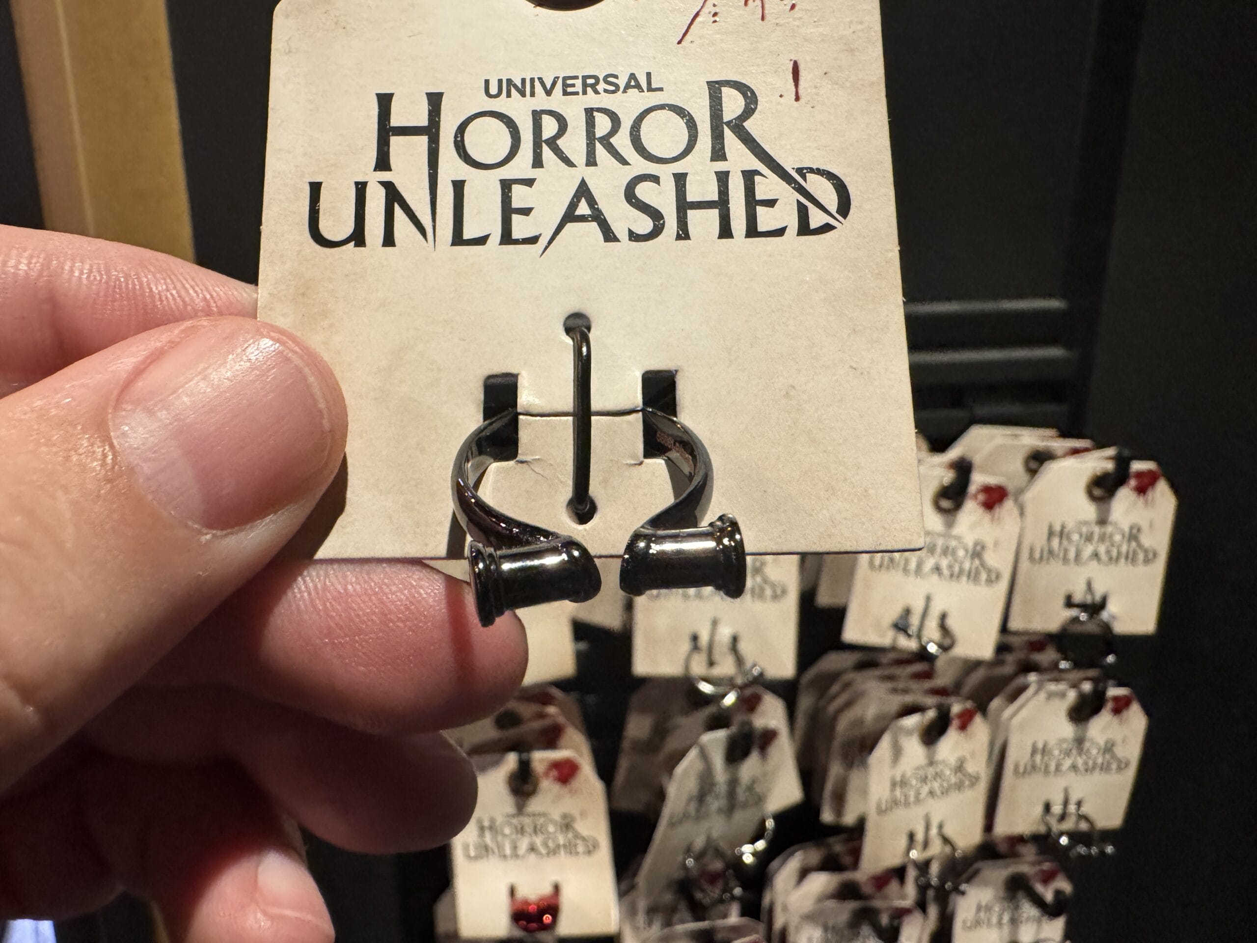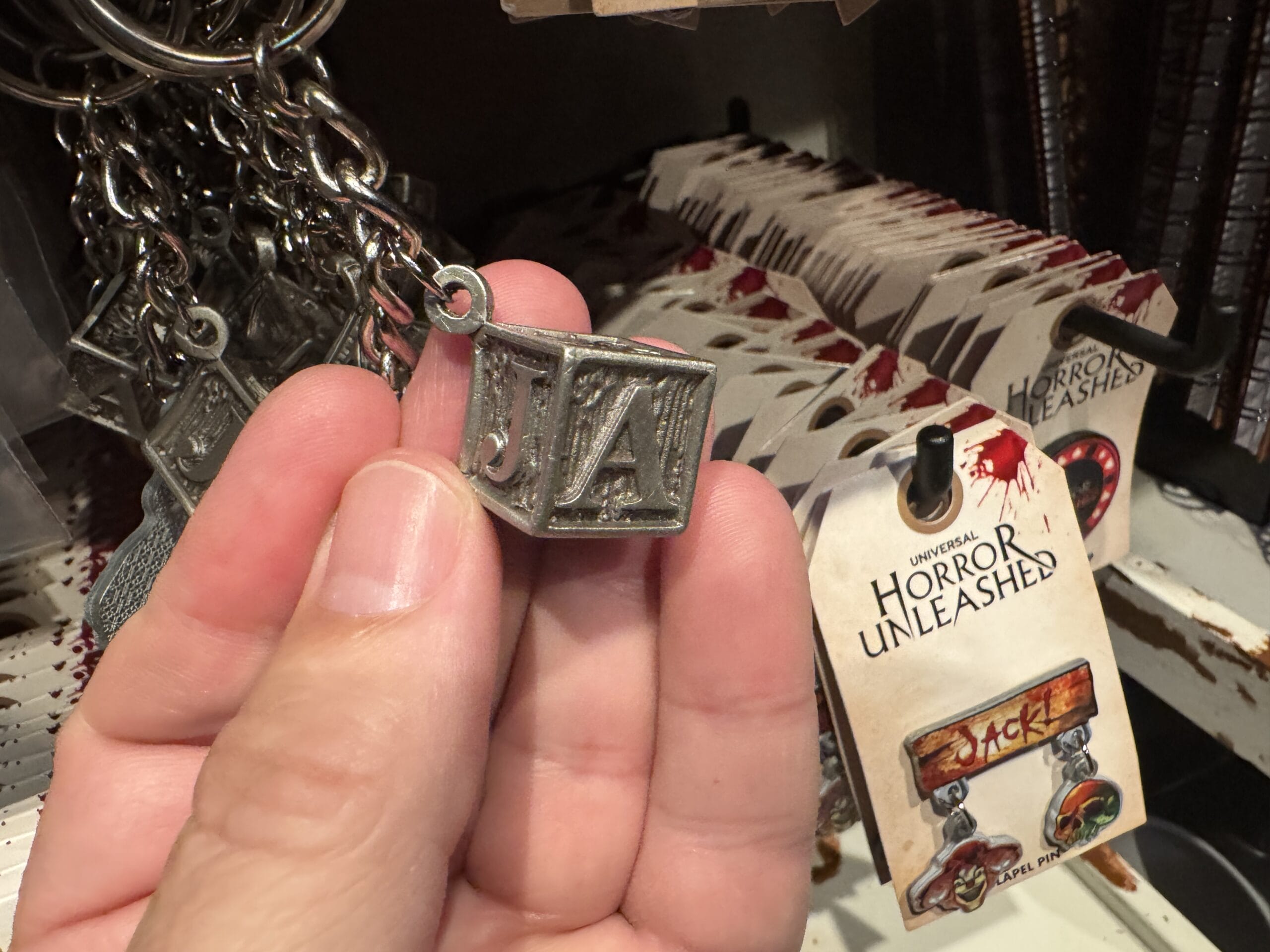 Keychains with black claws clutching eyeballs hang on display hooks with prices for Universal Horror Unleashed merchandise.