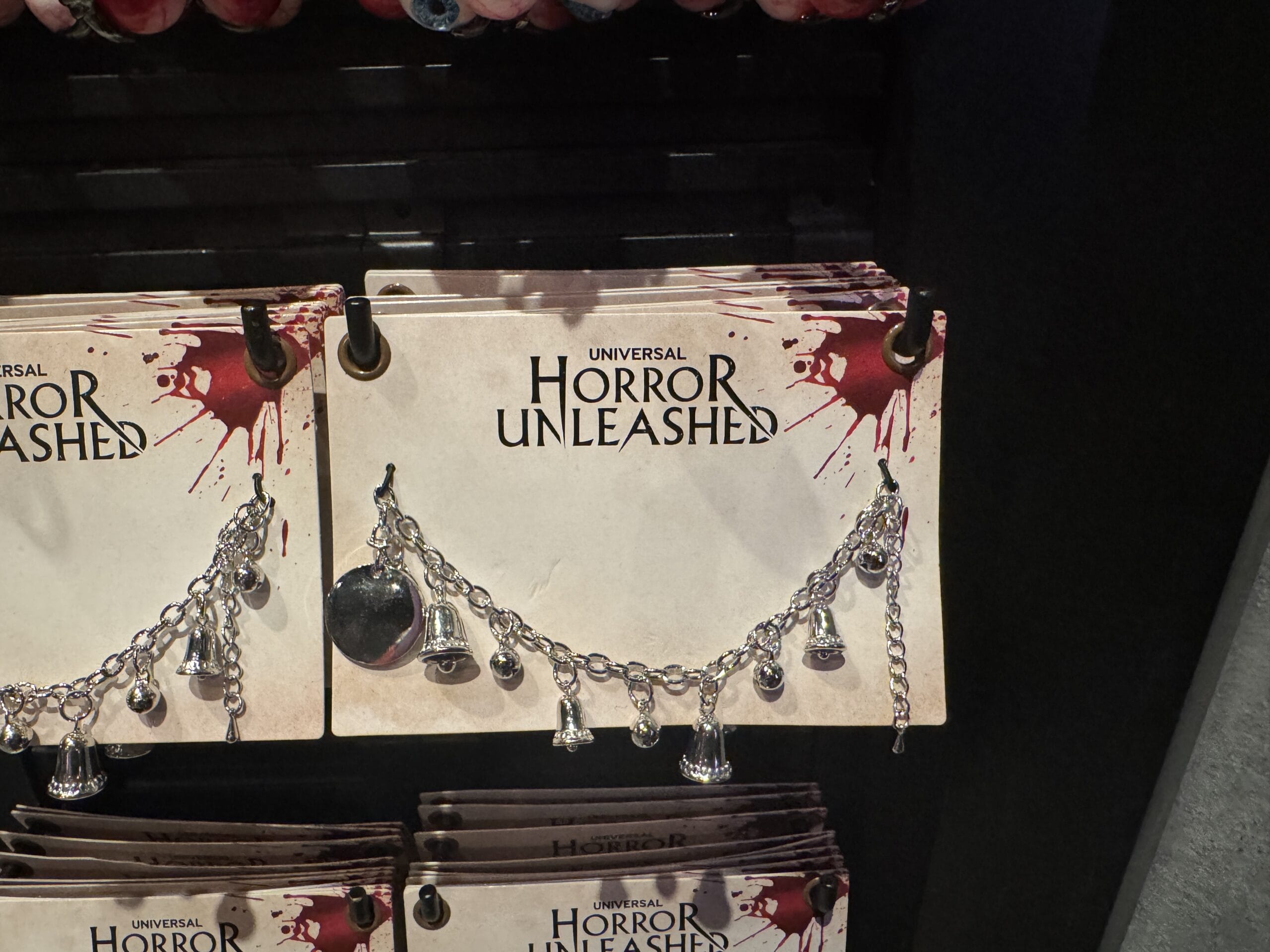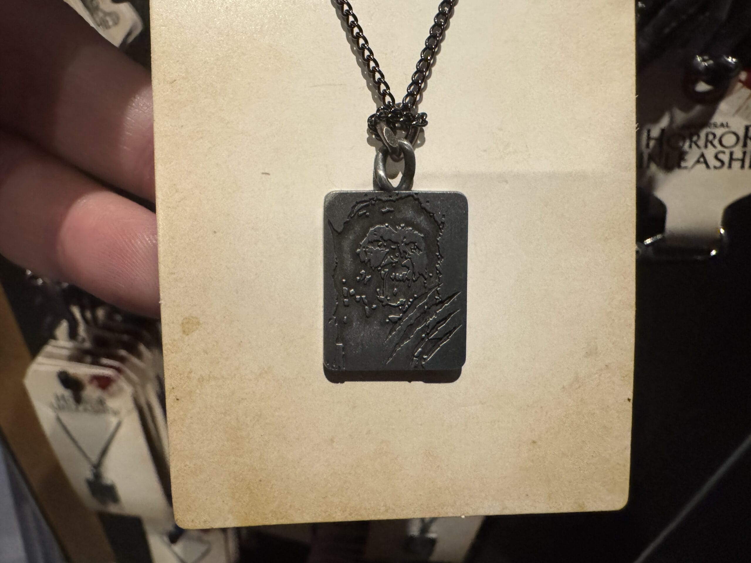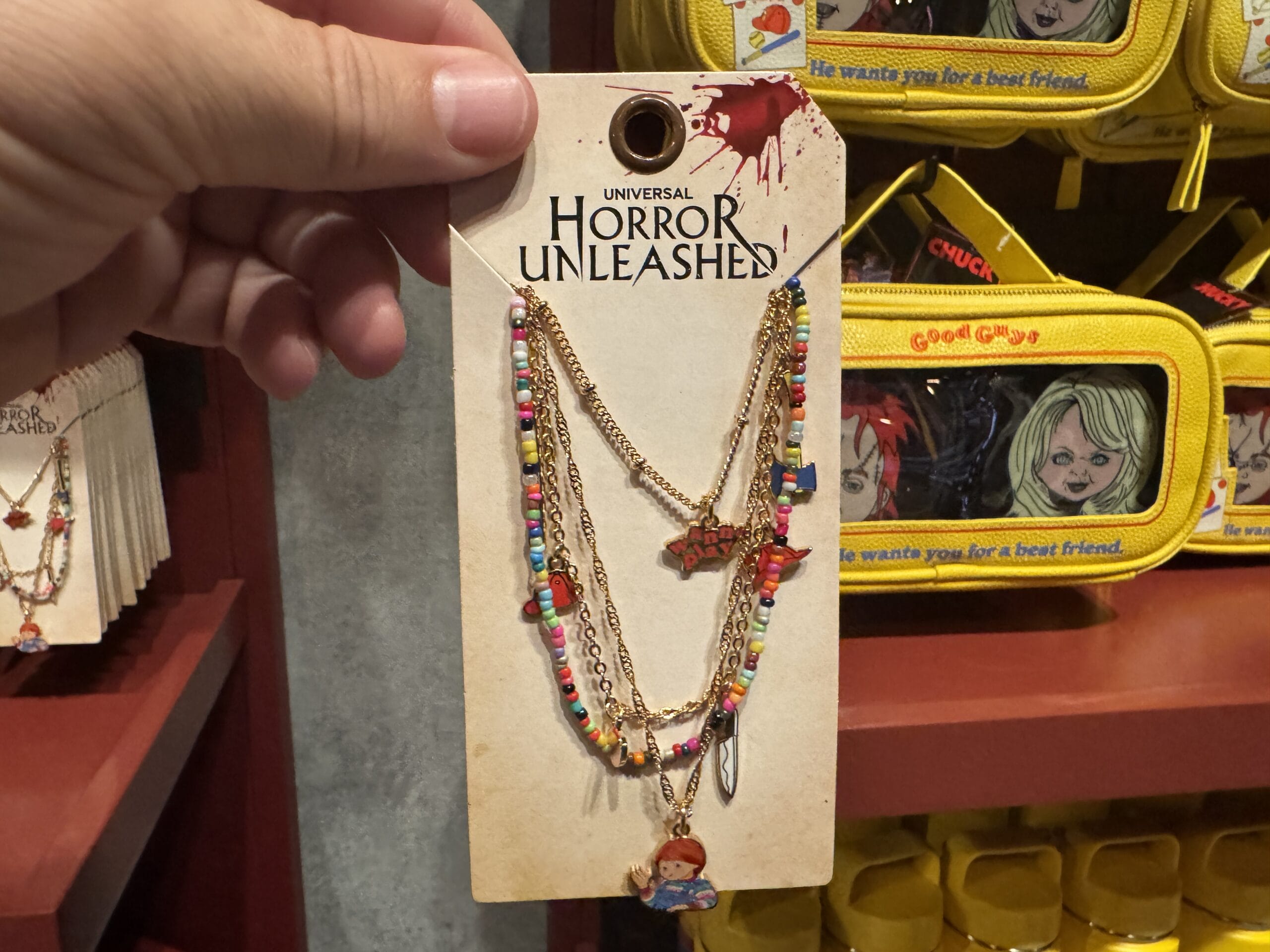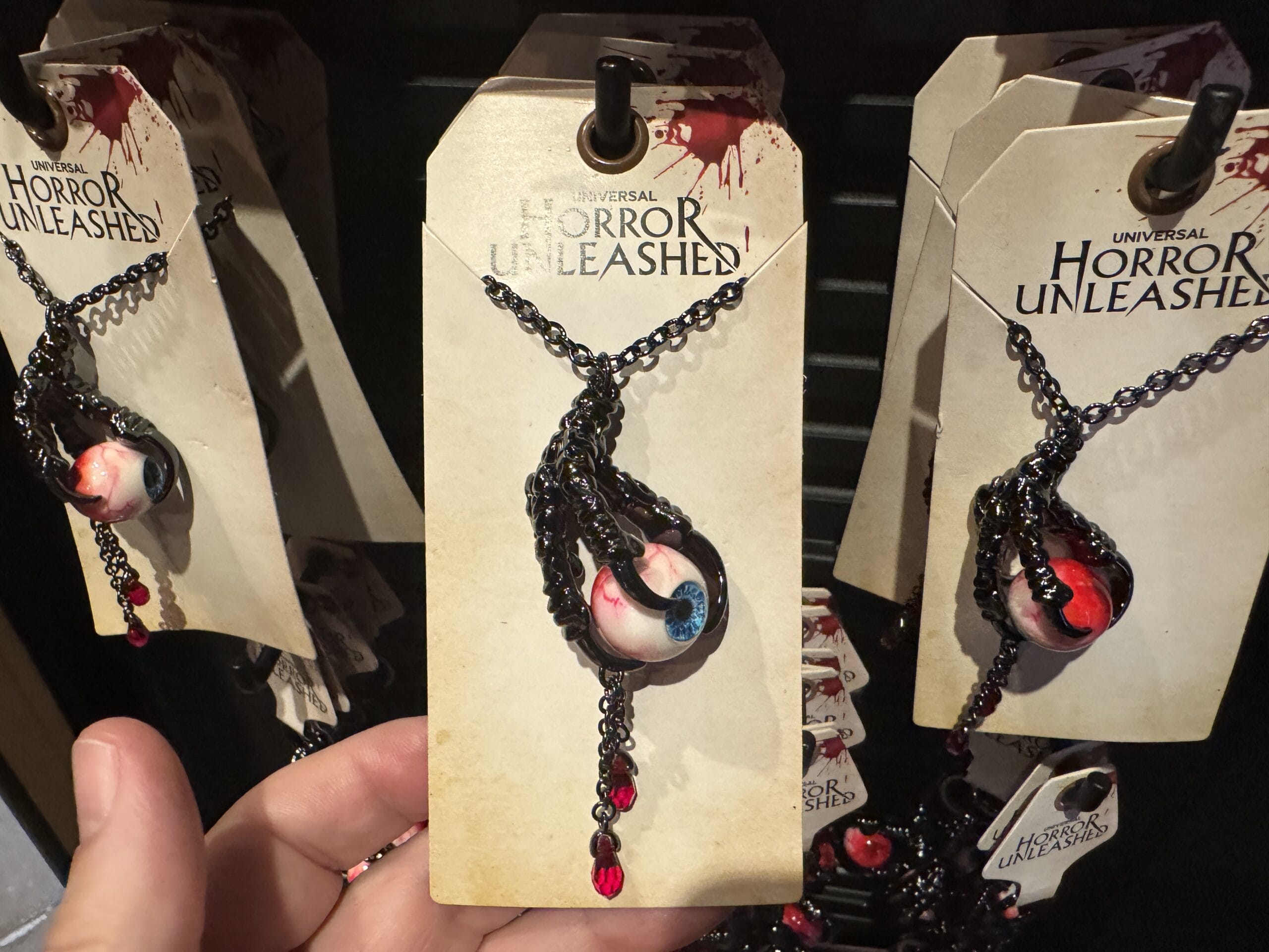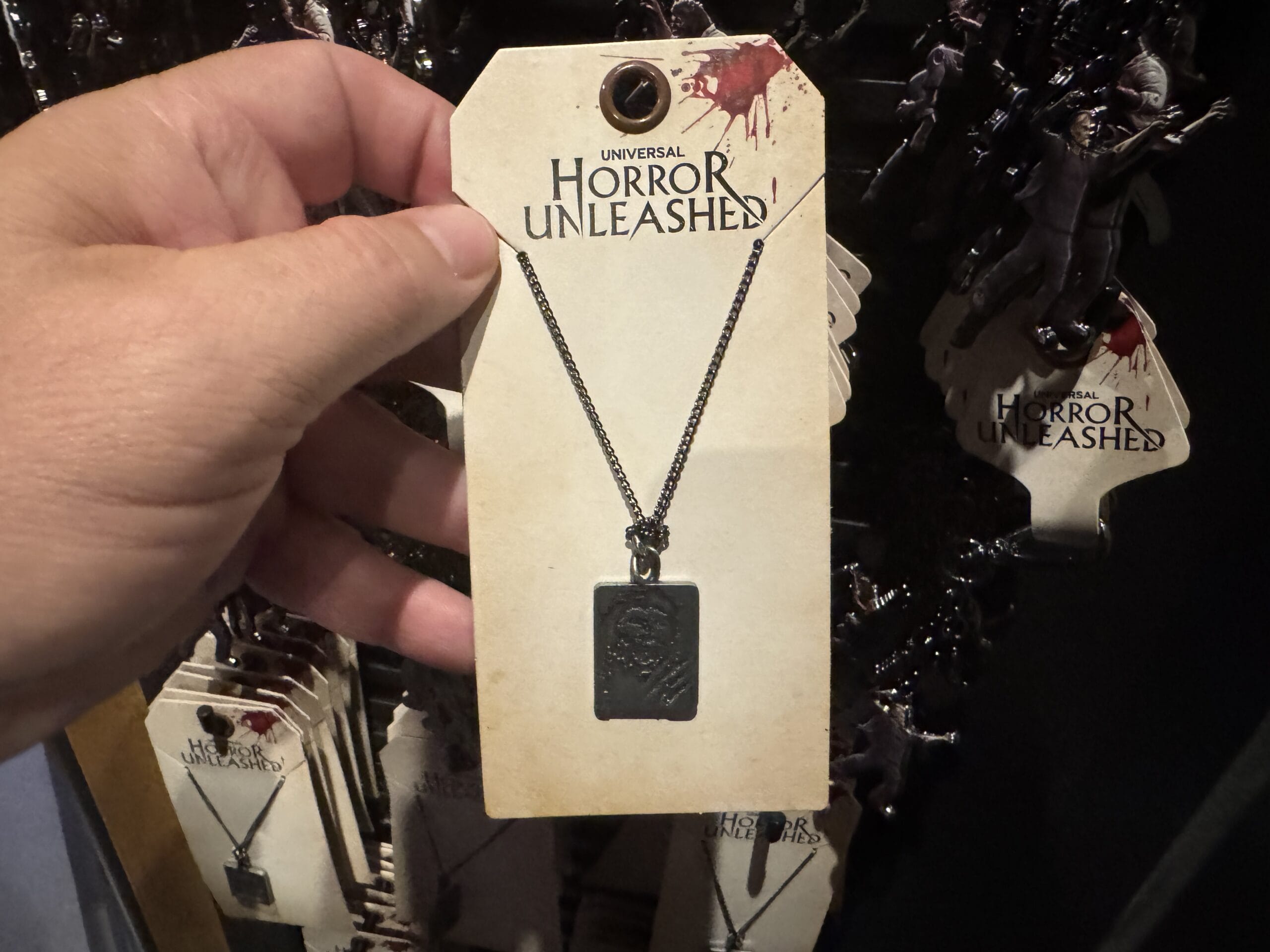 A hand holds a "Horror Unleashed" necklace set from Universal Horror Unleashed merchandise in a store display.