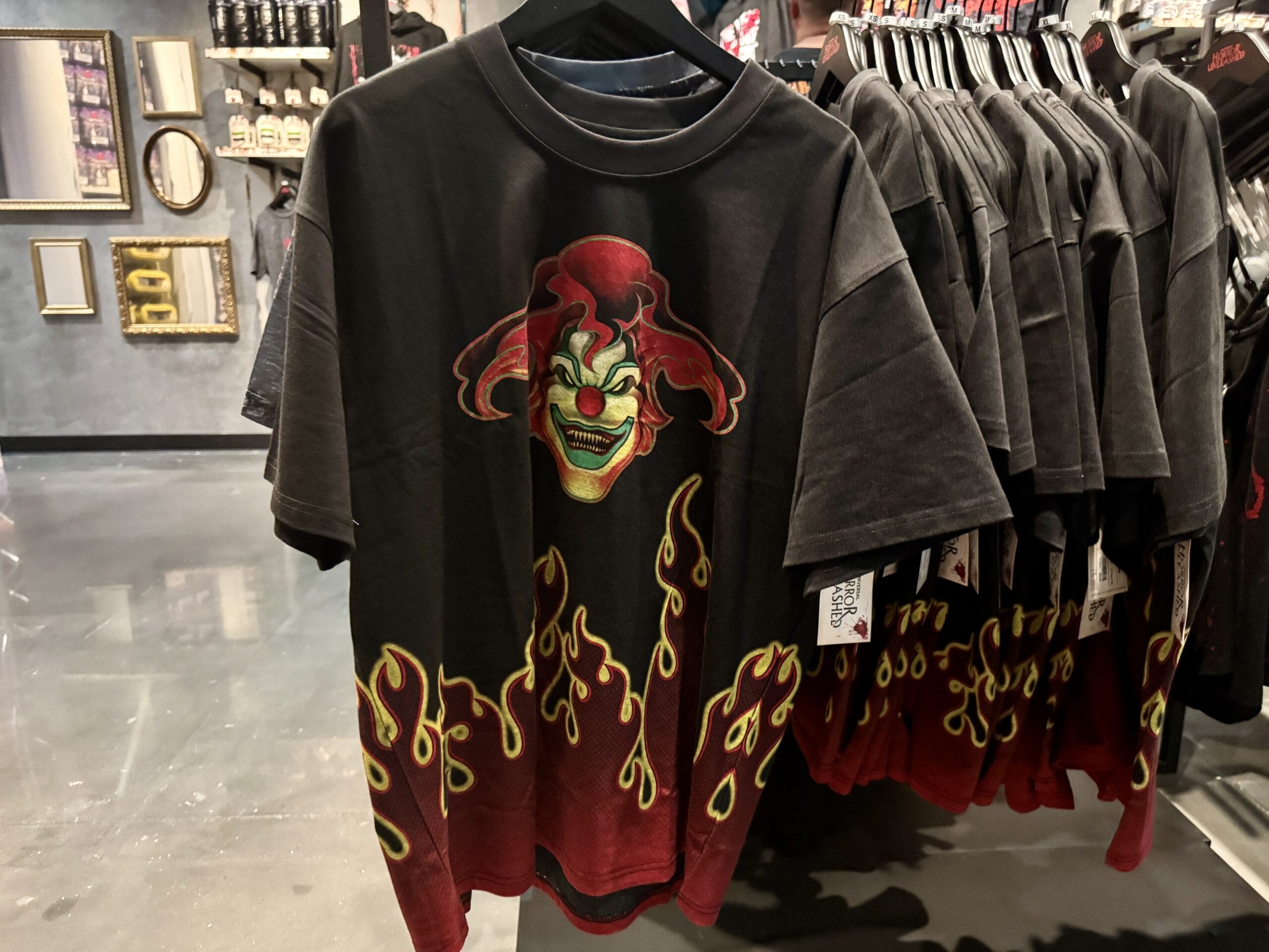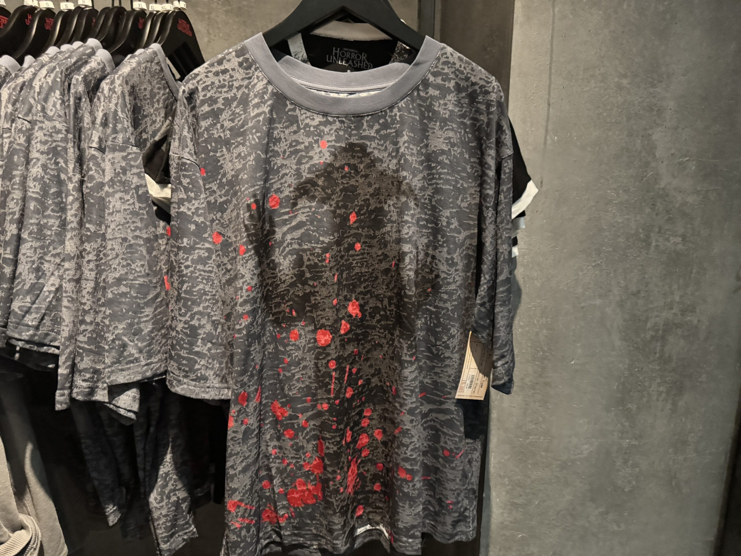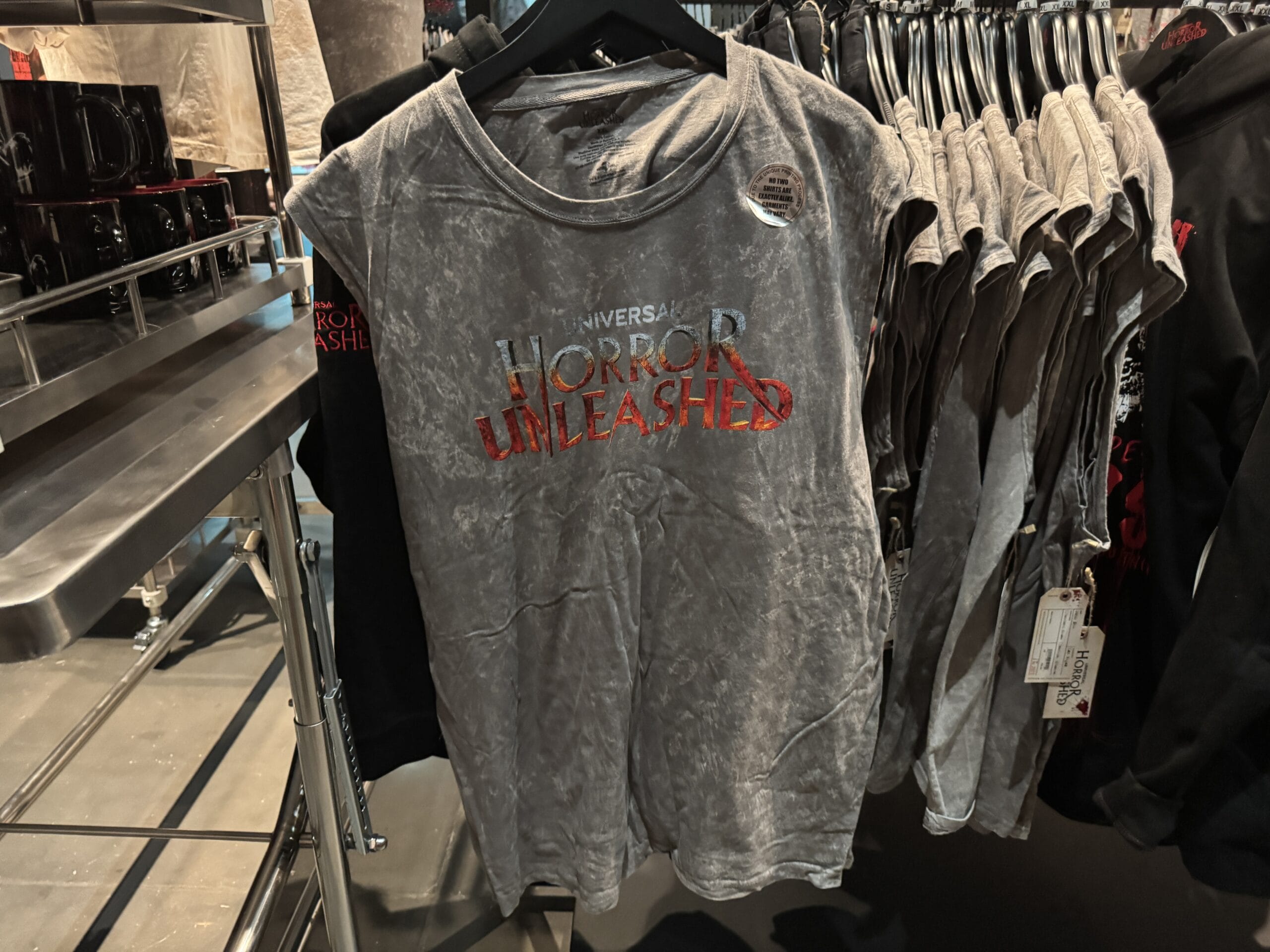 A gray Universal Horror Unleashed T-shirt hangs on a rack with other merchandise in the store.