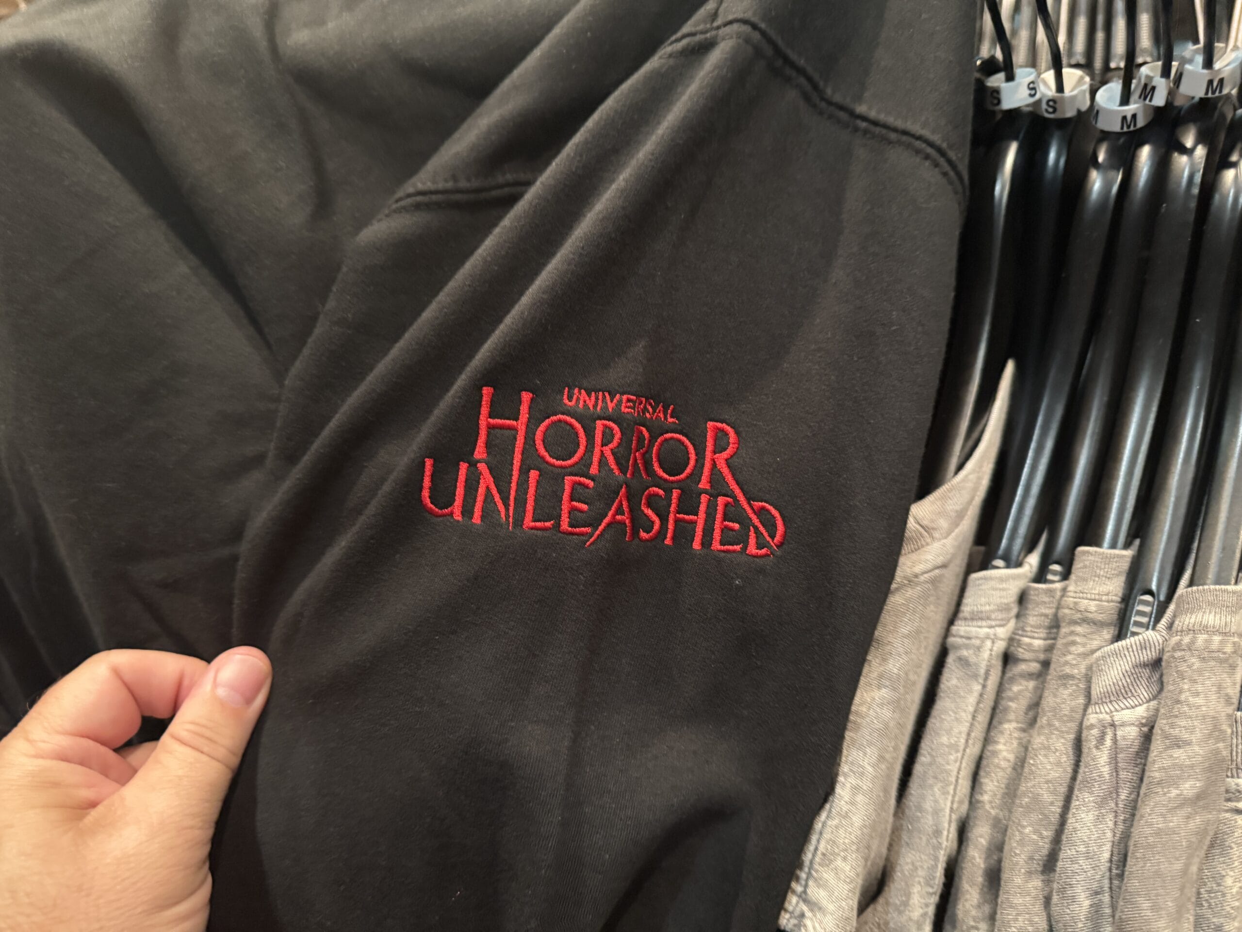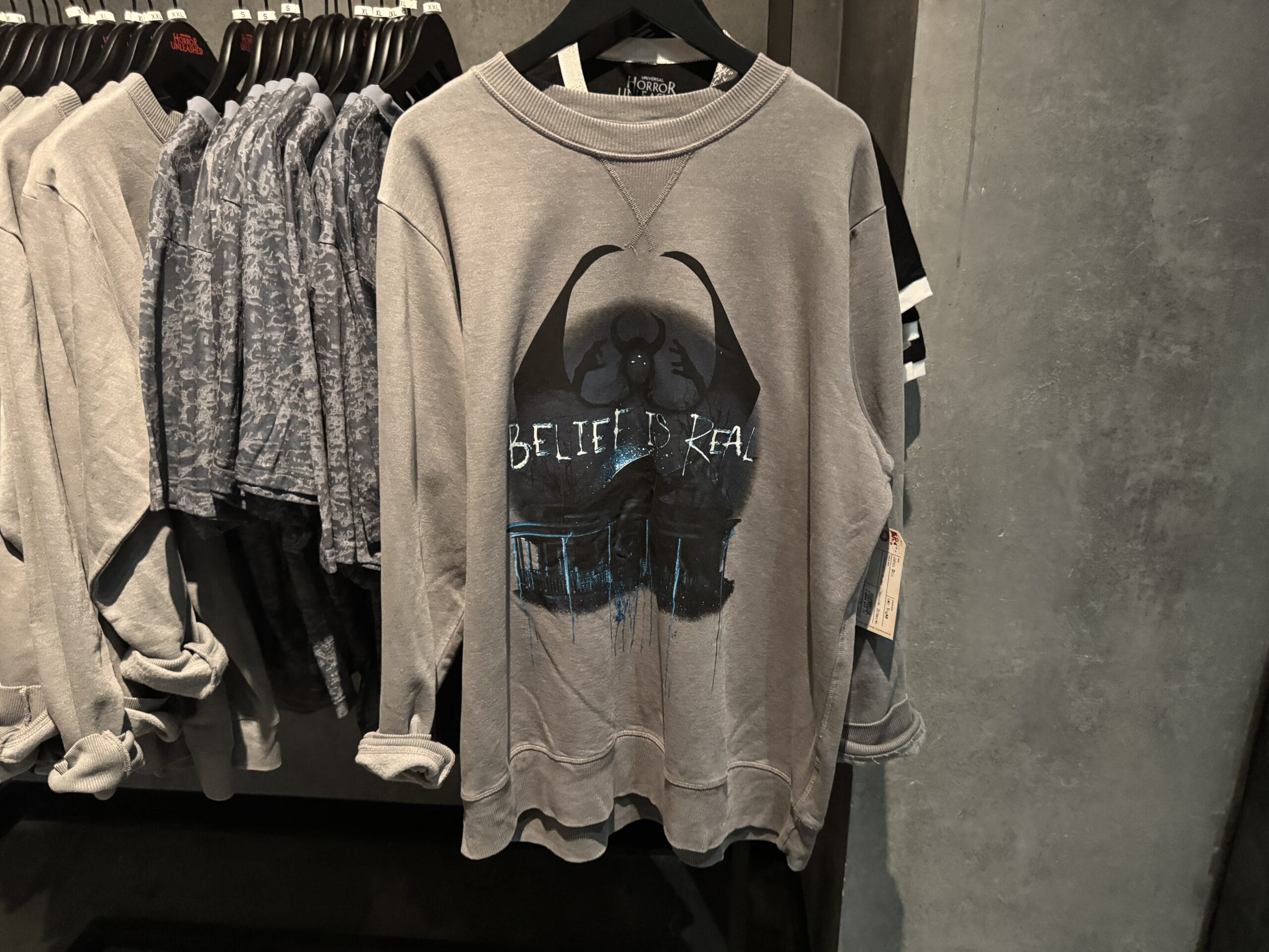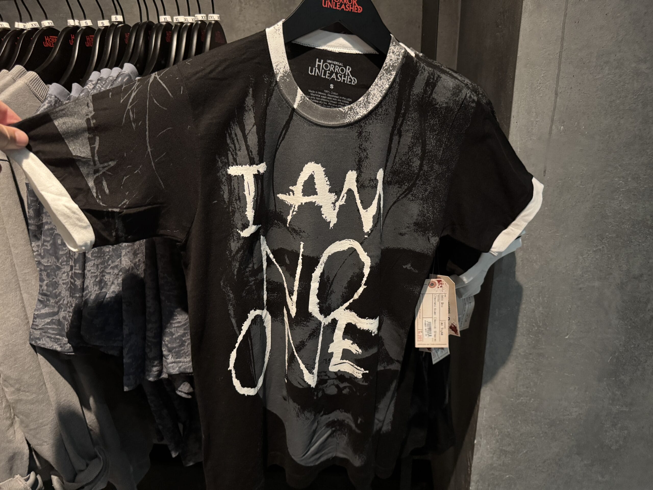 A gray Universal Horror Unleashed T-shirt hangs on a rack with other merchandise in the store.