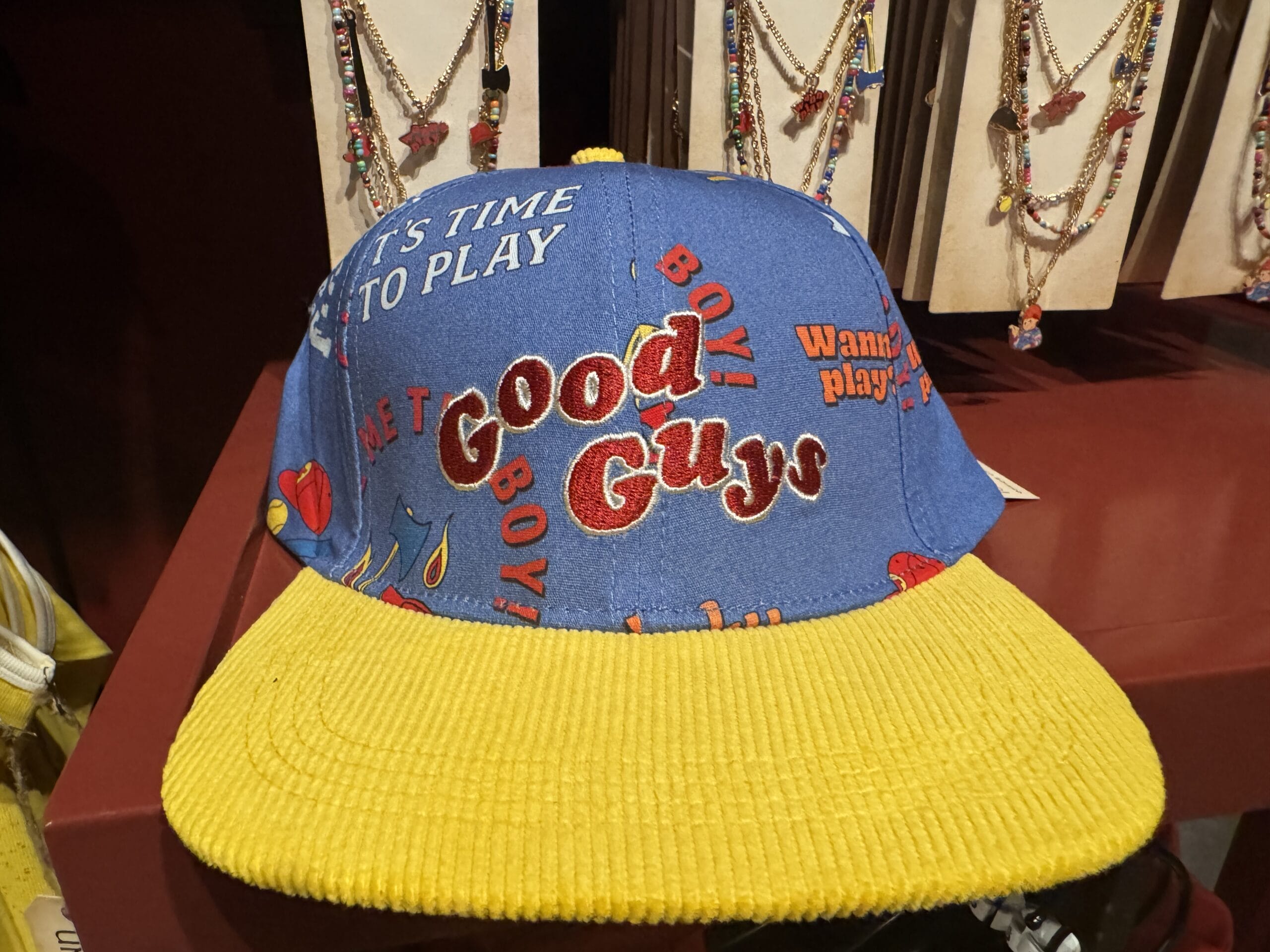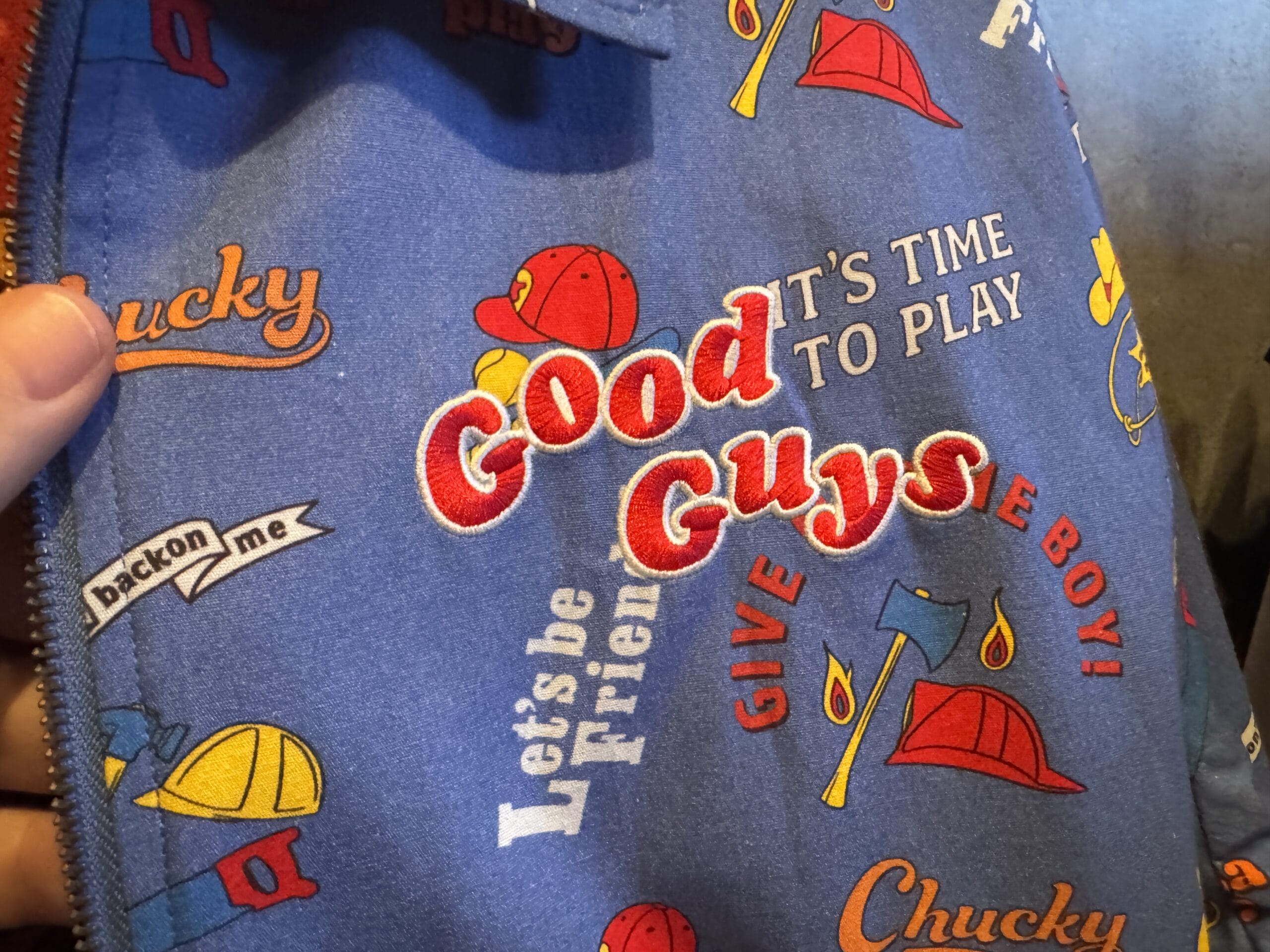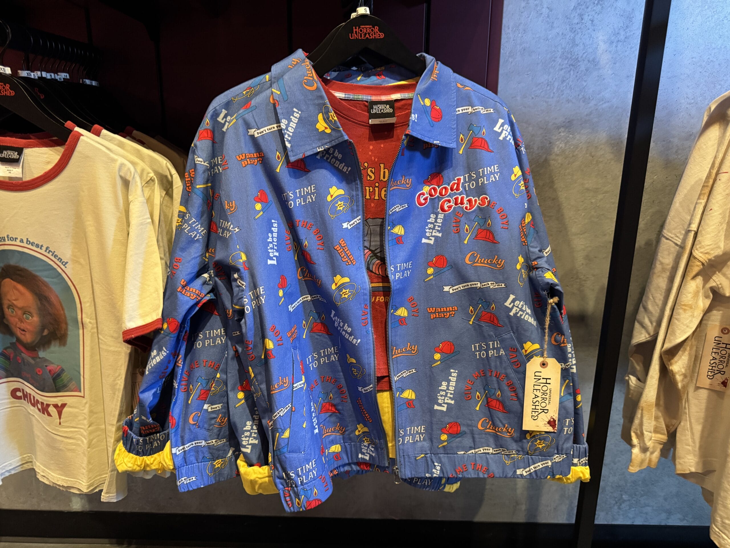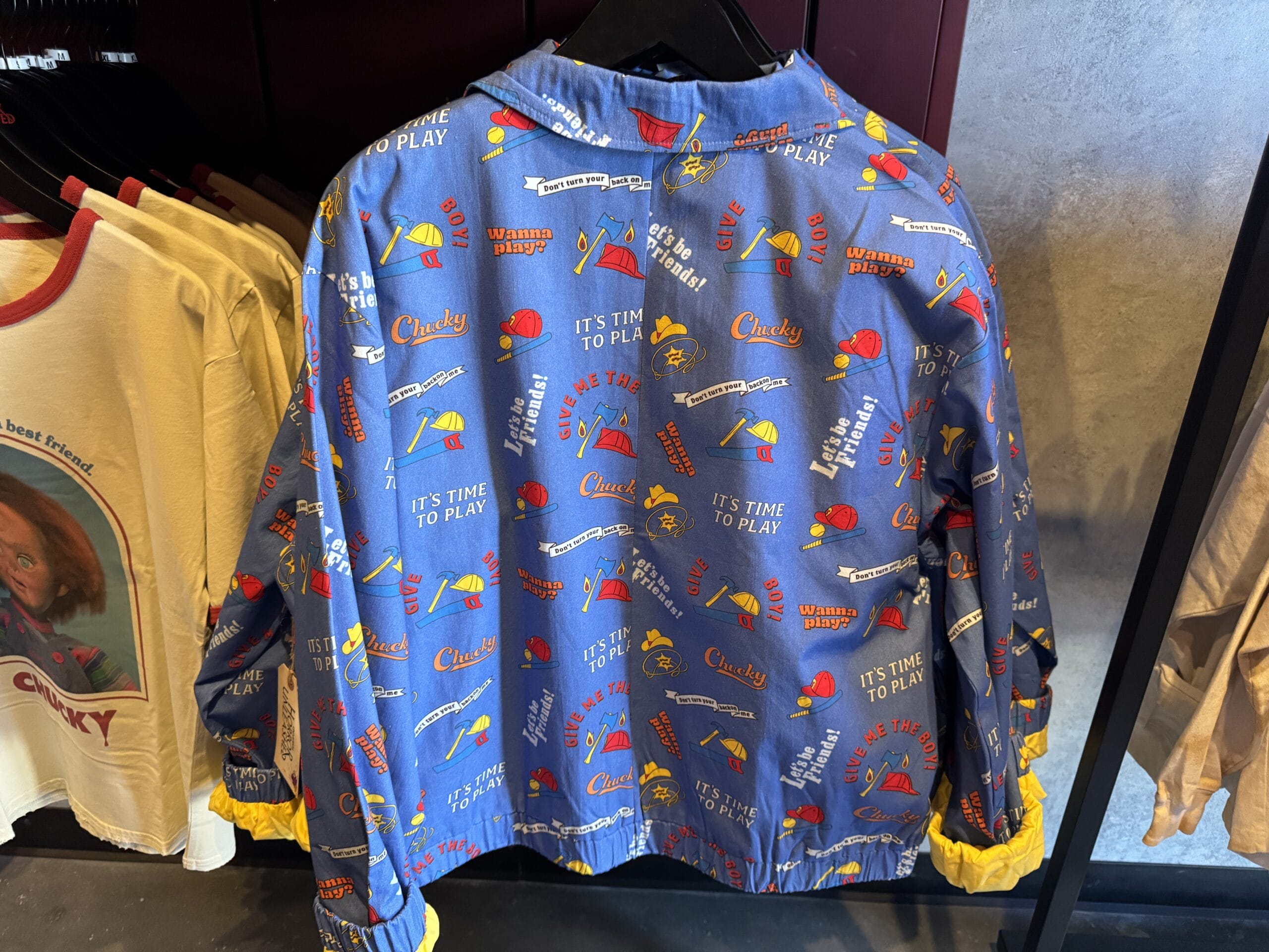 There is also a blue “Good Guys” jacket available in this collection. It has an all-over print with several iconic Chucky quotes, hats, and weapons. The interior lining is yellow.
