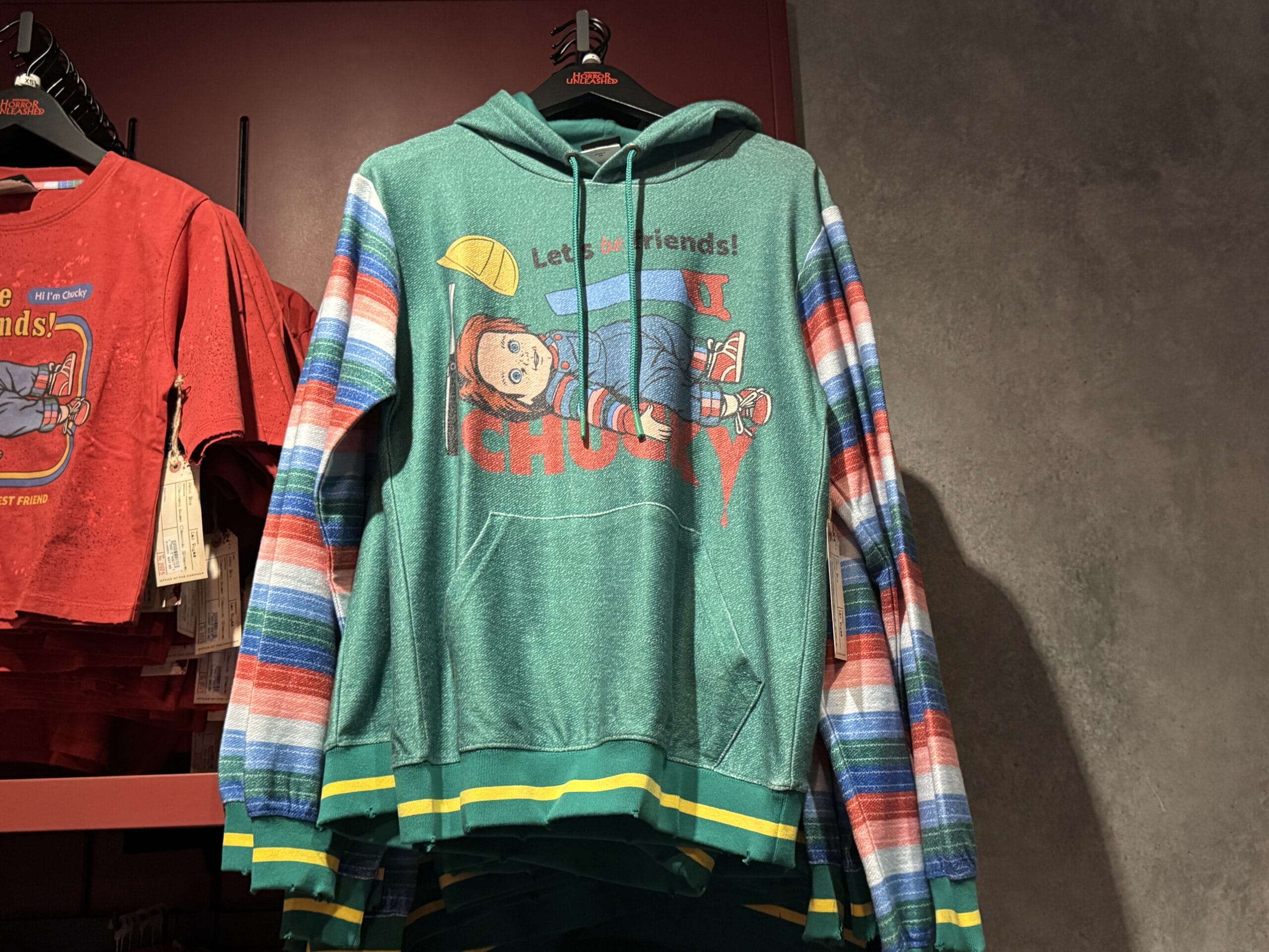 Green hoodie with "Chucky" graphic and stripes, part of Universal Horror Unleashed merchandise, hanging on a rack.