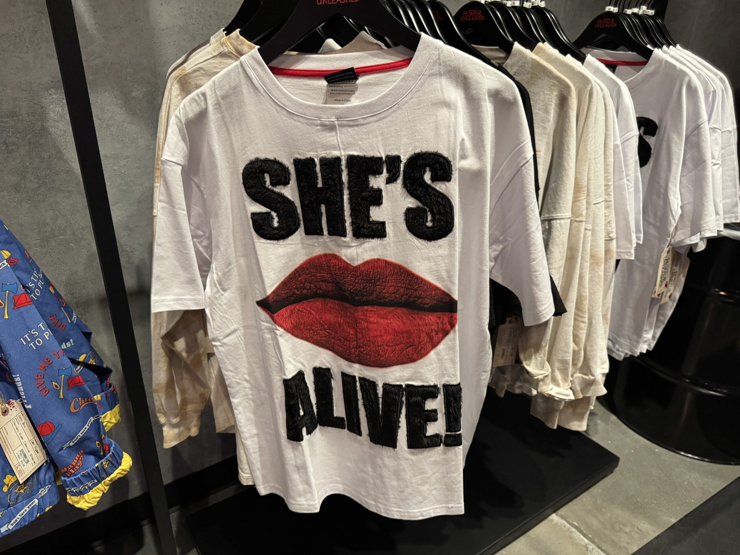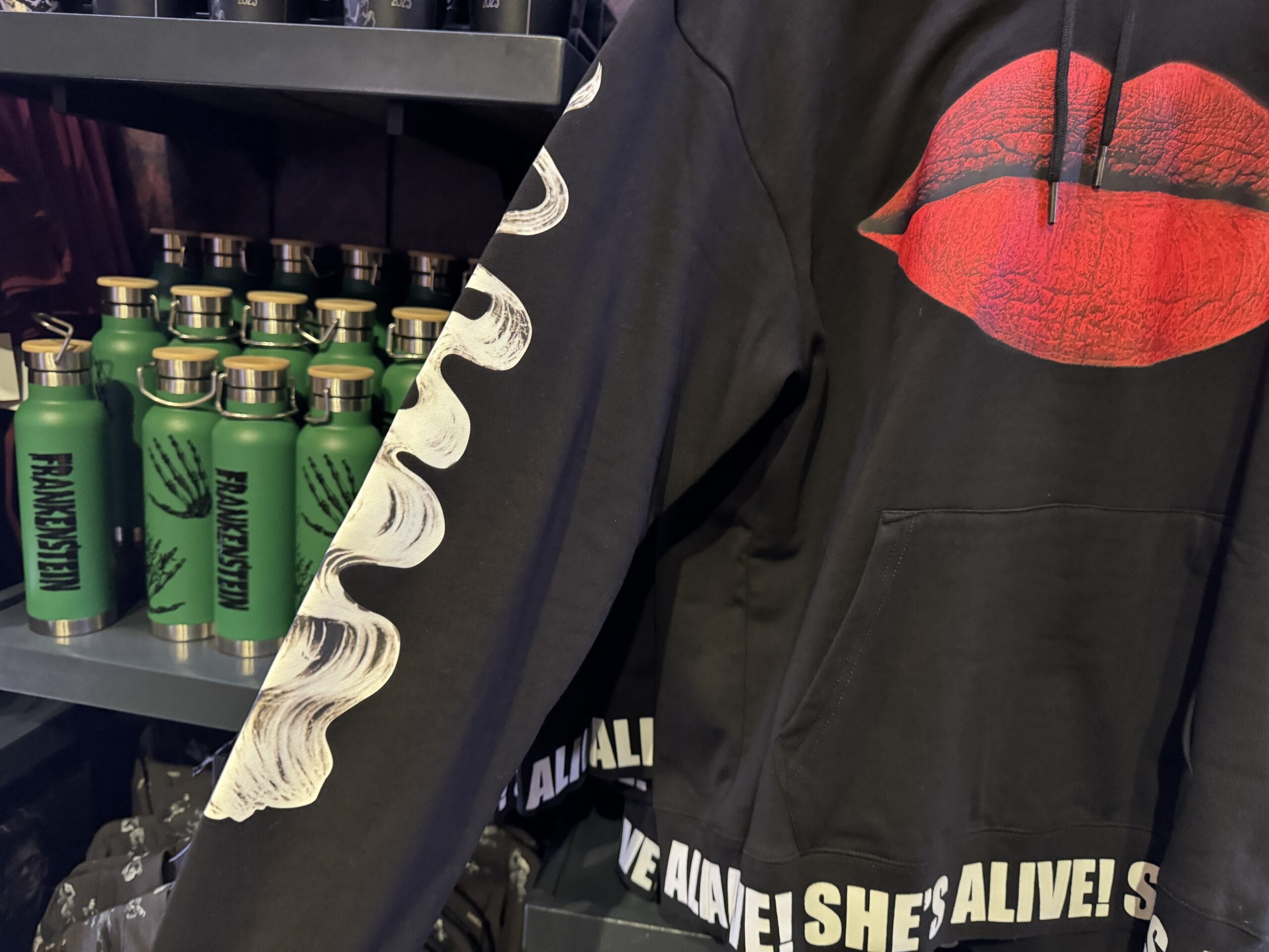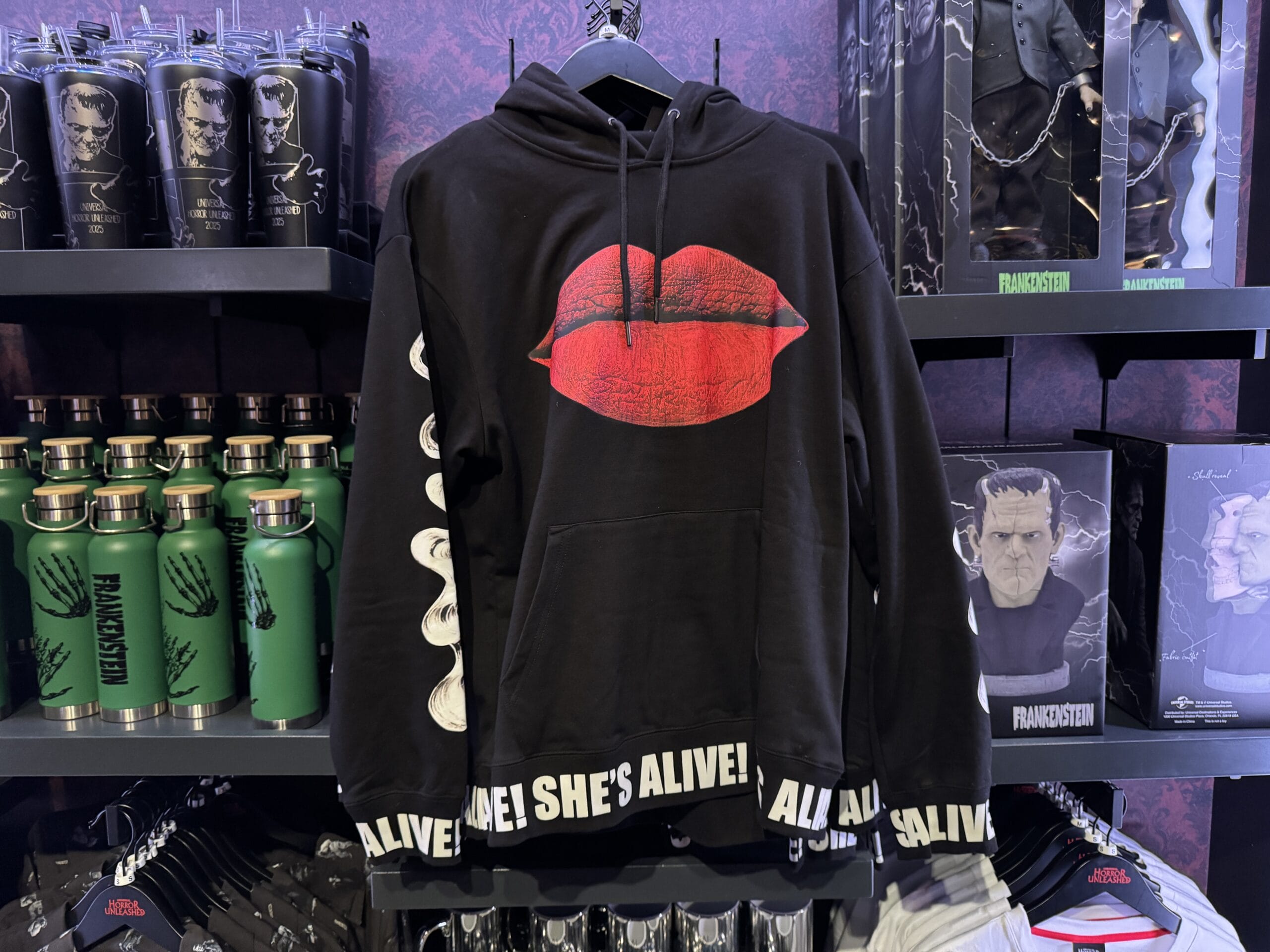 Black hoodie with red lips graphic, "SHE'S ALIVE!" cuffs, among Universal Horror Unleashed merchandise in store.