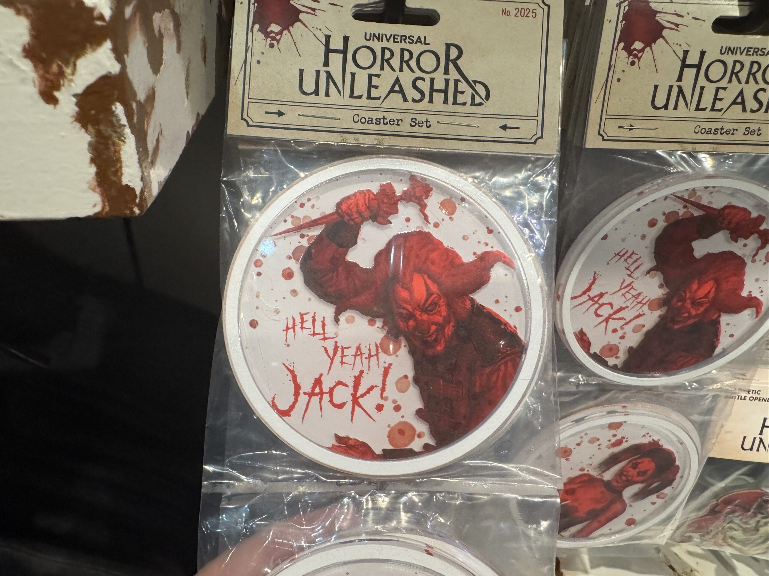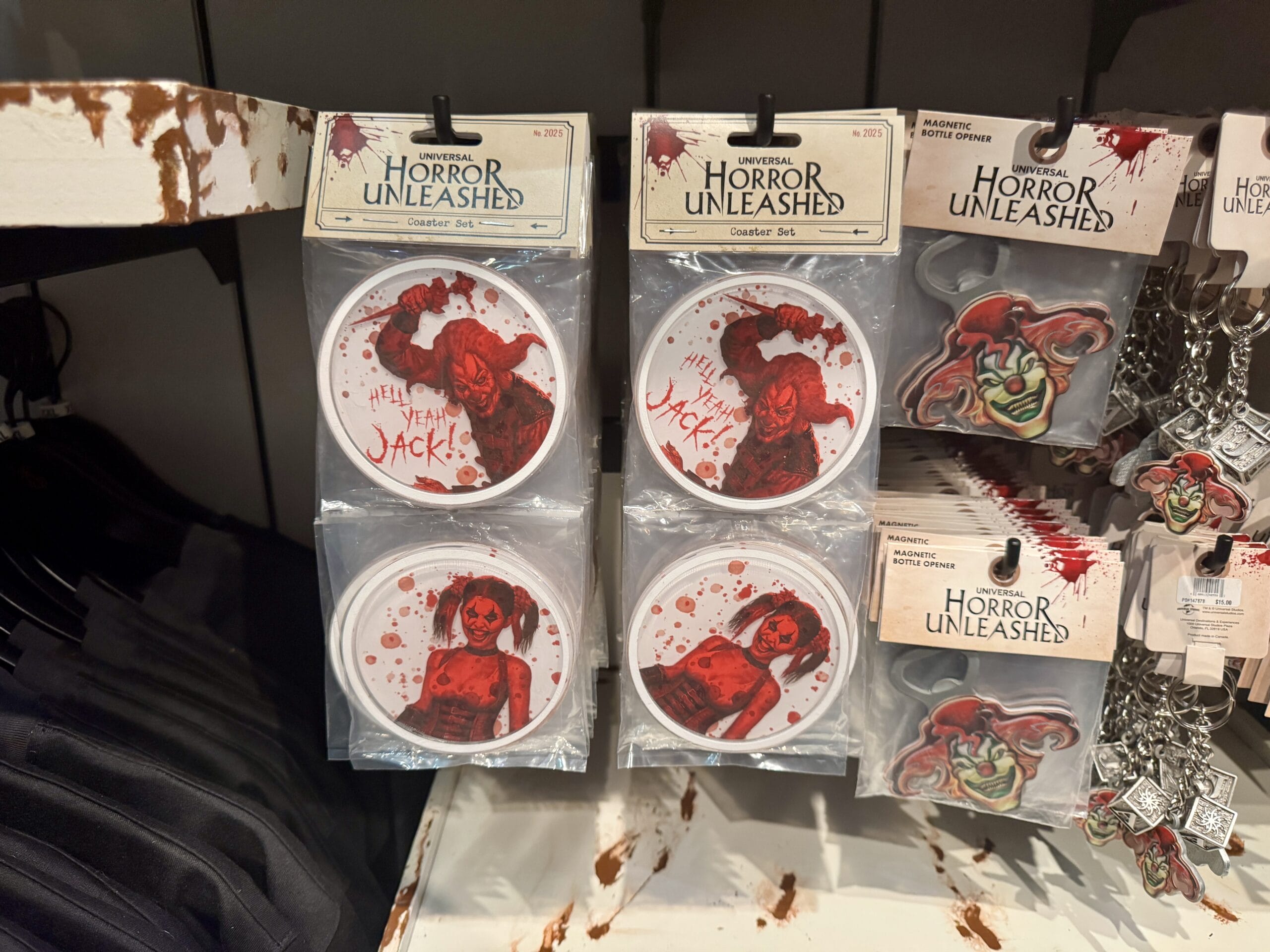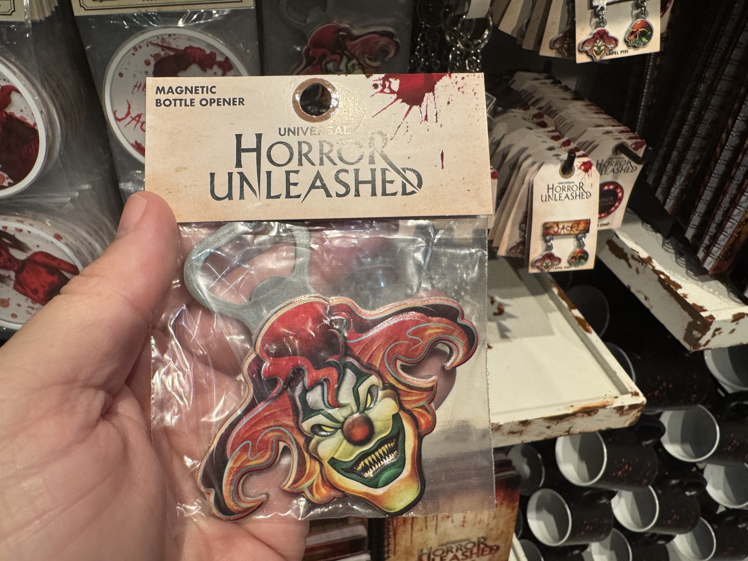 Four circular magnets featuring "Jack" the bloody clown, part of Universal Horror Unleashed merchandise, on a store shelf.