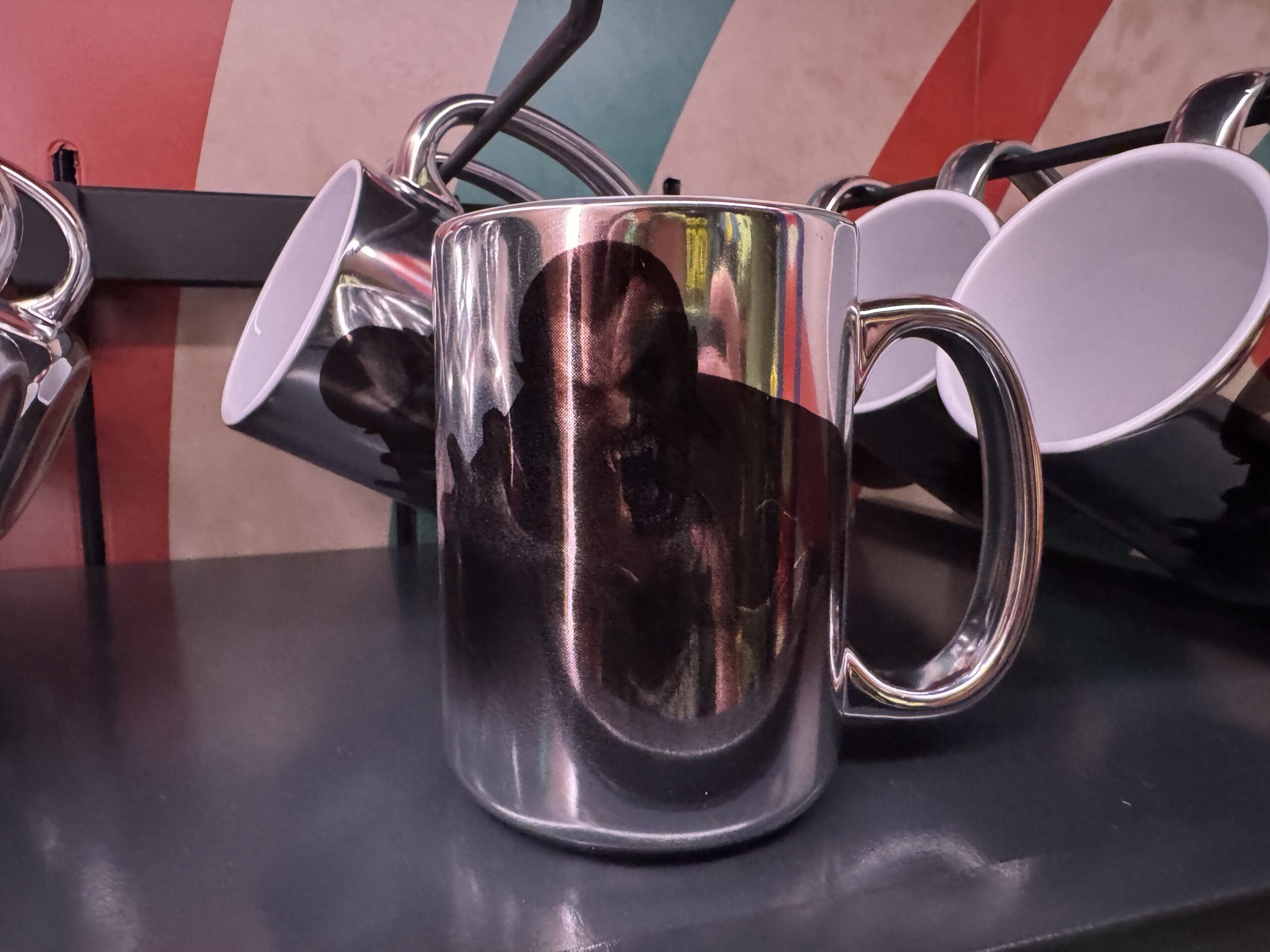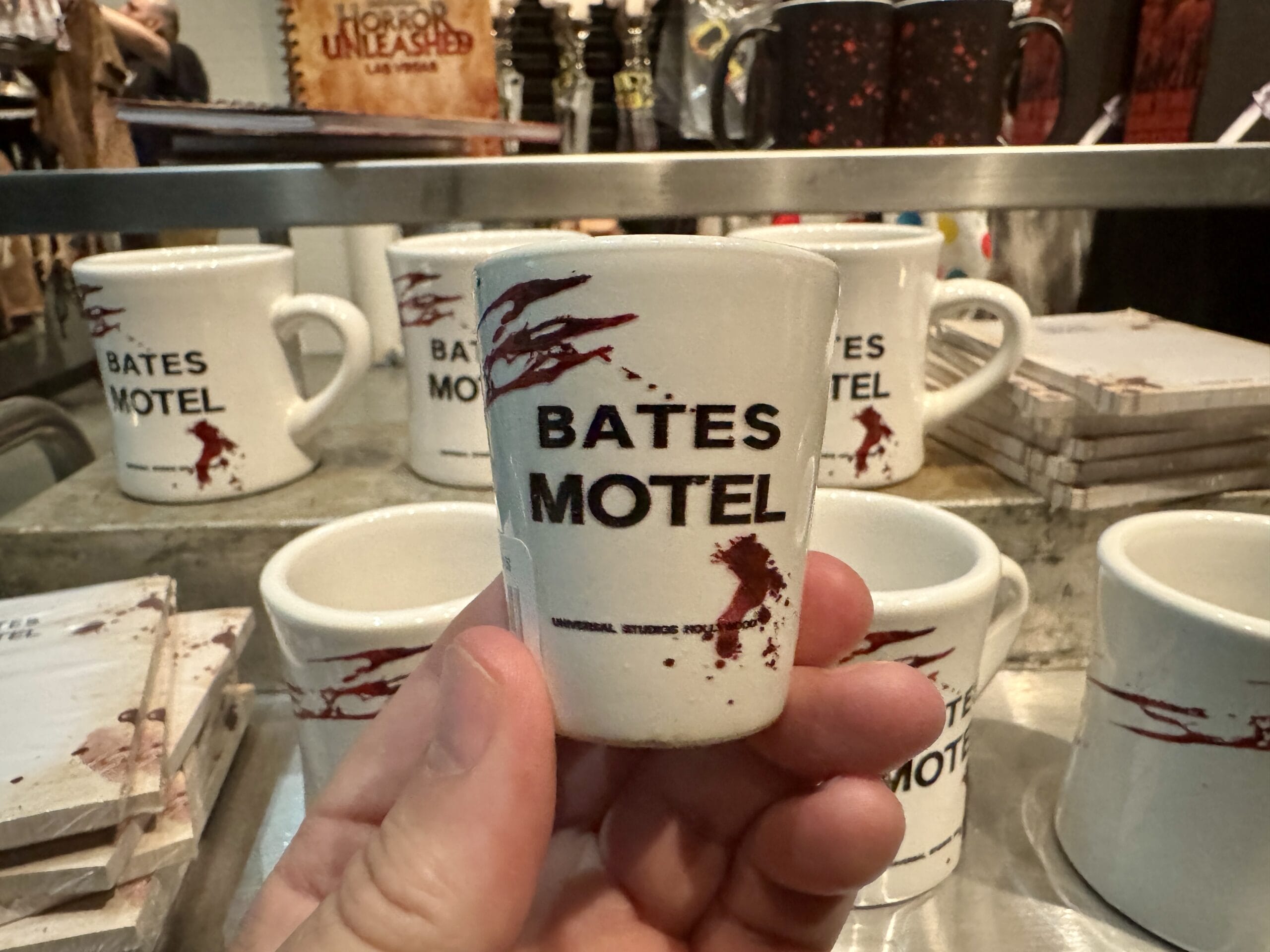 A hand holds a "Bates Motel" mug, part of Universal Horror Unleashed merchandise; similar mugs, prices visible behind.