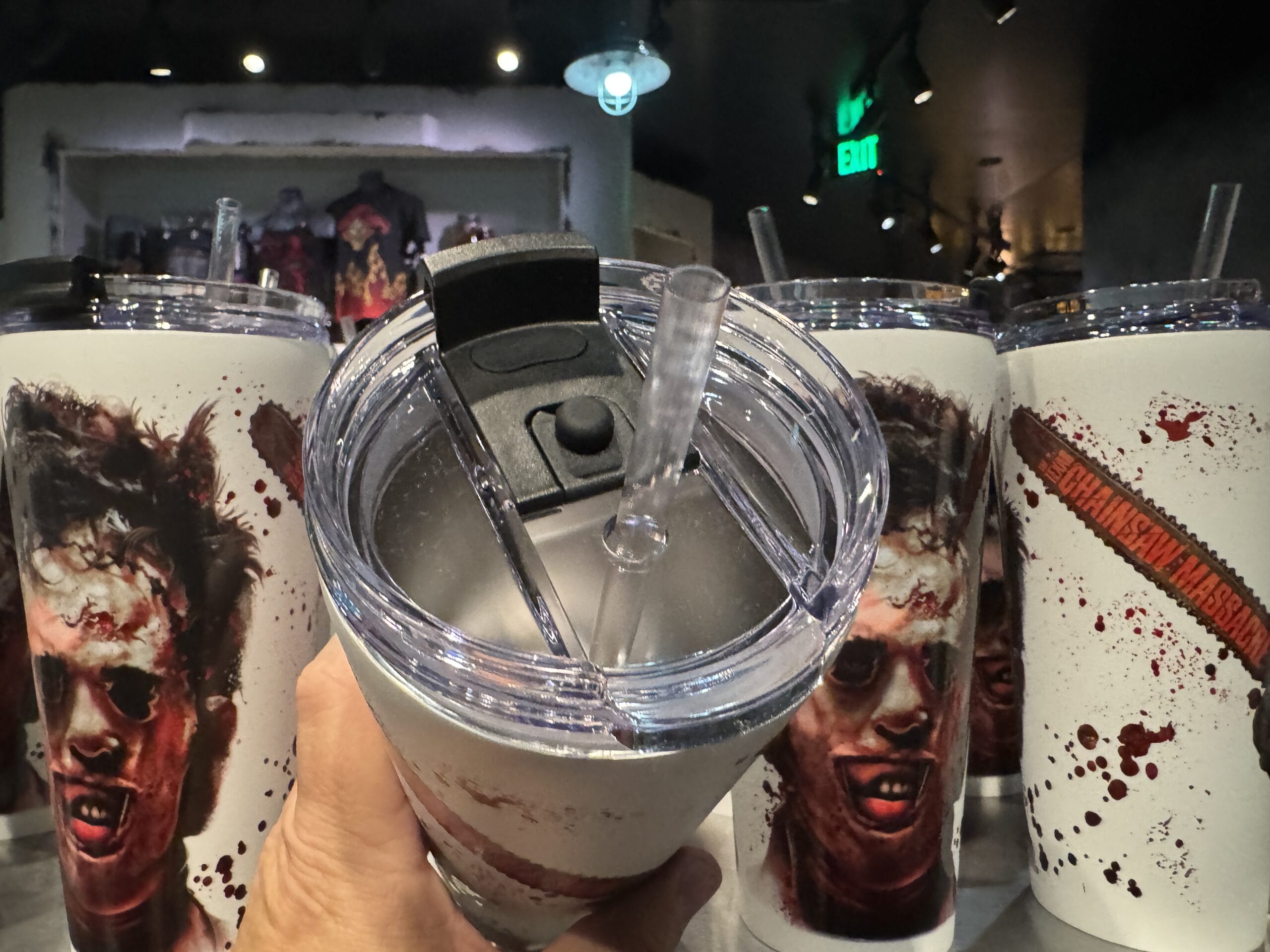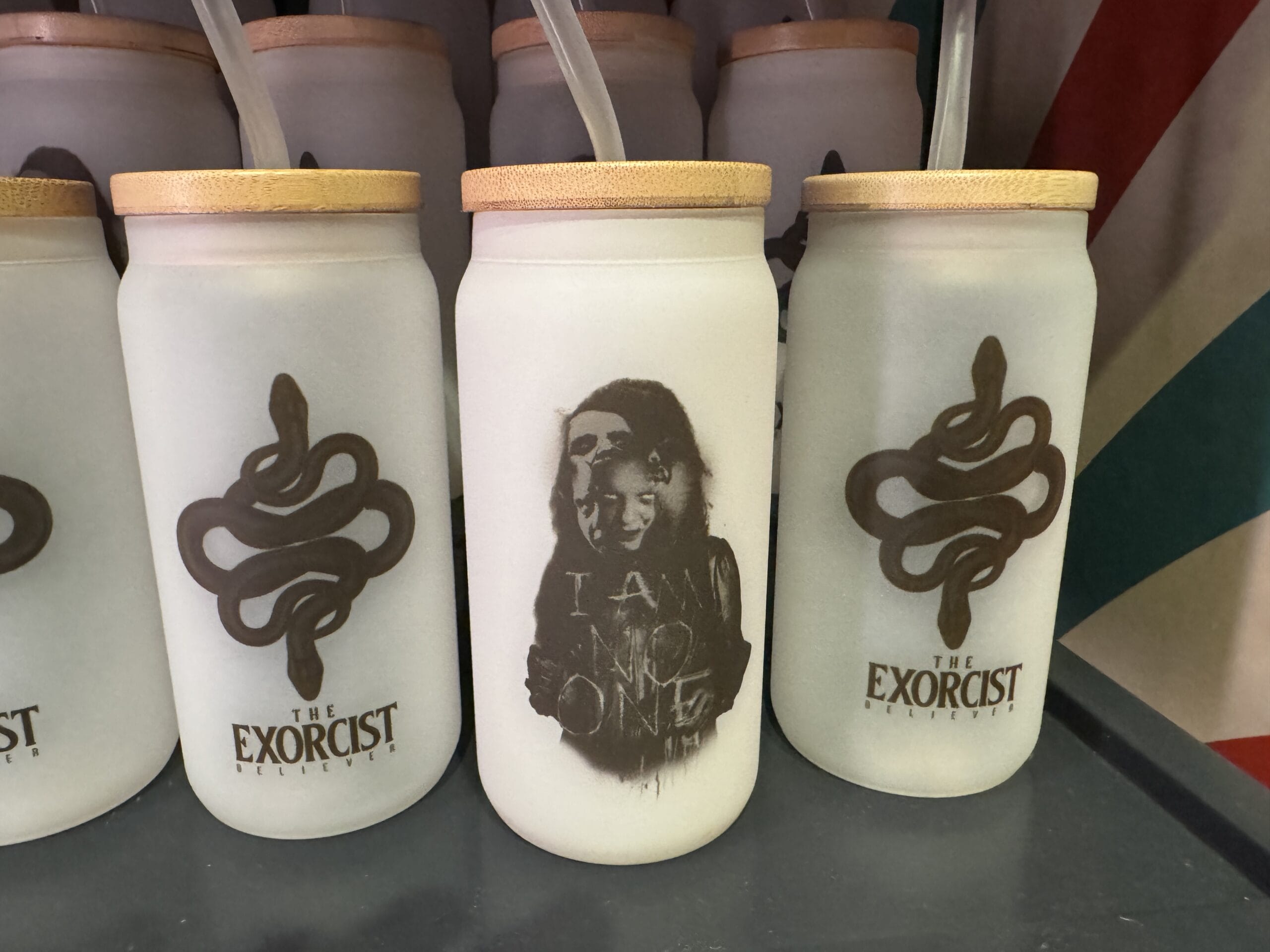 Frosted cups with "The Exorcist" logo are chilling Universal Horror Unleashed merchandise—check prices on each cup.