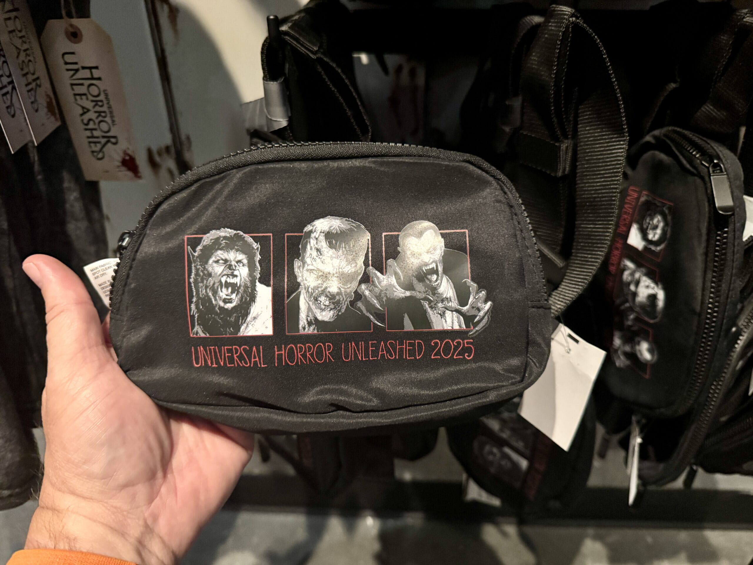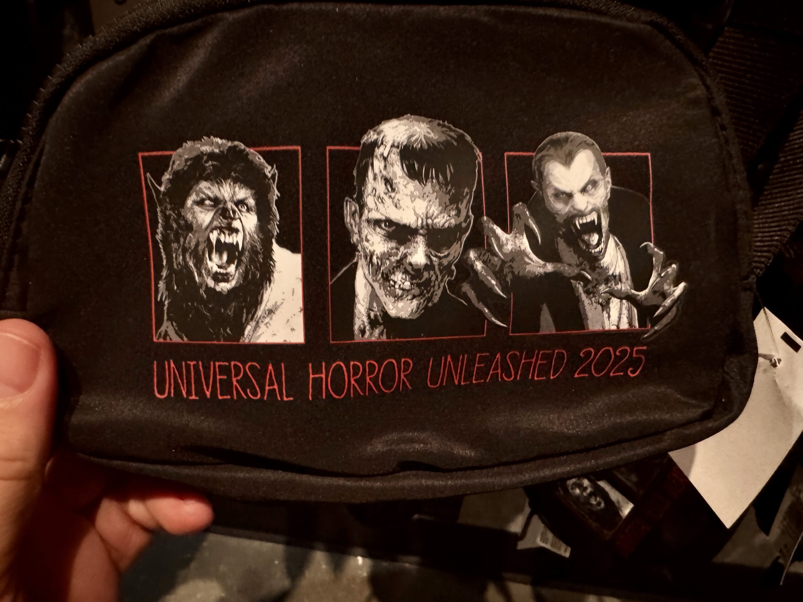 Wolf Man, Frankenstein’s Monster, and Dracula are pictured in black and white on the front of this black bag. They are each framed by a red border. “Universal Horror Unleashed 2025” is written in red below them.