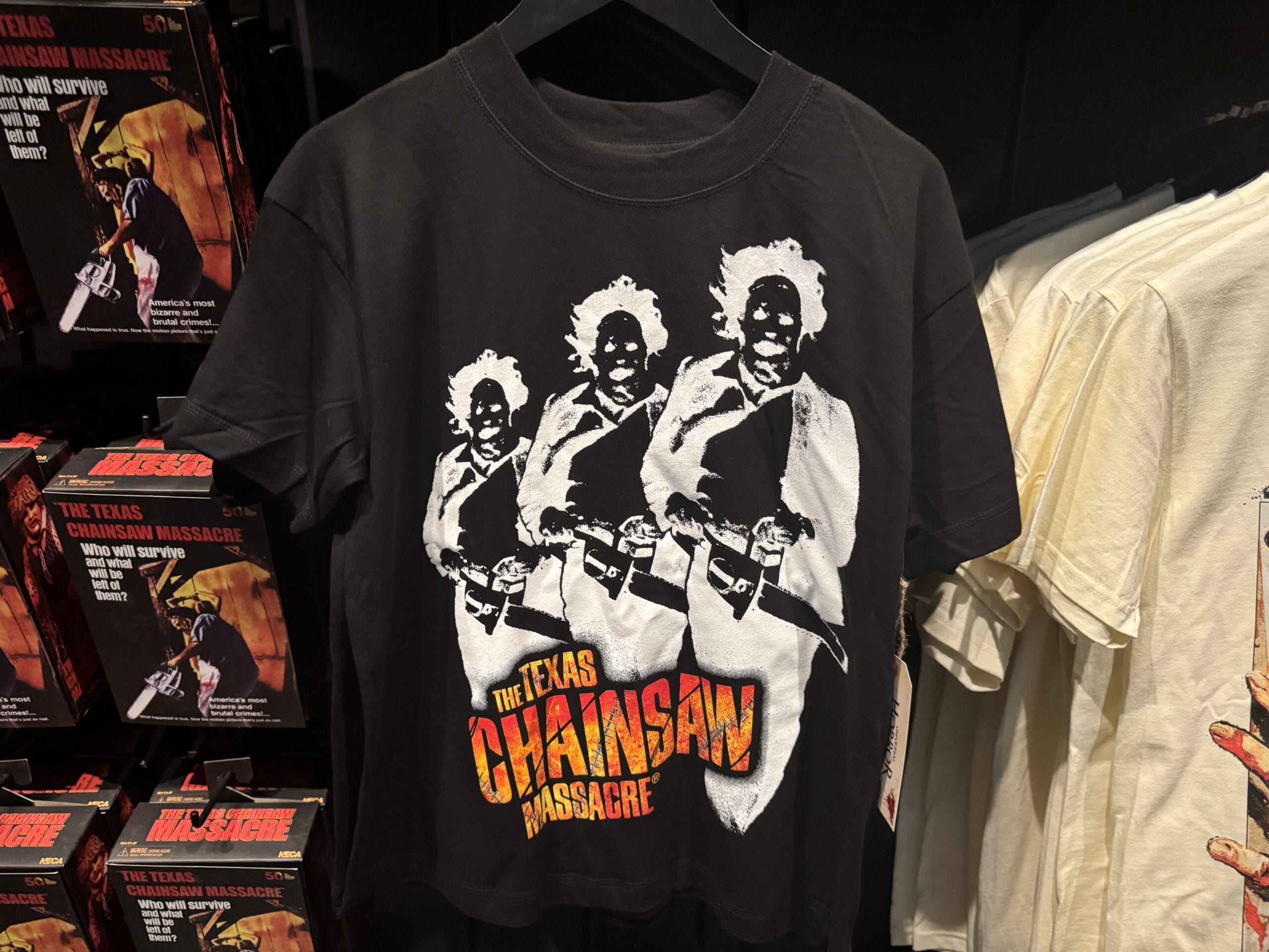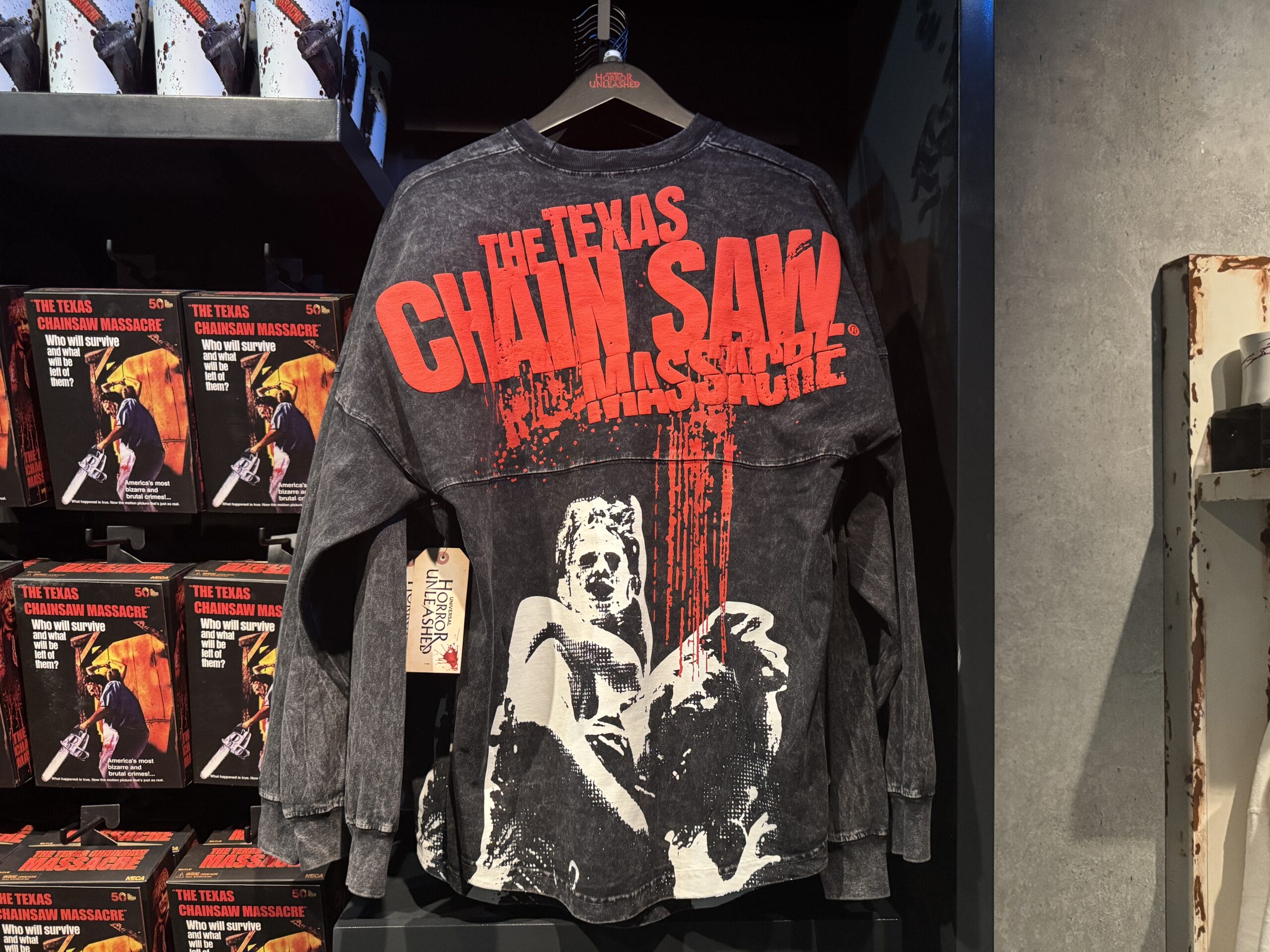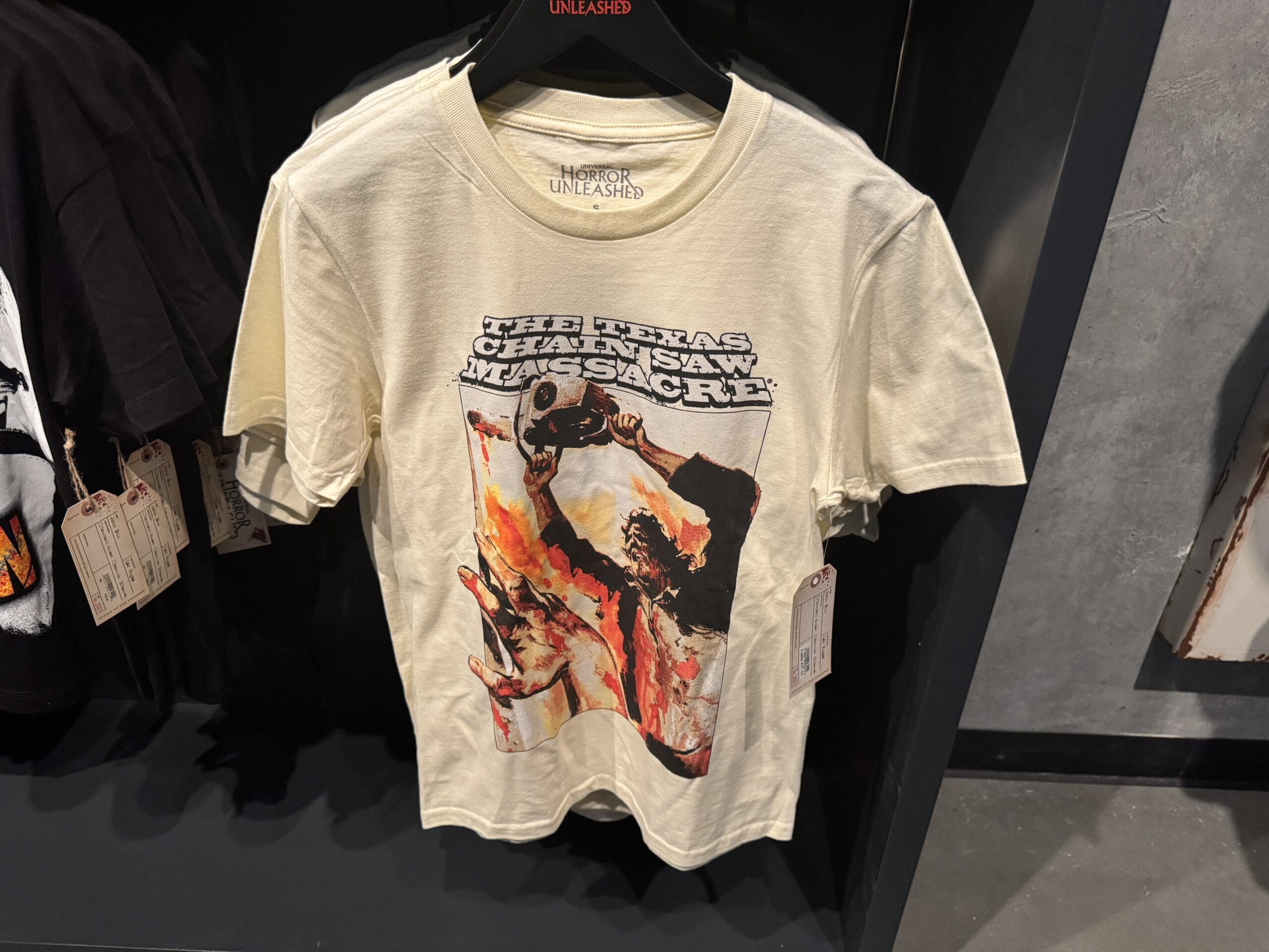 Black "The Texas Chain Saw Massacre" shirt, part of Universal Horror Unleashed merchandise, hangs on a rack in-store.