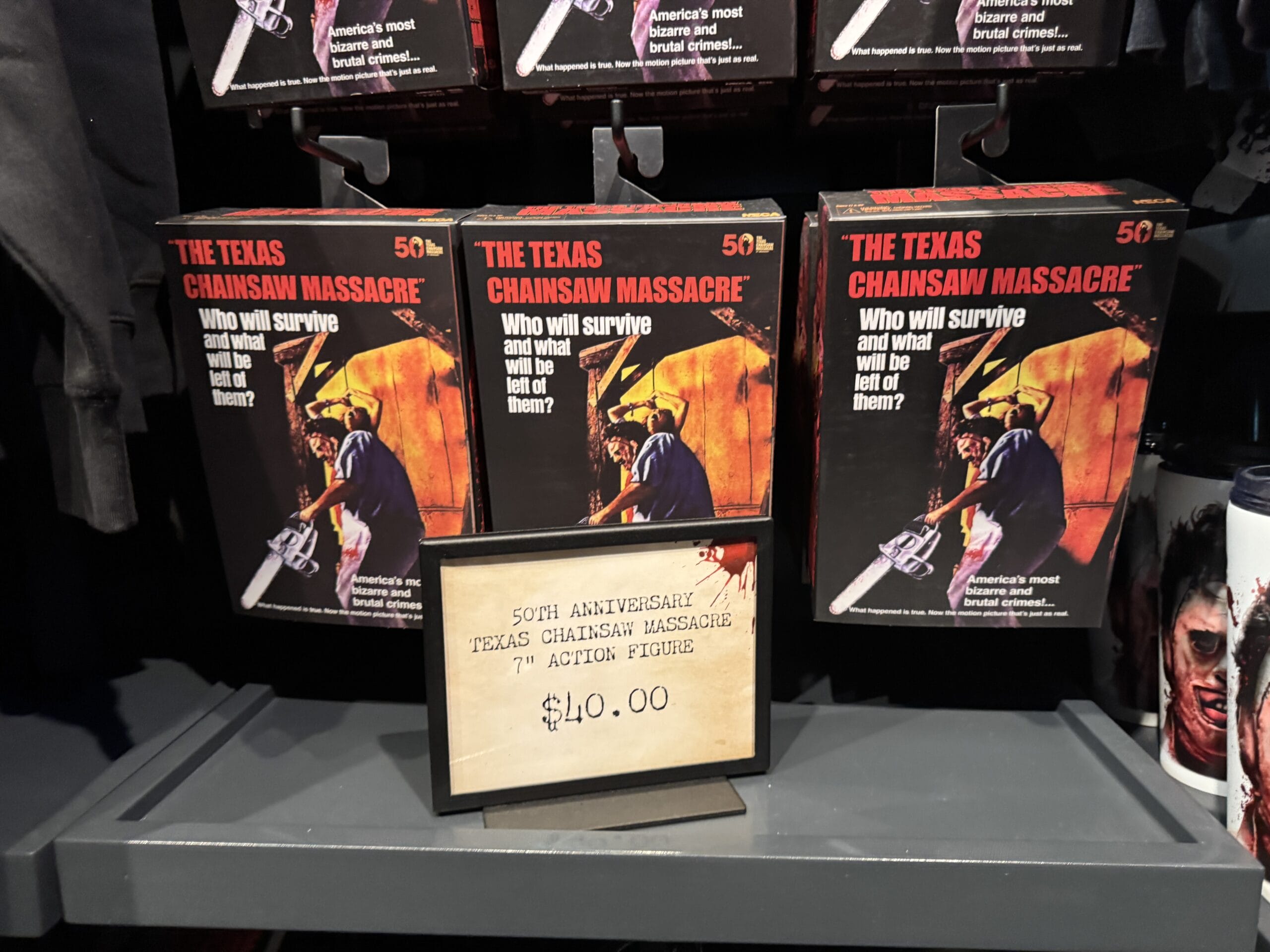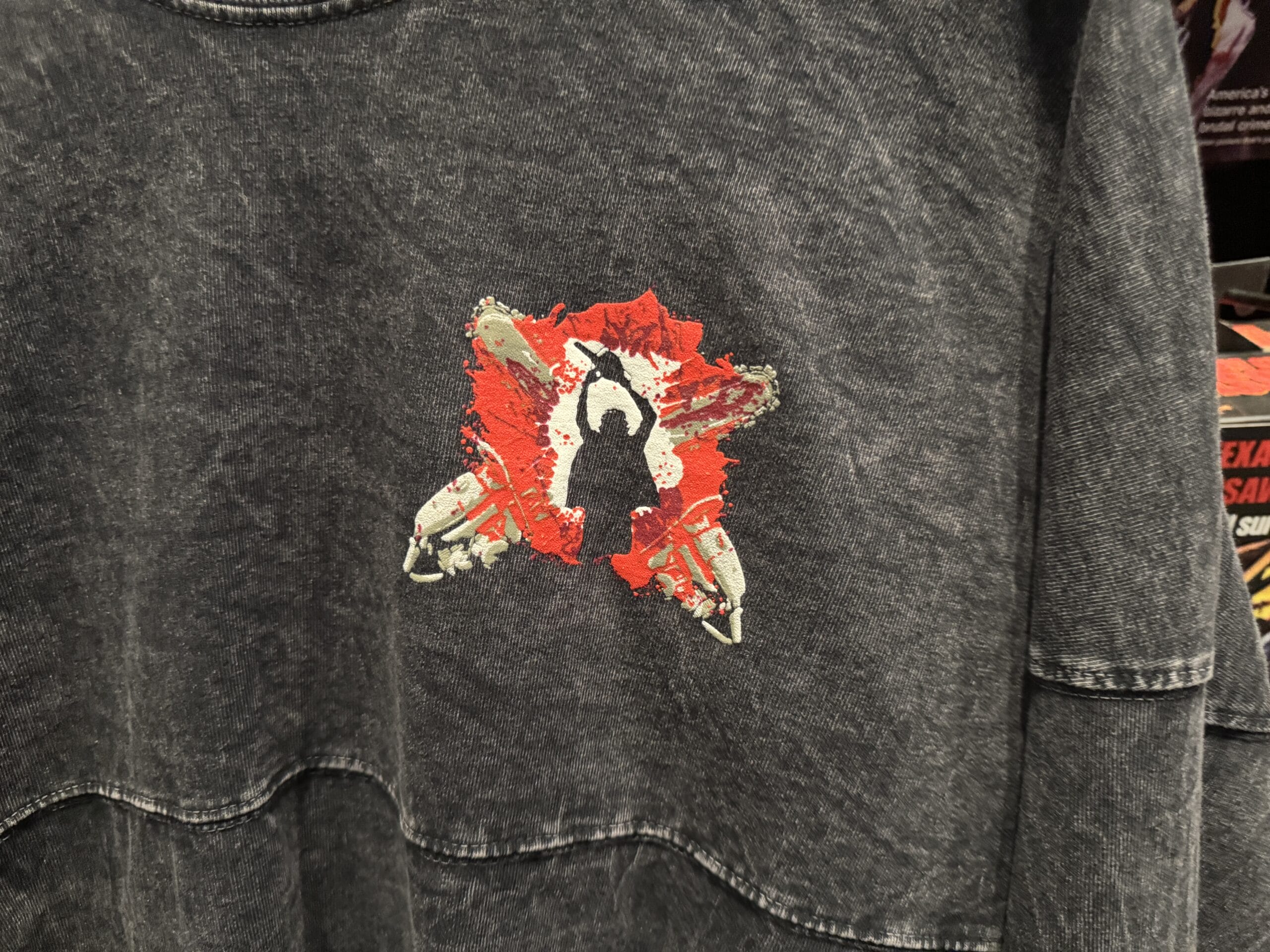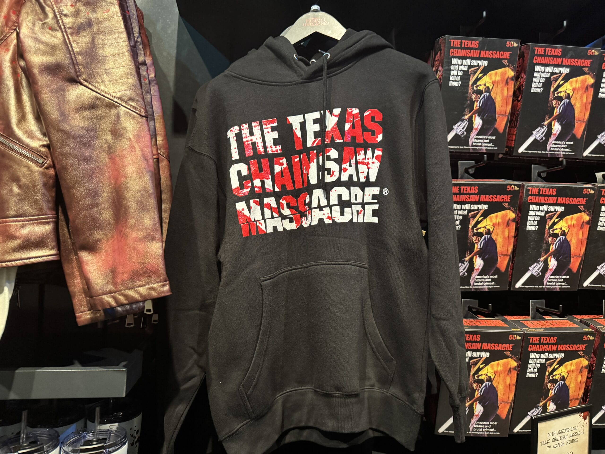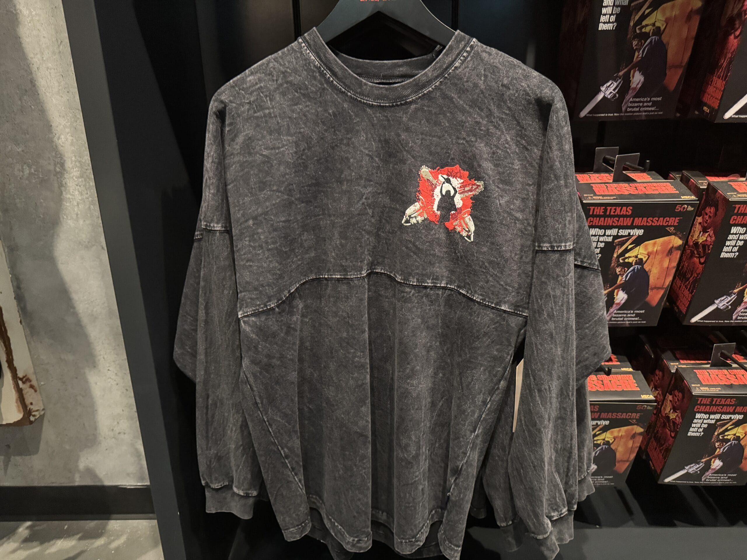 Black "The Texas Chain Saw Massacre" shirt, part of Universal Horror Unleashed merchandise, hangs on a rack in-store.