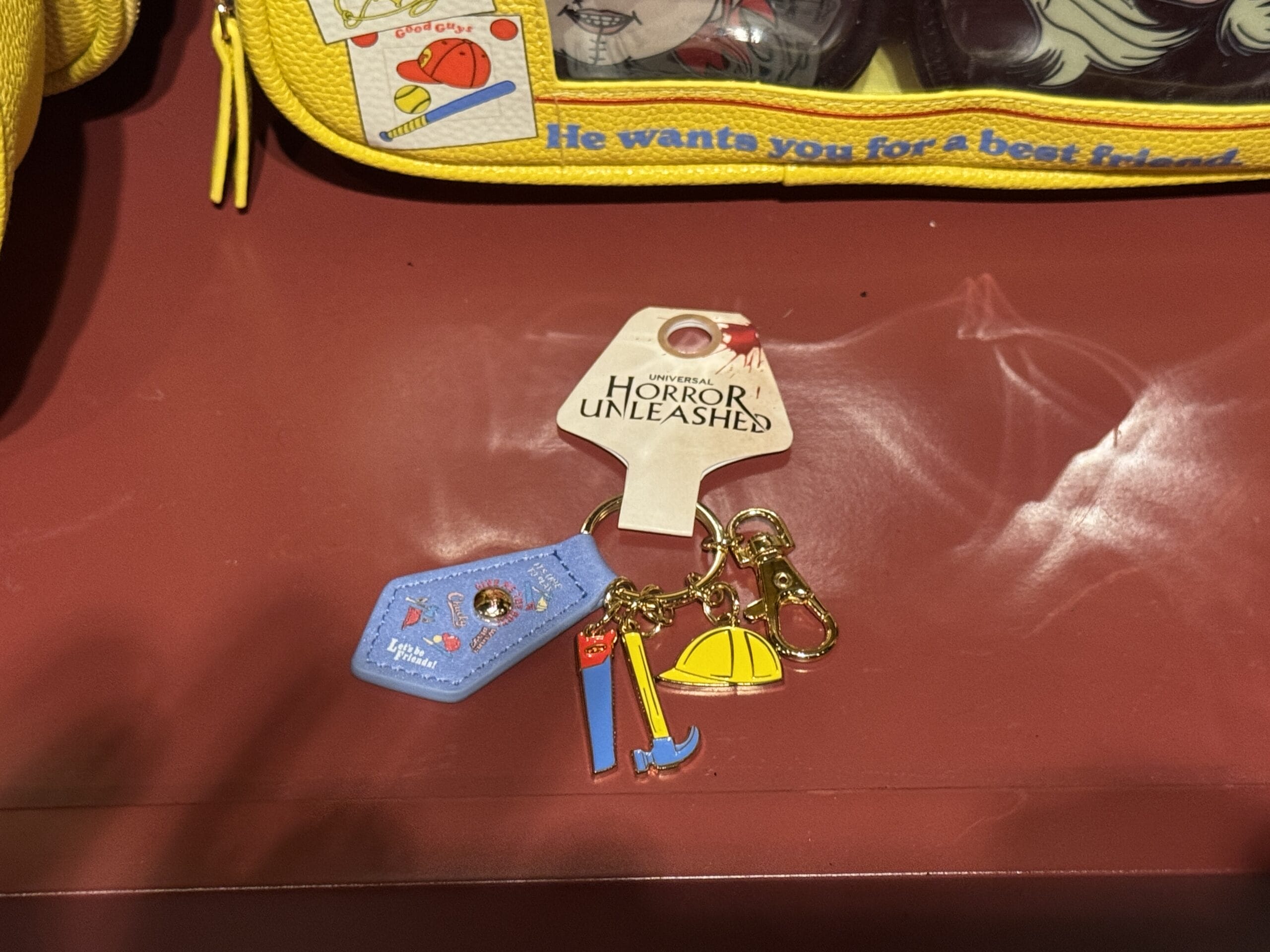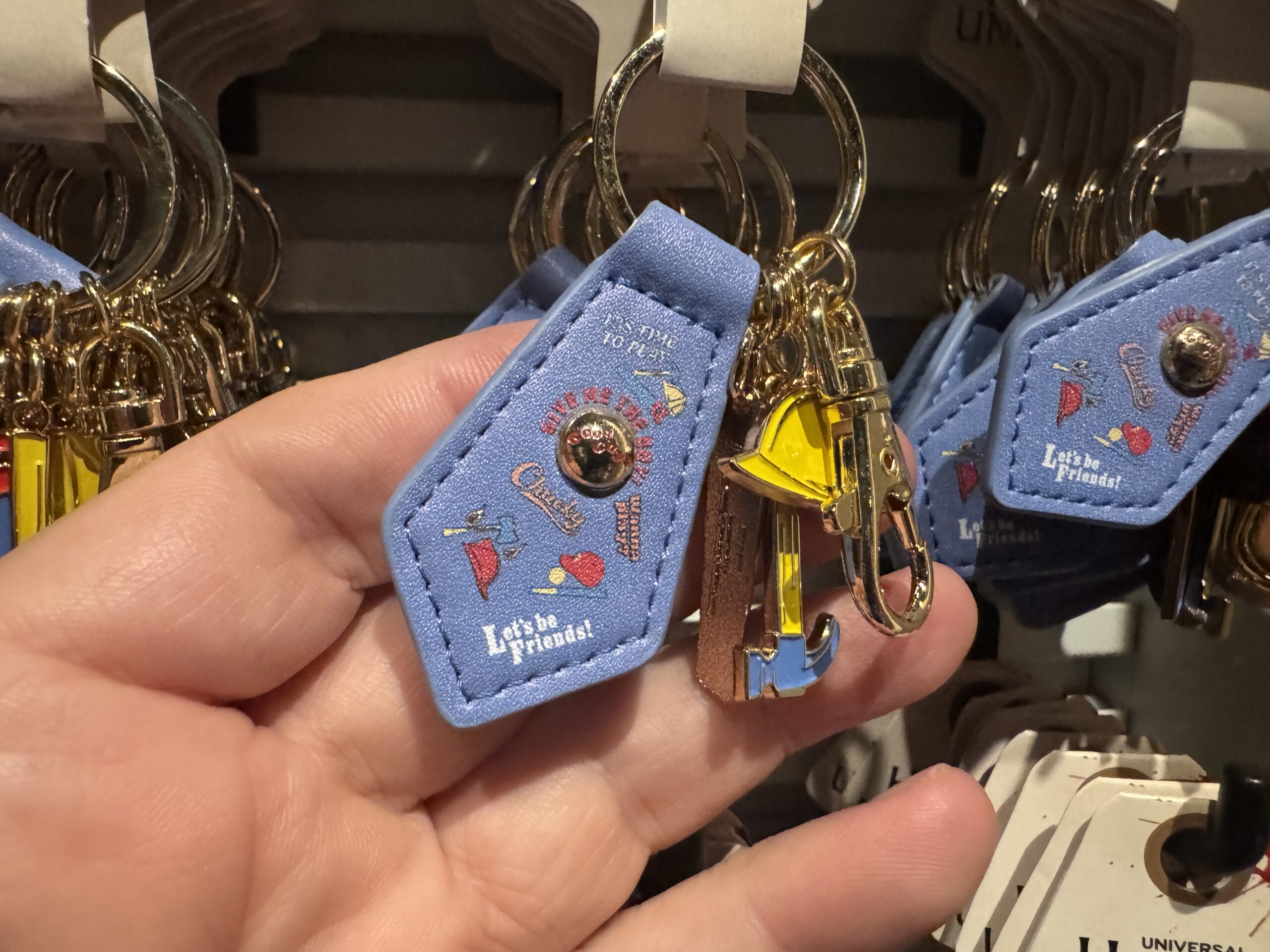The Chucky keychain has a larger blue leather charm and several smaller “tool” charms attached to a golden key ring and clasp.