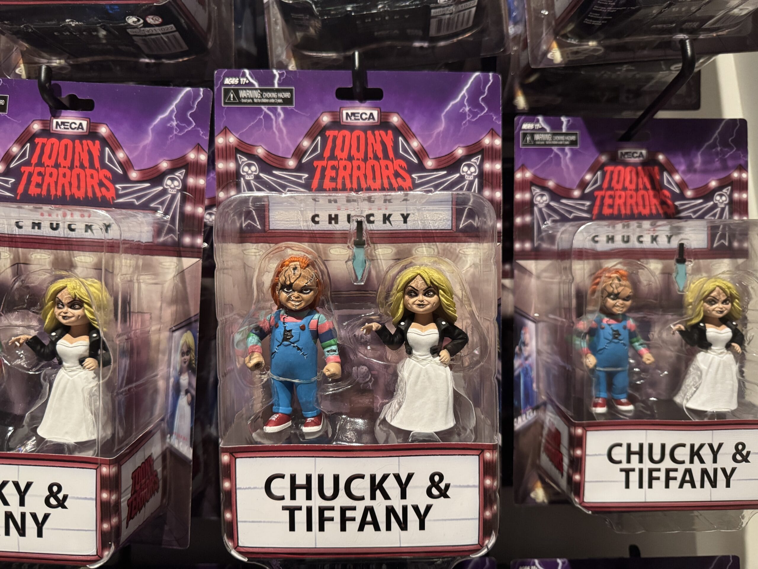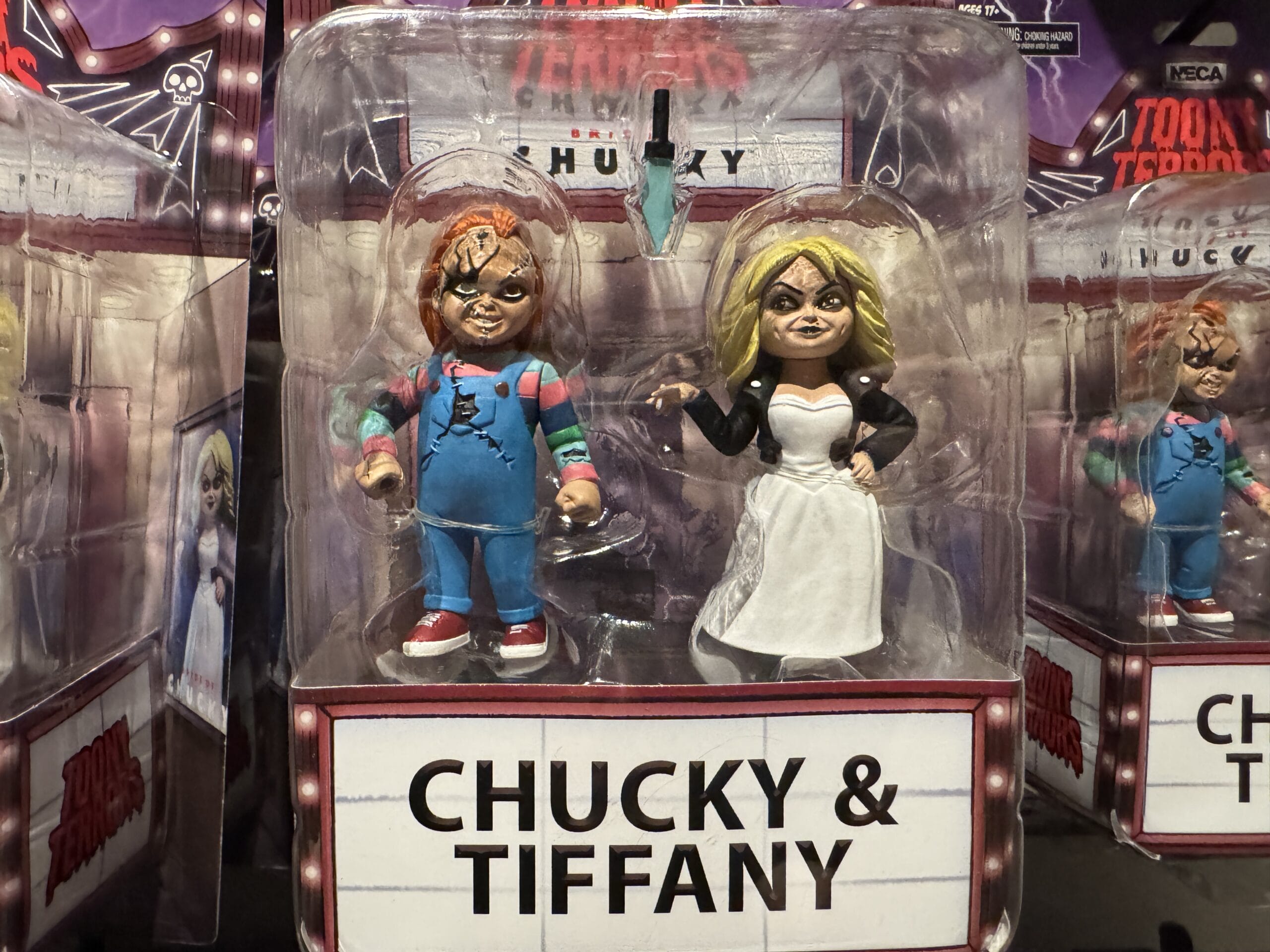 Lastly, there is a Chucky and Tiffany figure set. The two characters stand side by side wearing their classic outfits above a “Chucky & Tiffany” cinema sign.