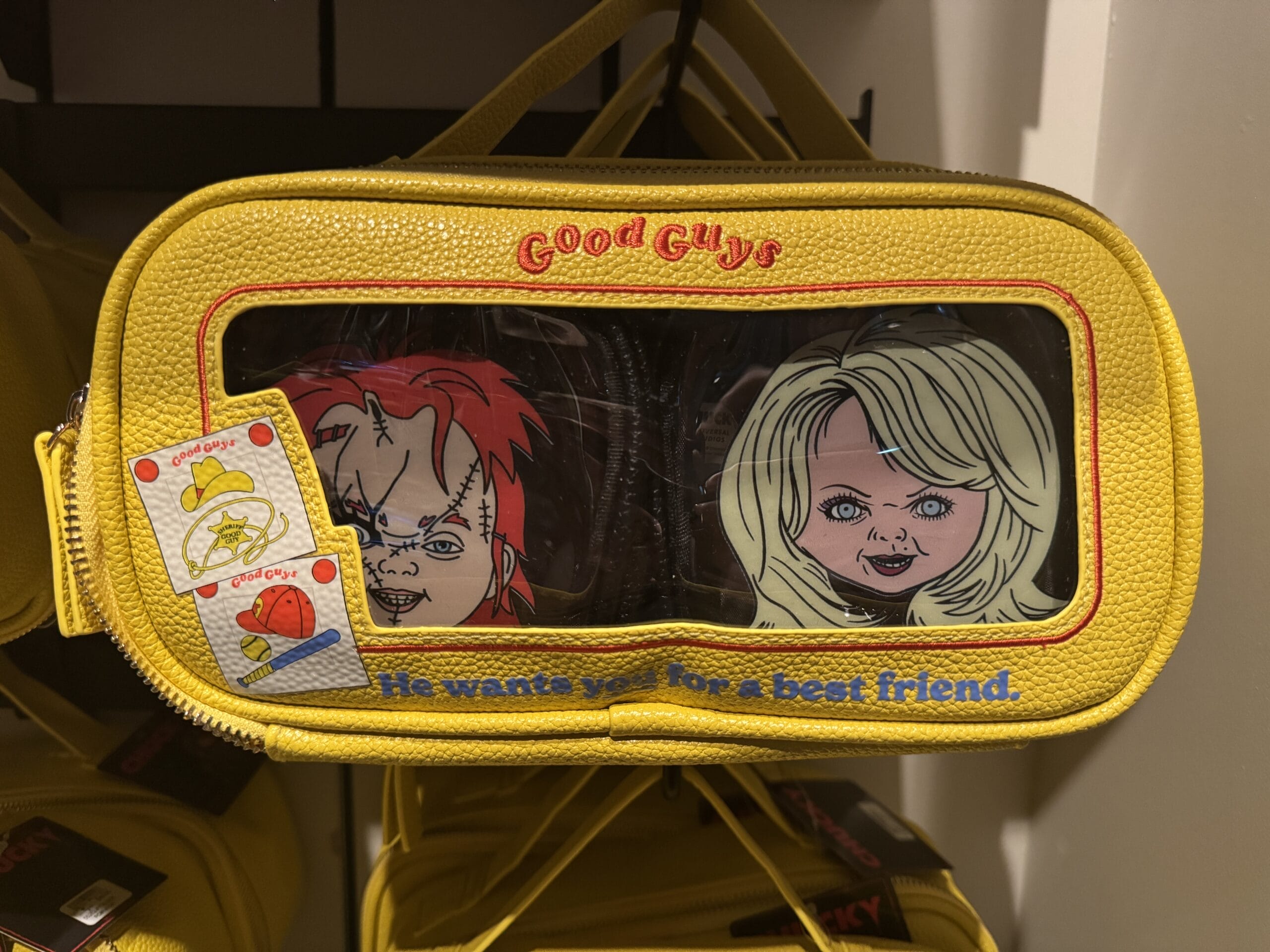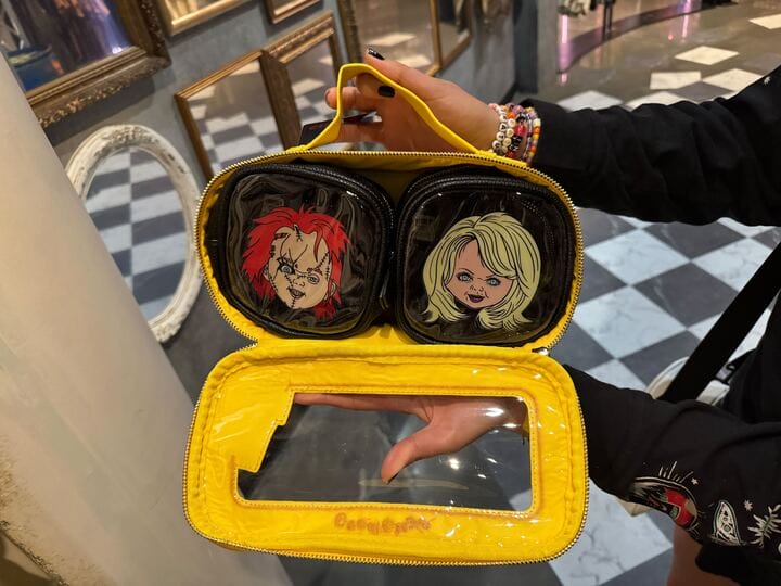 The yellow “Good Guys” bag has one larger compartment, and two smaller black cases inside feature Chucky and Tiffany.