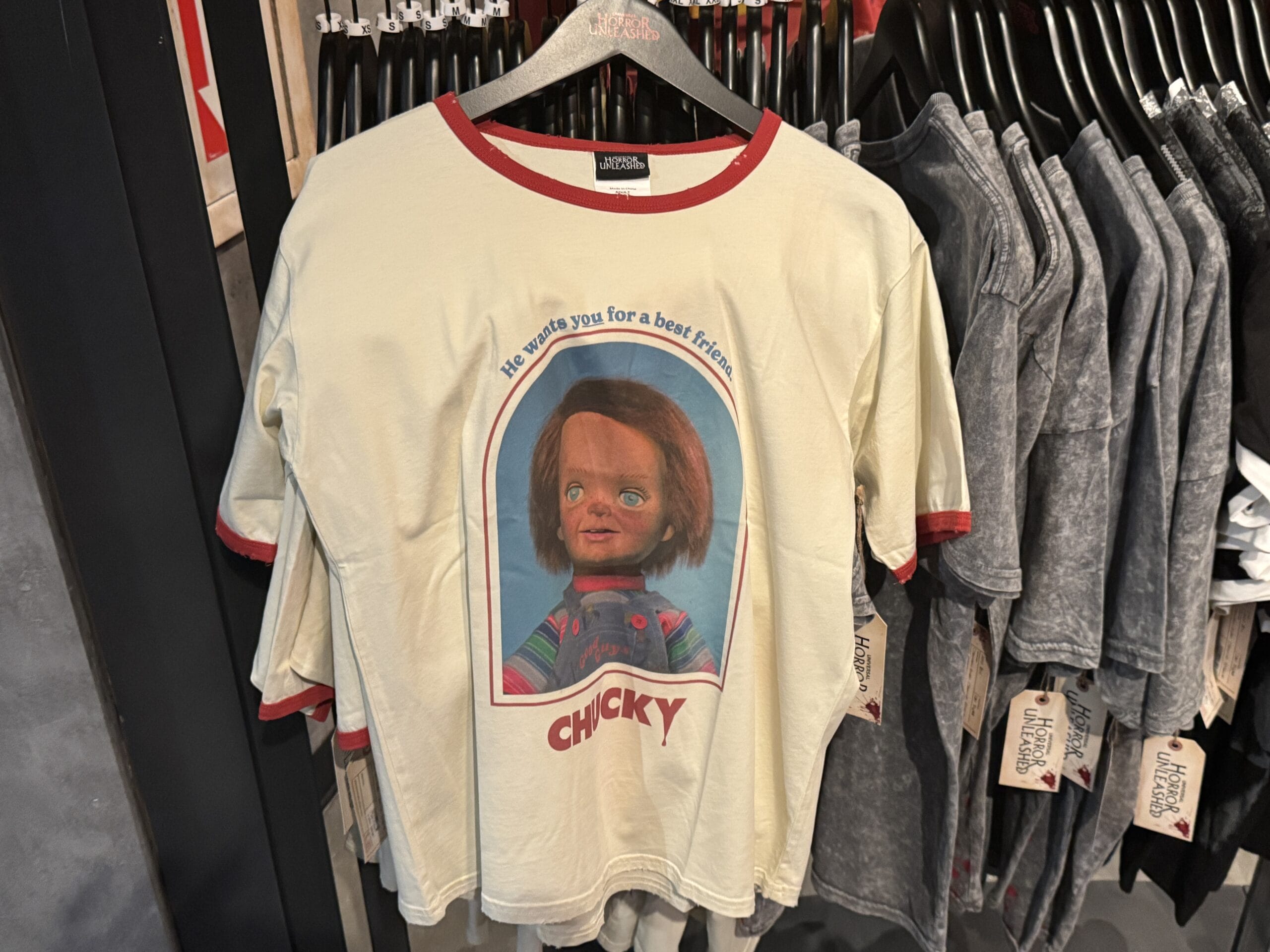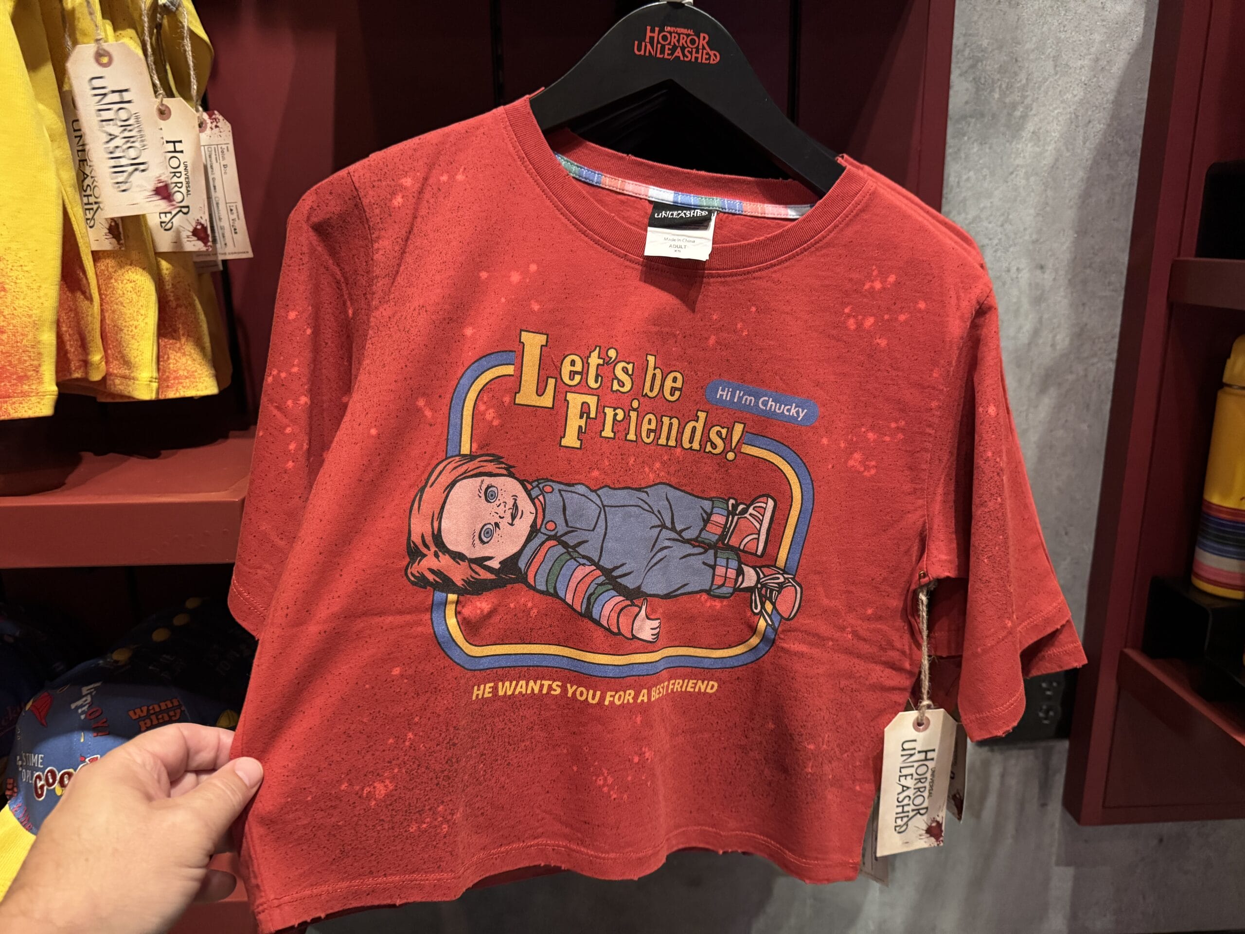 Red T-shirt with cartoon Chucky: "Let's be Friends!" A Universal Horror Unleashed merchandise, displayed in-store.