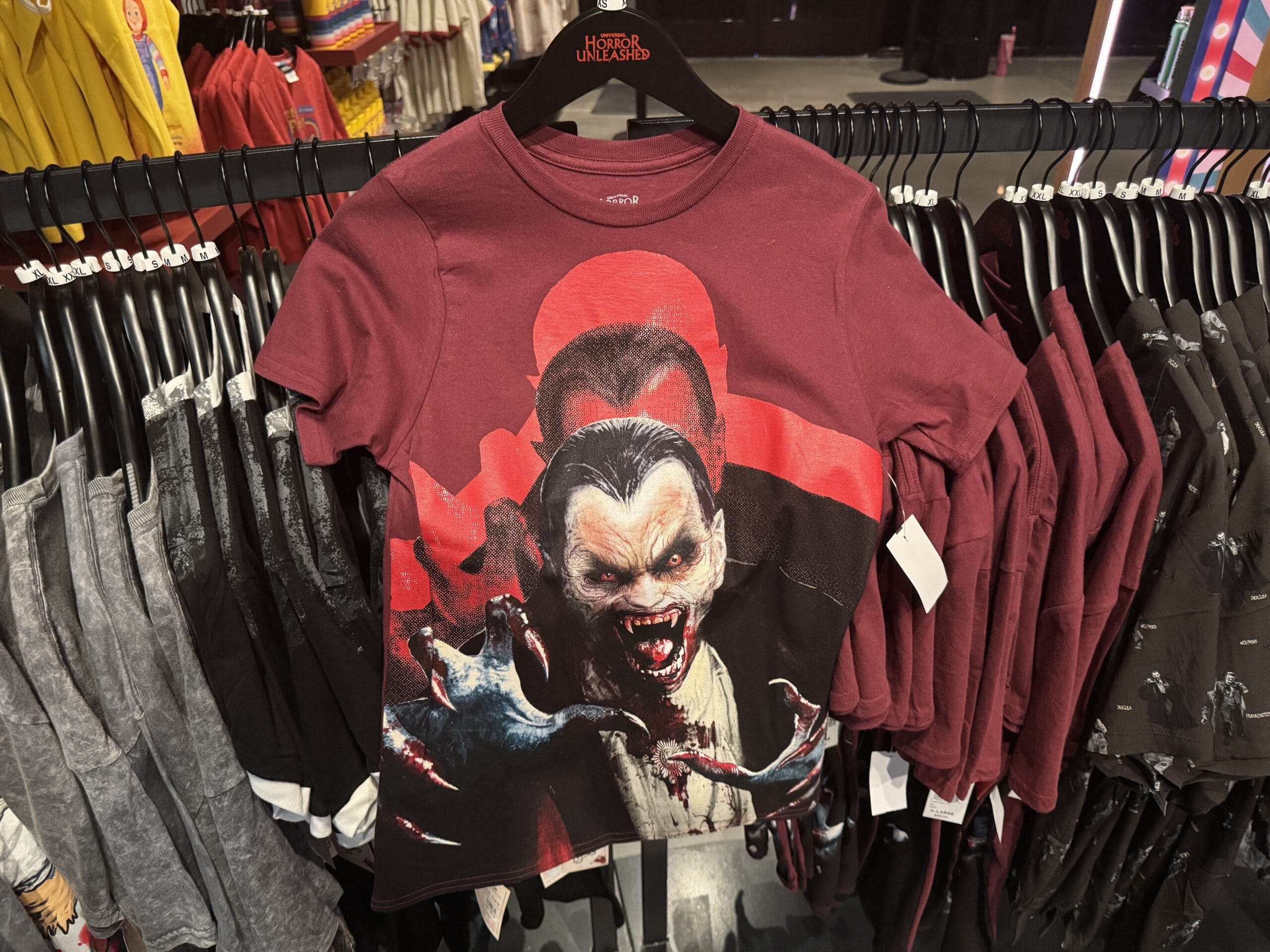 A maroon T-shirt from Universal Horror Unleashed merchandise, with a snarling vampire graphic, displayed at Hot Topic.