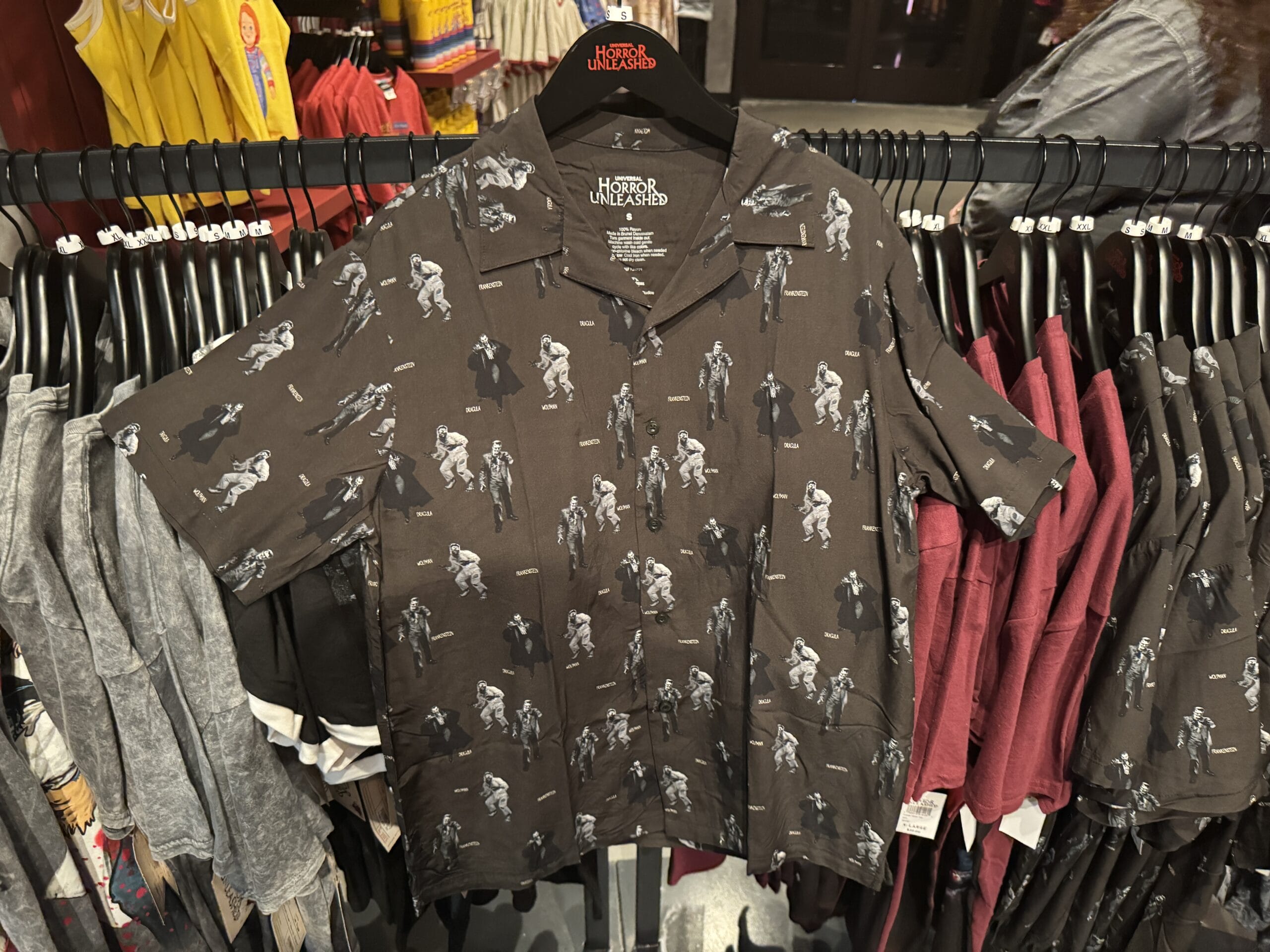Black button-up shirt with a white zombie pattern, part of Universal Horror Unleashed merchandise, hangs among other shirts.