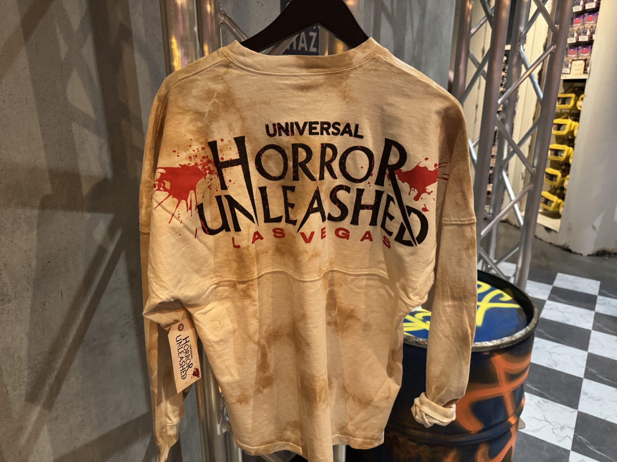The Spirit Jersey is off-white with brown splotches — like dried blood. Red splotches are pictured on the left chest around the Universal Horror Unleashed wordmark in black. A larger version of the wordmark is printed on the back in puffy ink. The back also says “Las Vegas” in red.