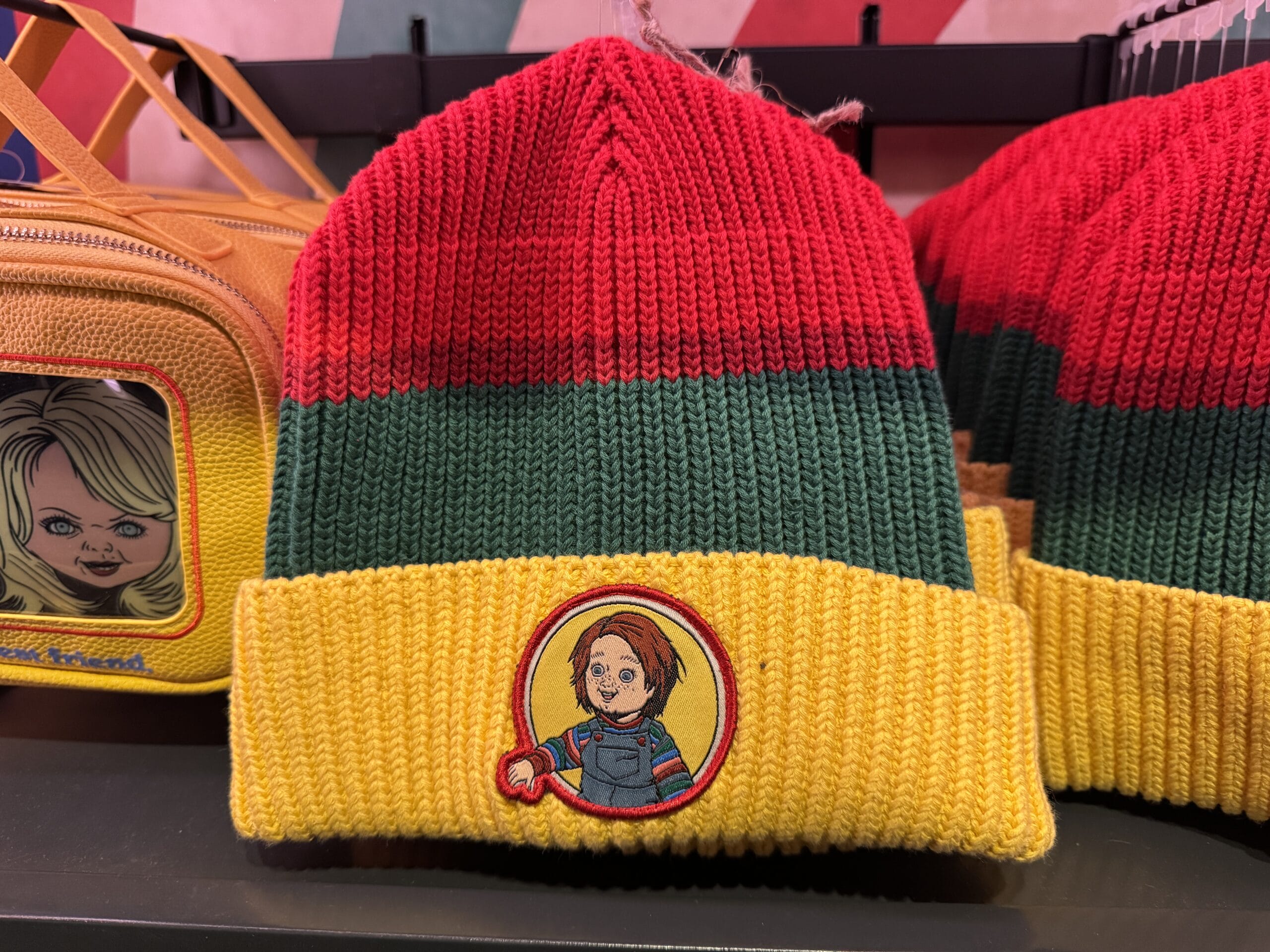 A red, green, and yellow beanie featuring a doll patch—part of the Universal Horror Unleashed merchandise collection.