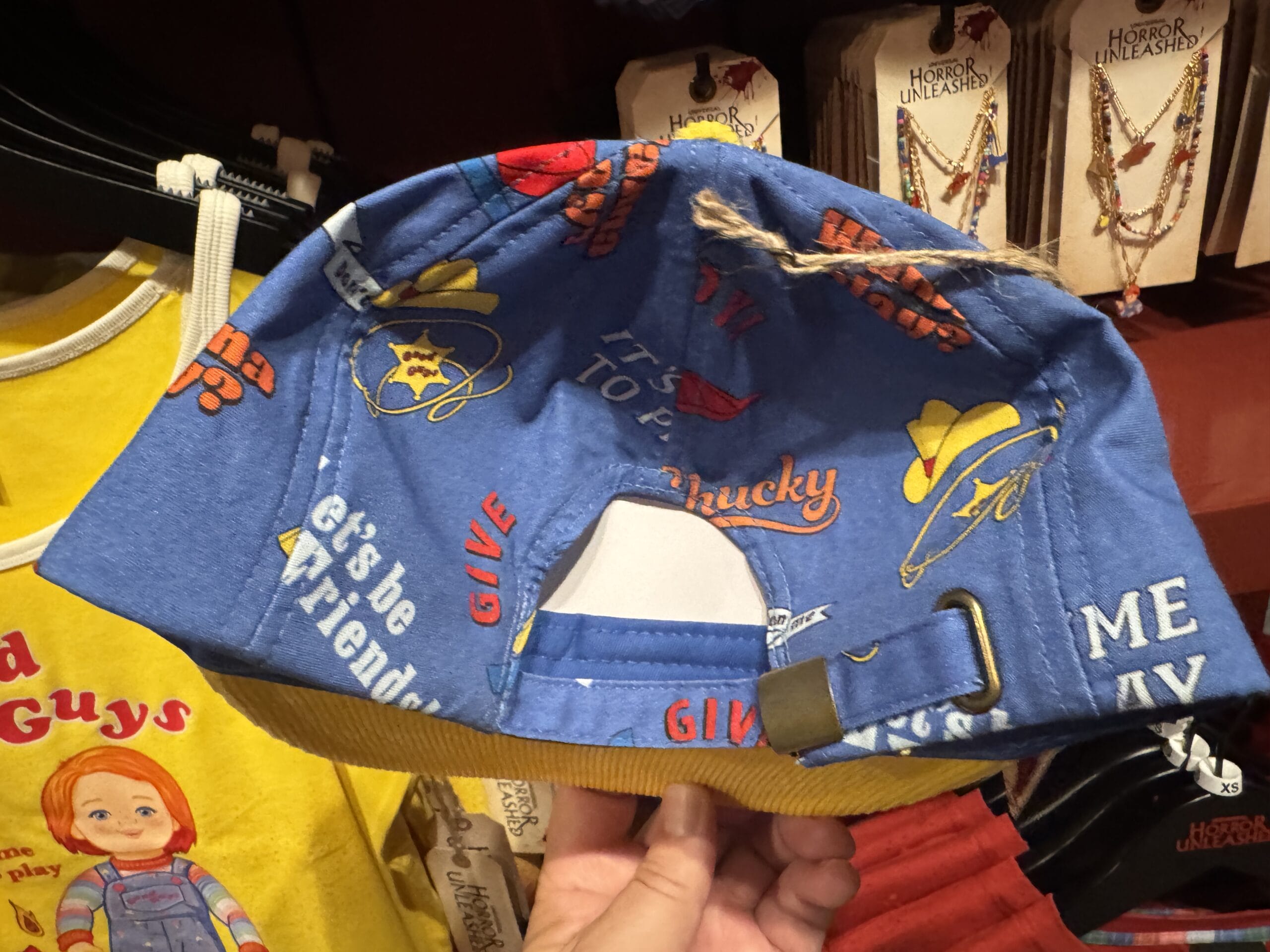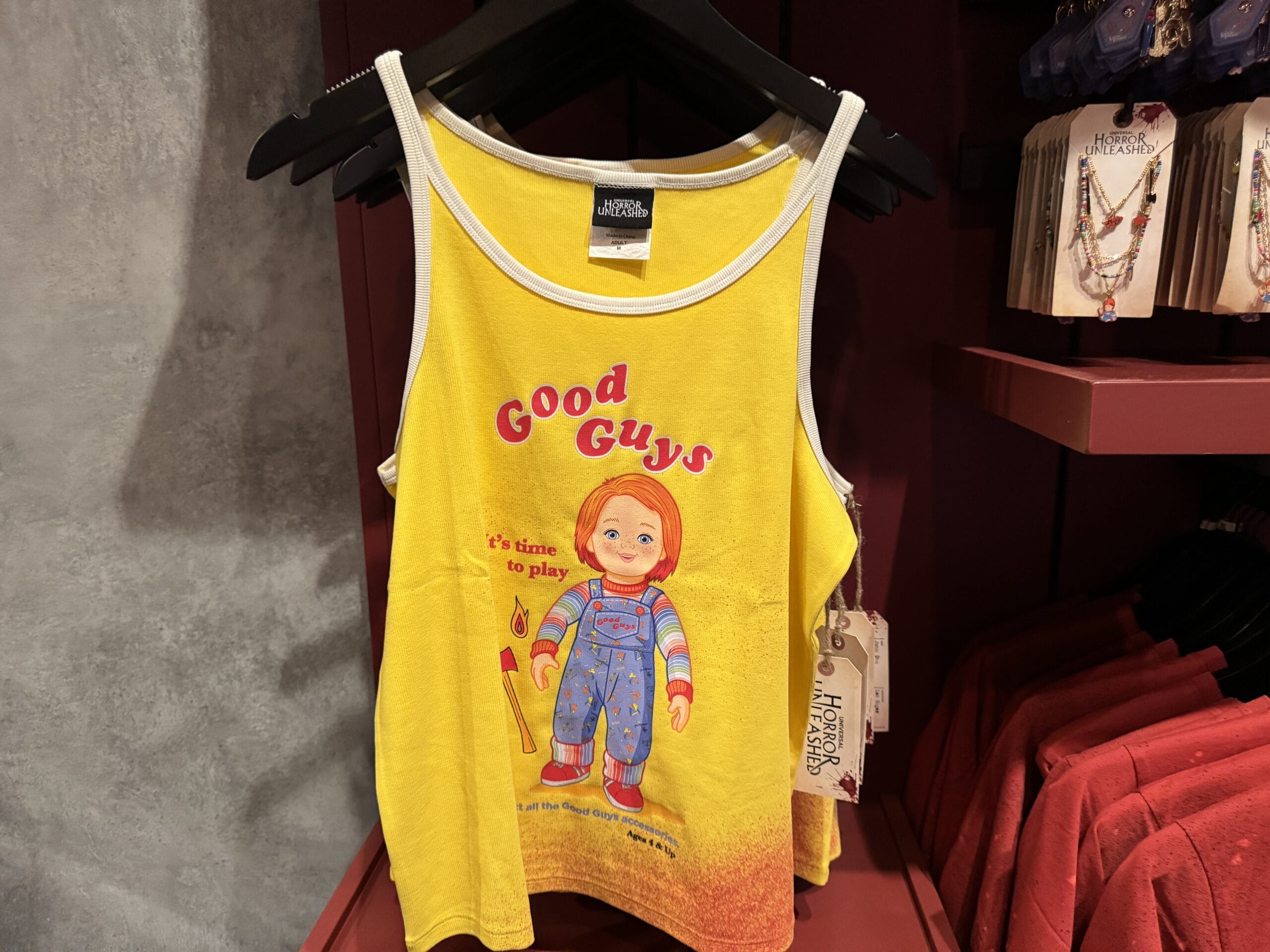 A yellow tank top with a "Good Guys" doll graphic, part of Universal Horror Unleashed merchandise, on display in store.