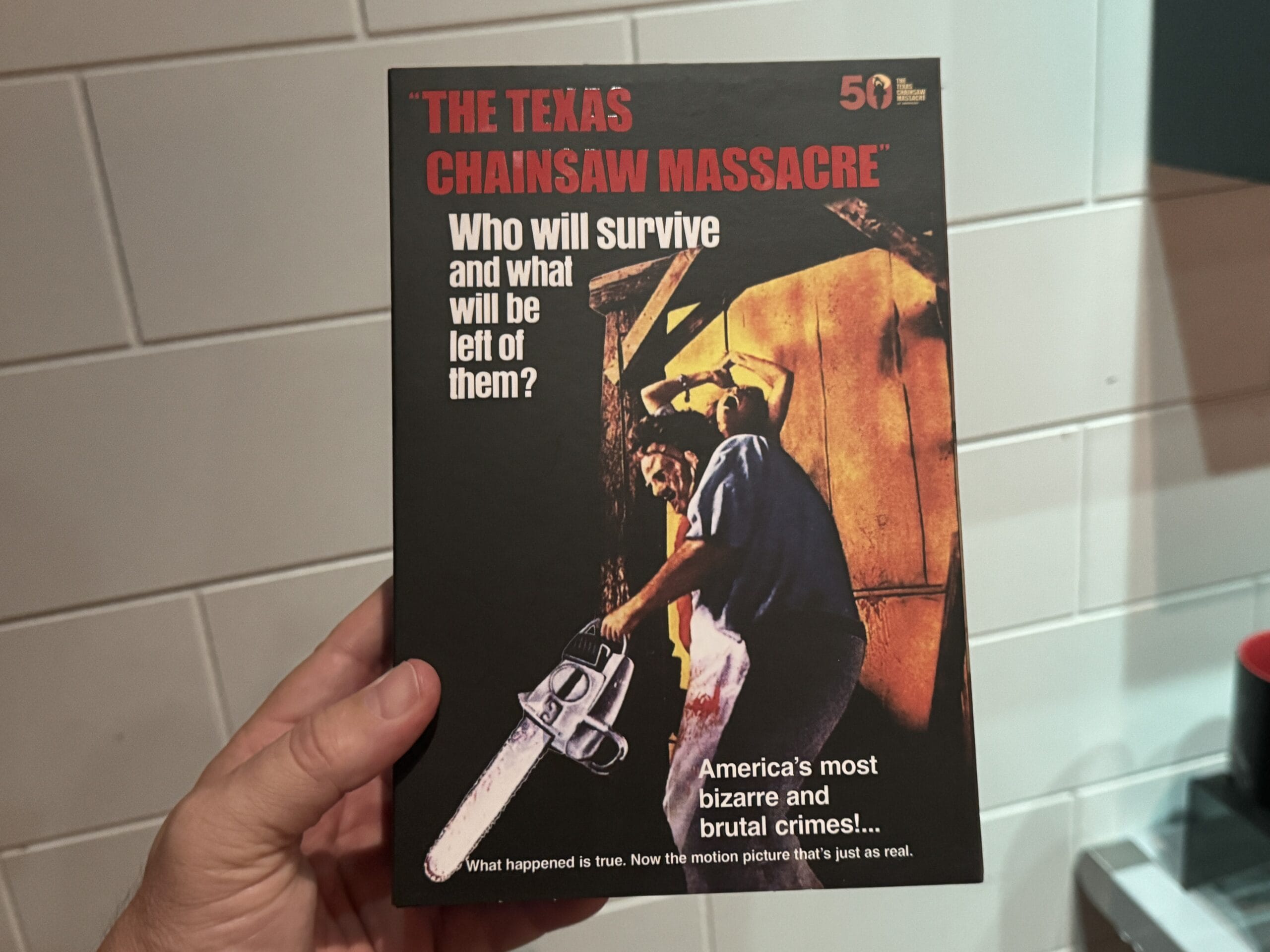 “The Texas Chain Saw Massacre” is written in red dripping letters on the back, above an image of Leatherface and one of his victims.