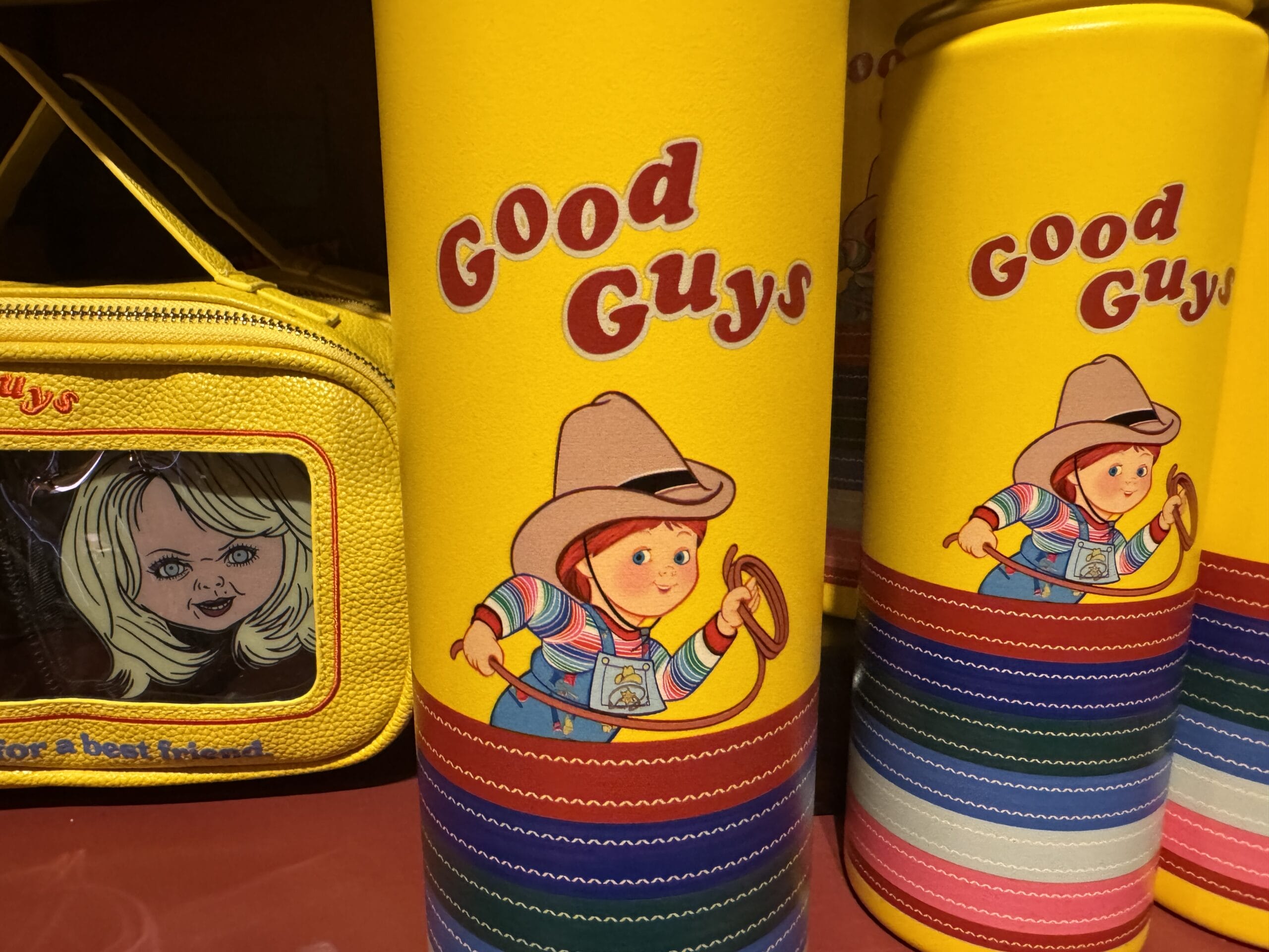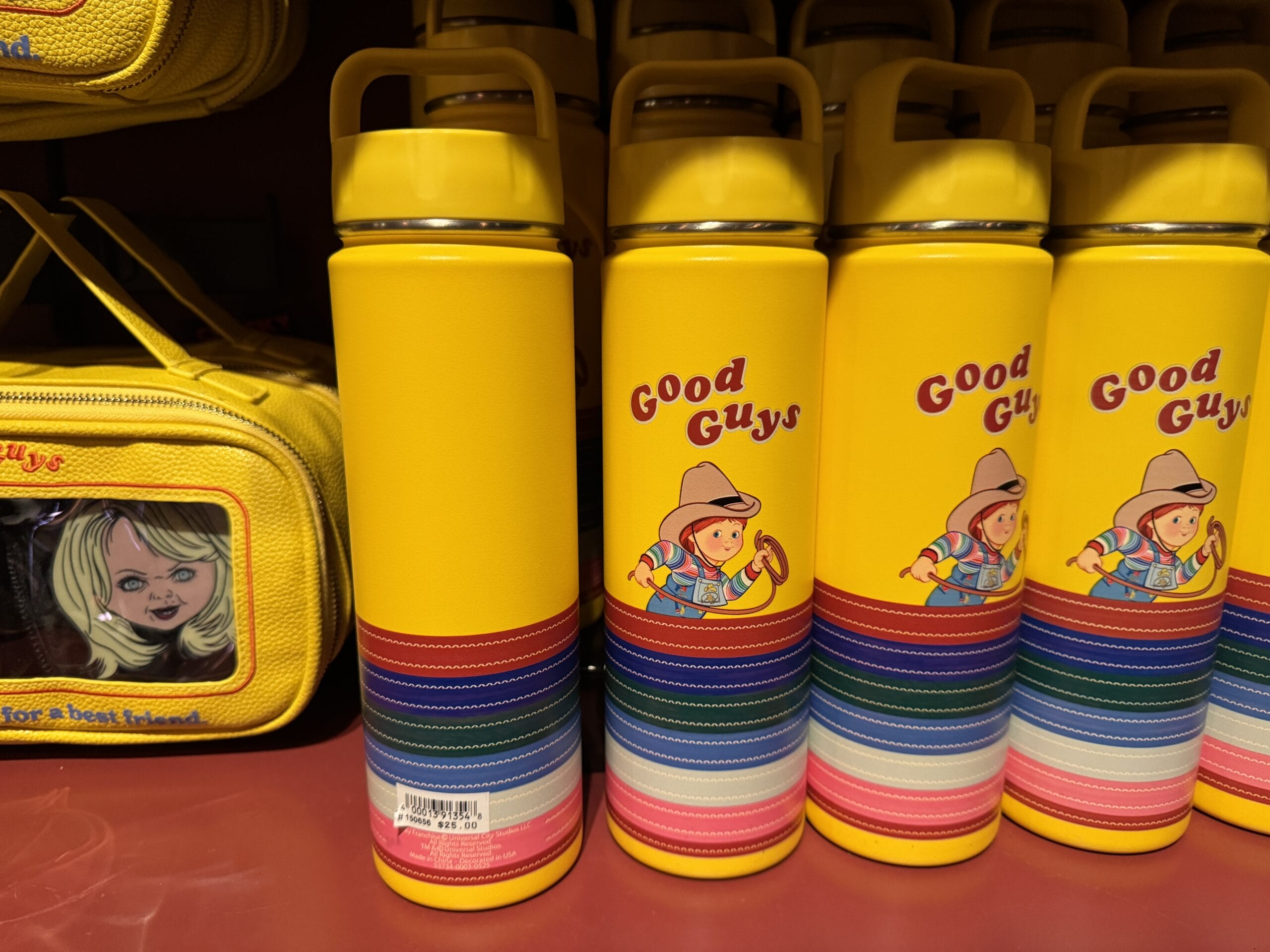 There is also a yellow “Good Guys” water bottle with twist-on lid and striped bottom. Cowboy Chucky looks to be running above the stripes.