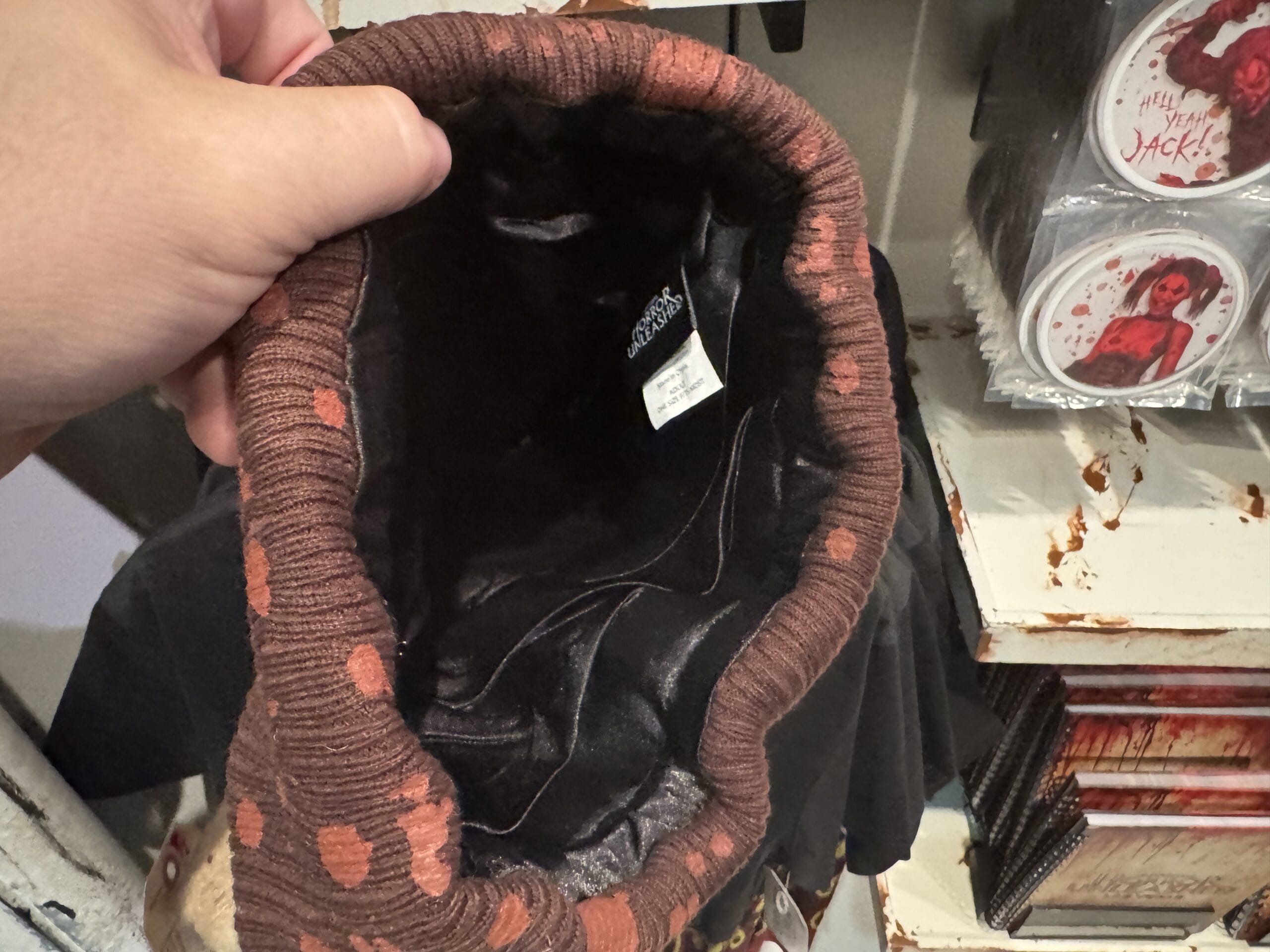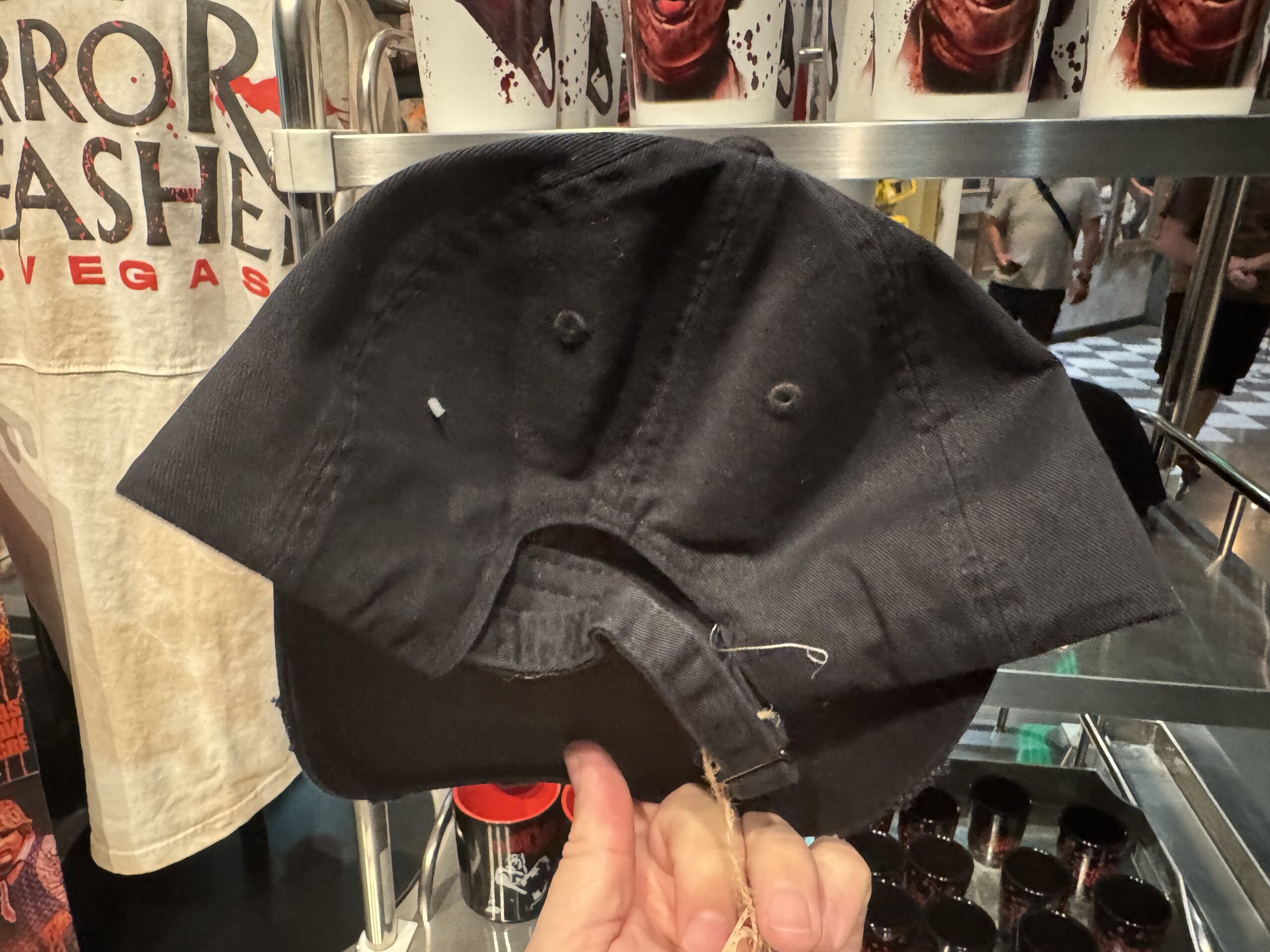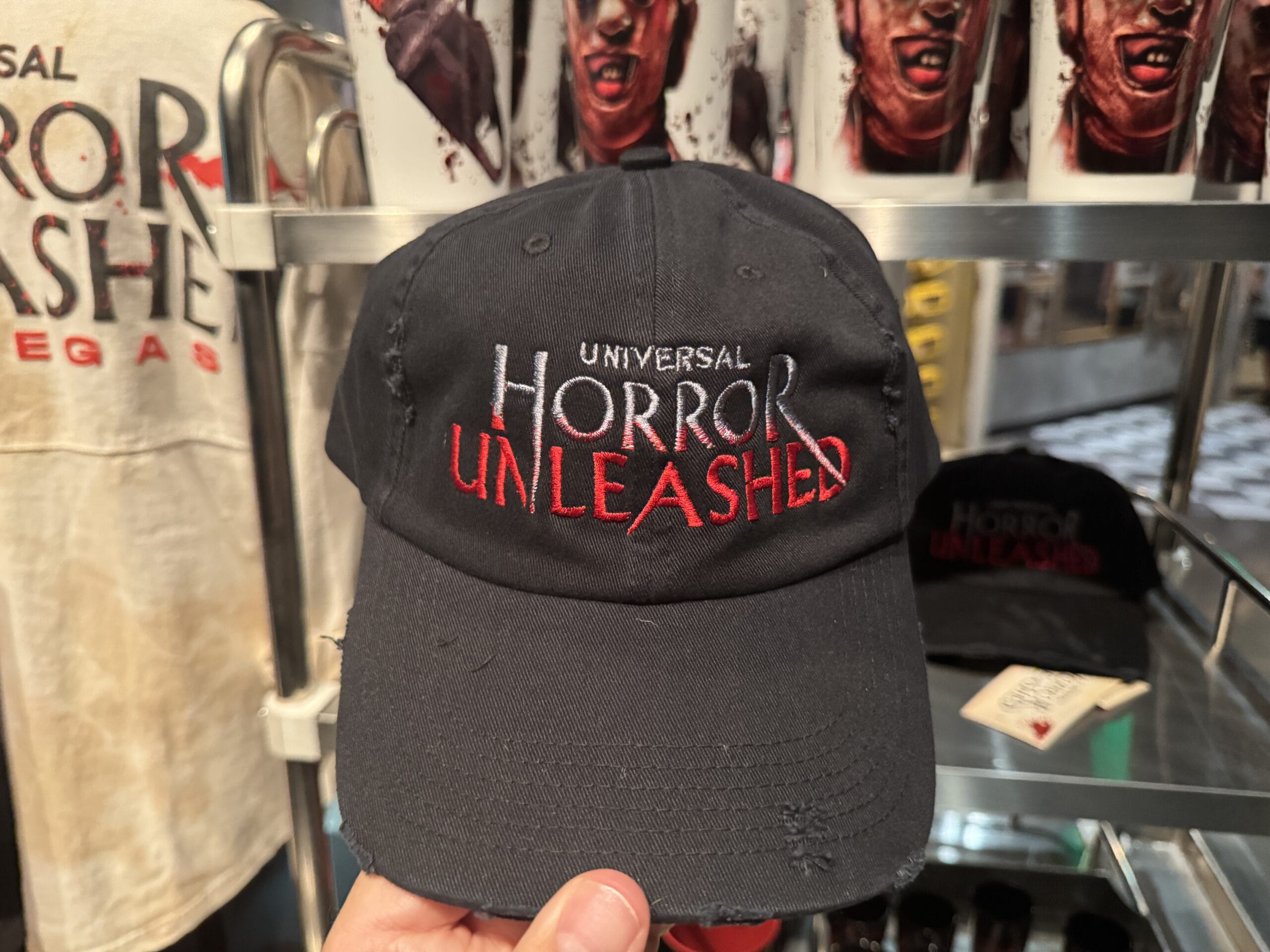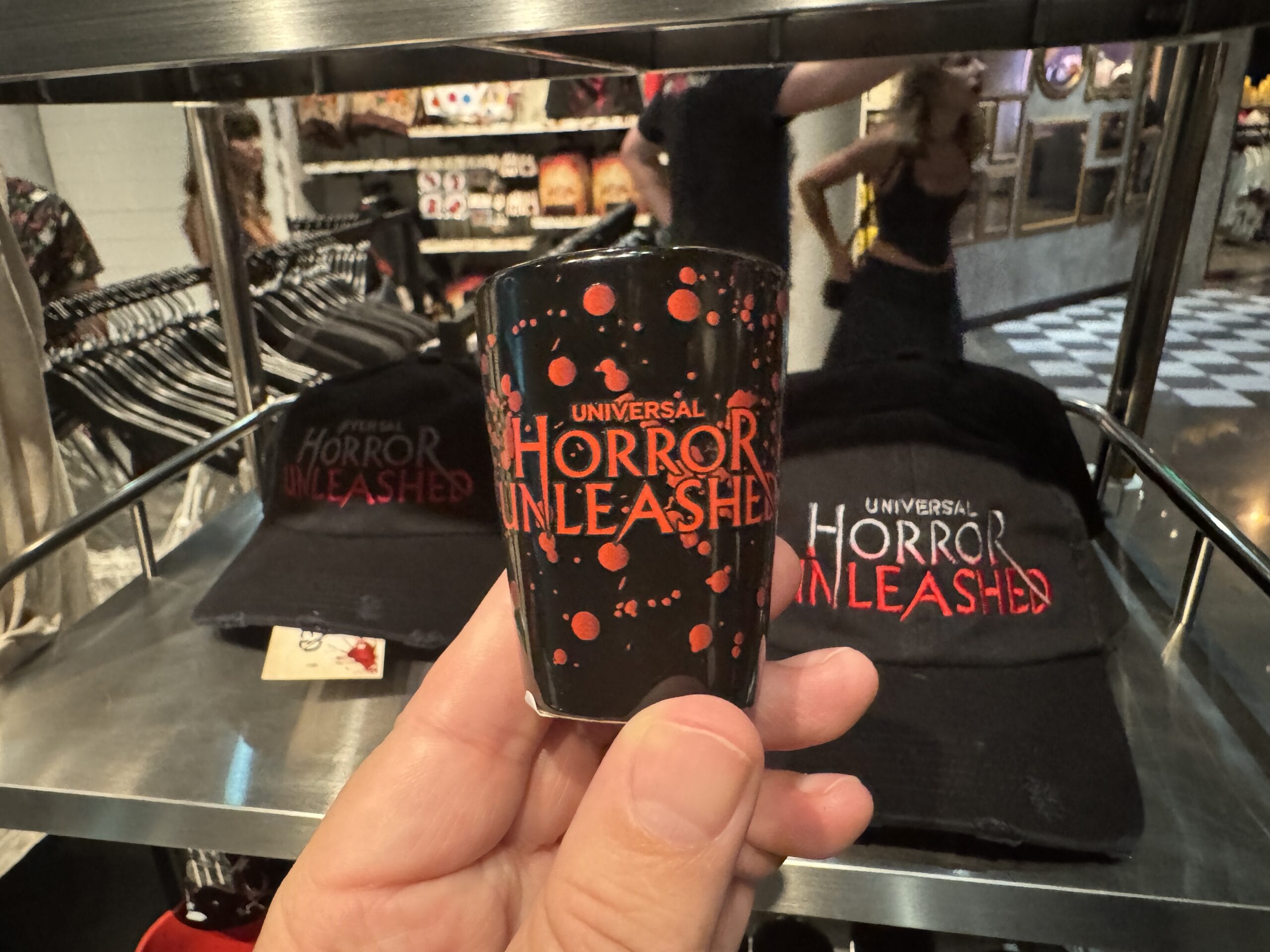 A hand holds a "Horror Unleashed" shot glass in front of Universal Horror Unleashed merchandise hats on display.