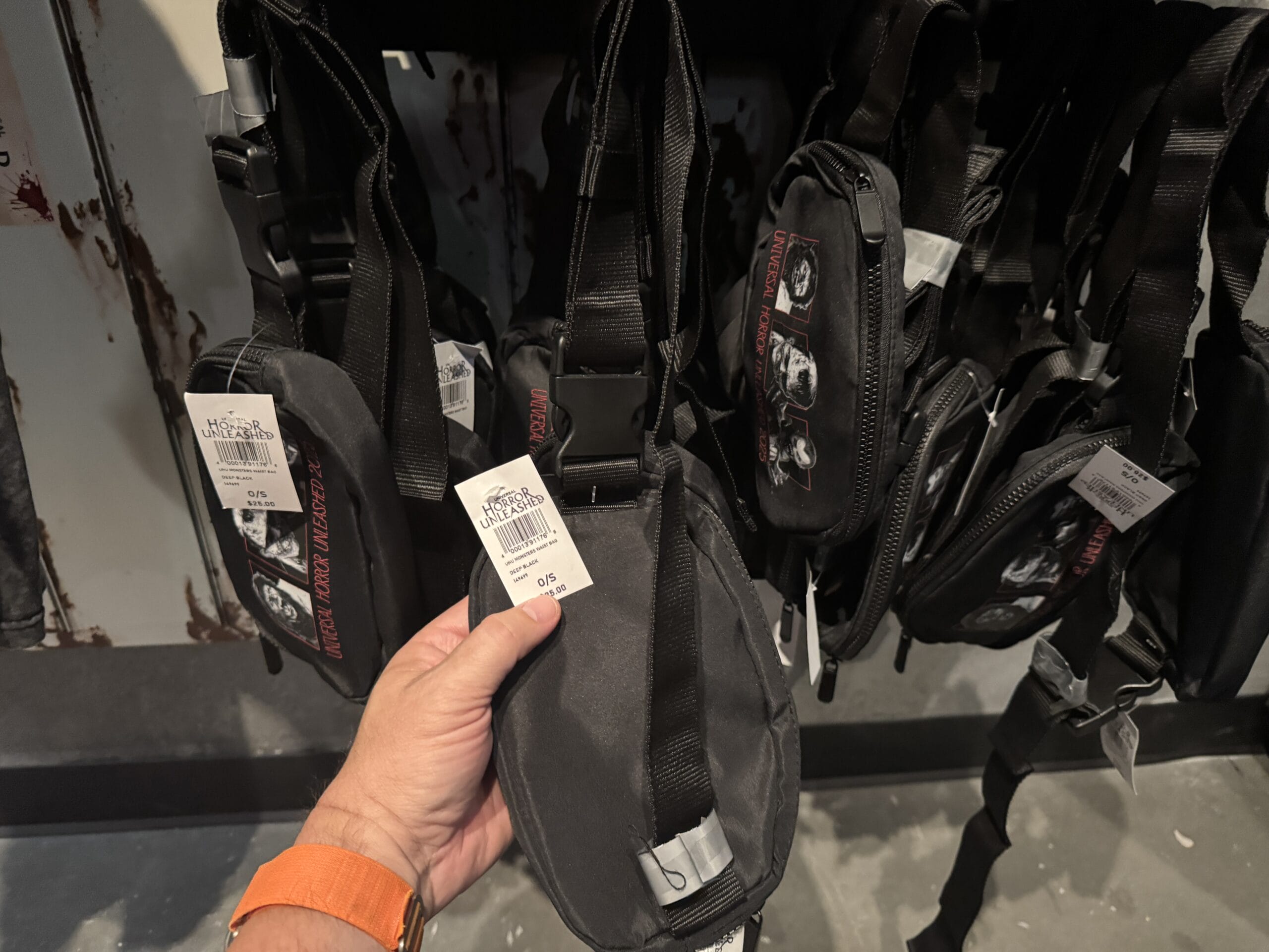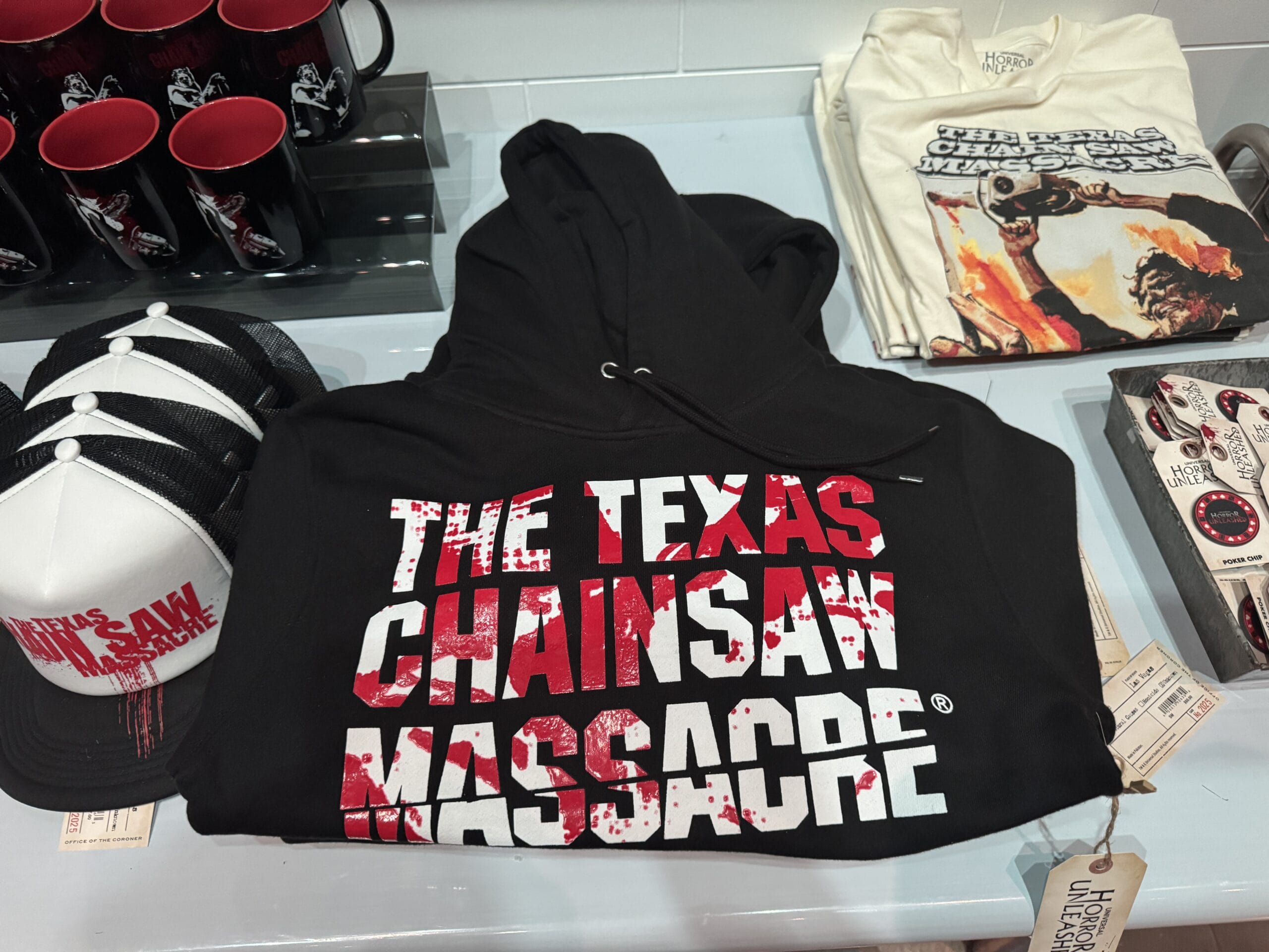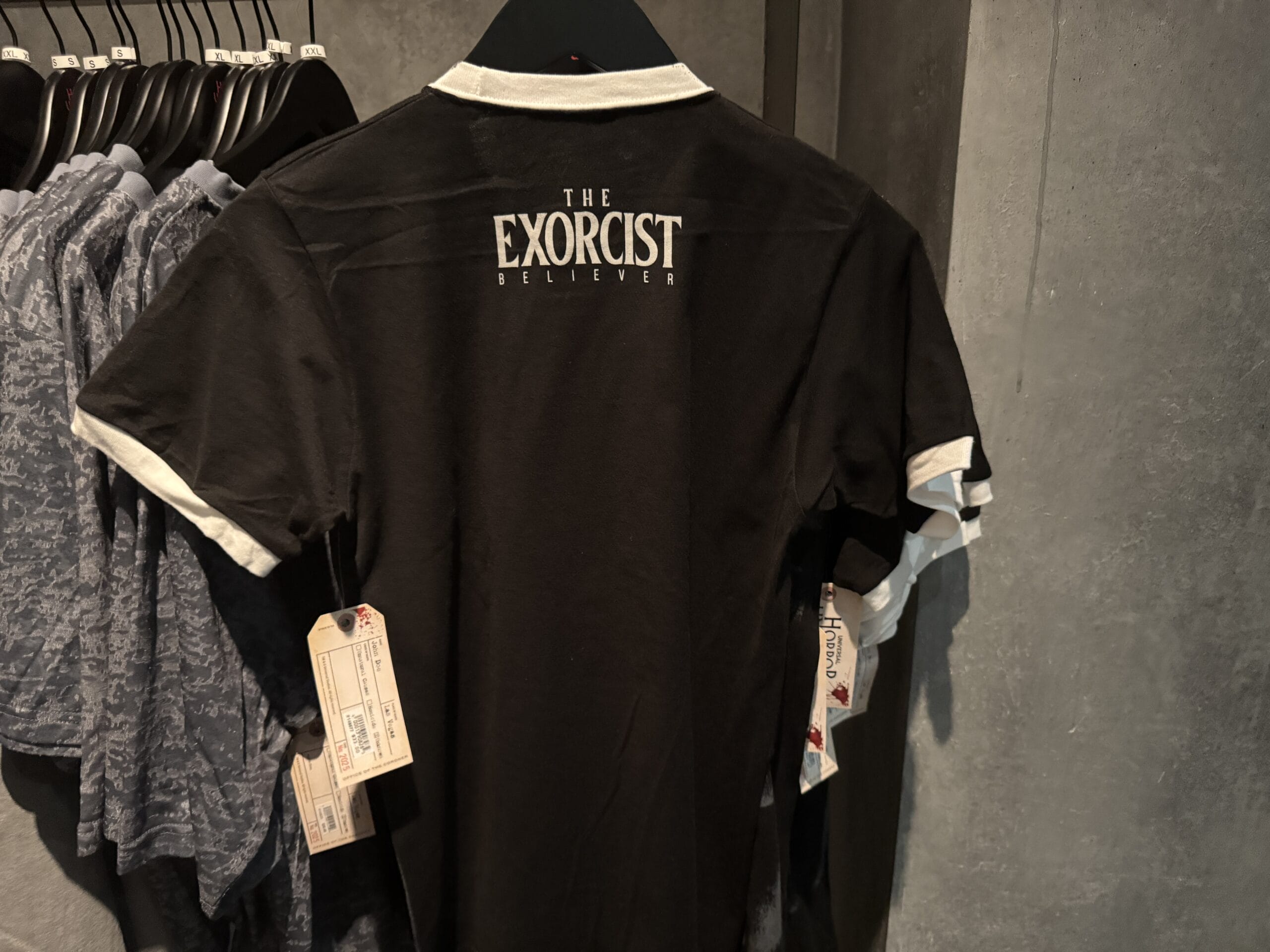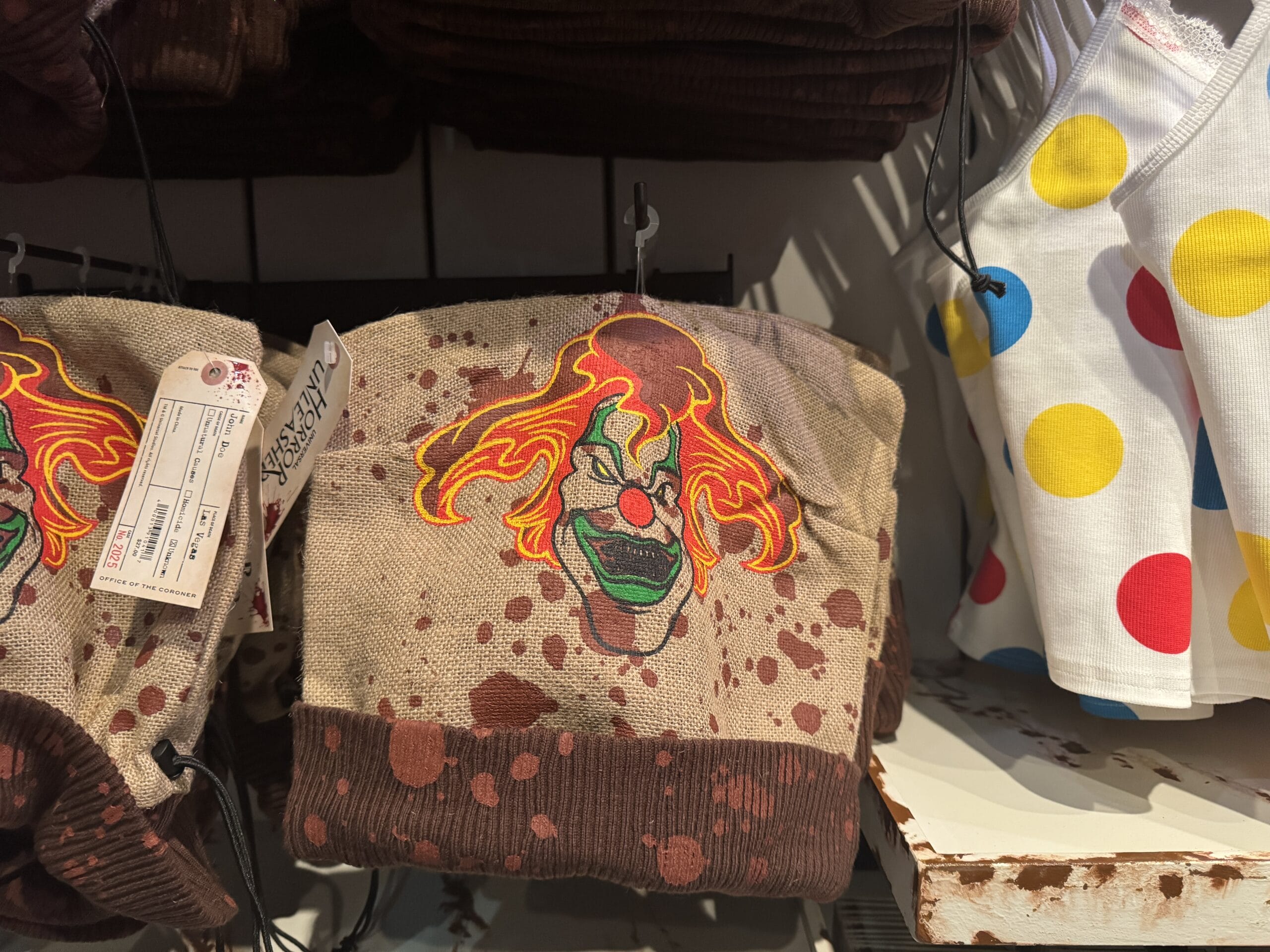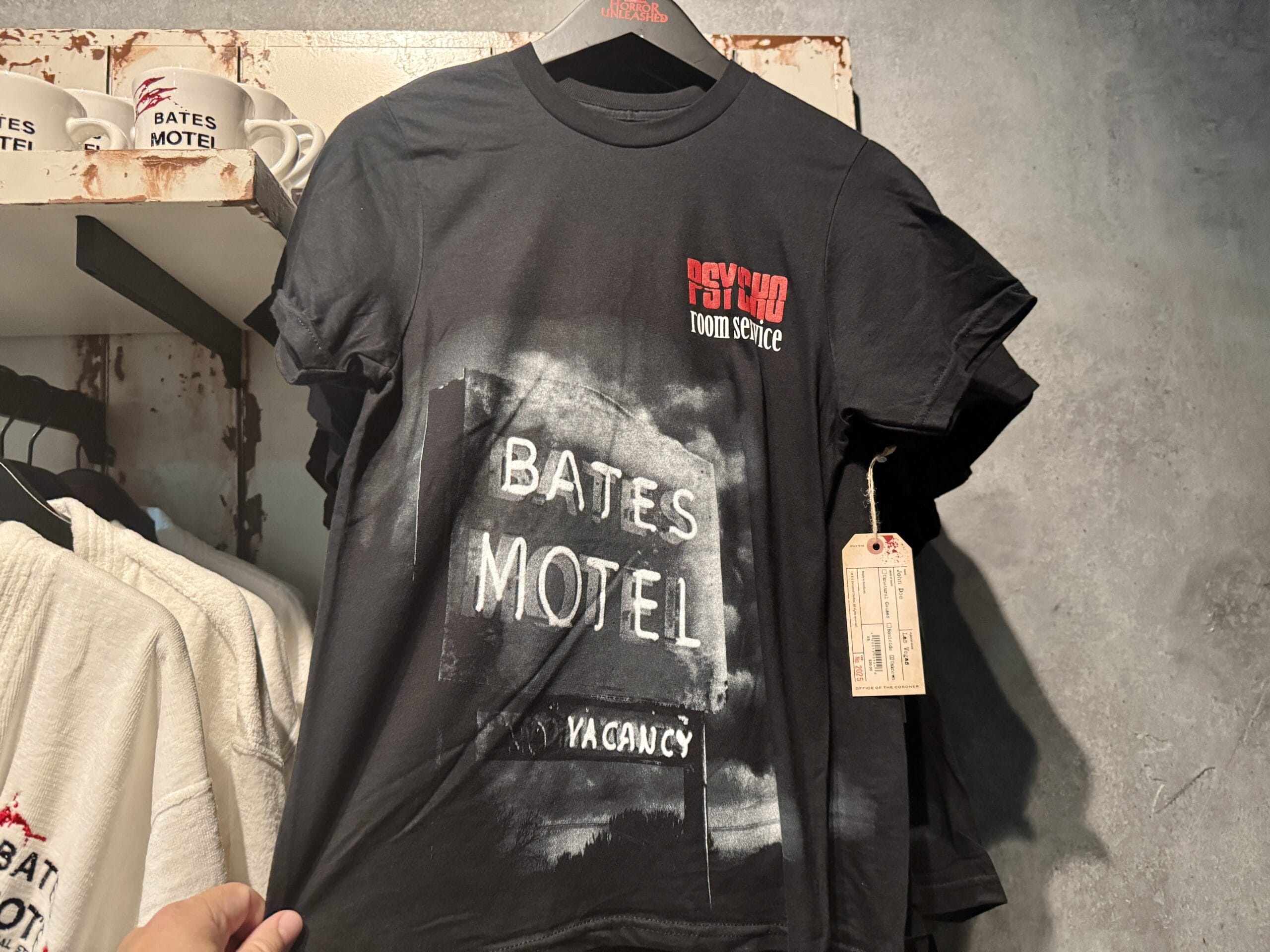 Most of the merchandise has custom Universal Horror Unleashed tags that resemble morgue toe tags. The front side has the experience wordmark, while the back lists the tag as belonging to a John Doe who died in Las Vegas of unknown causes. The case number is 2025, refrencing the opening year.