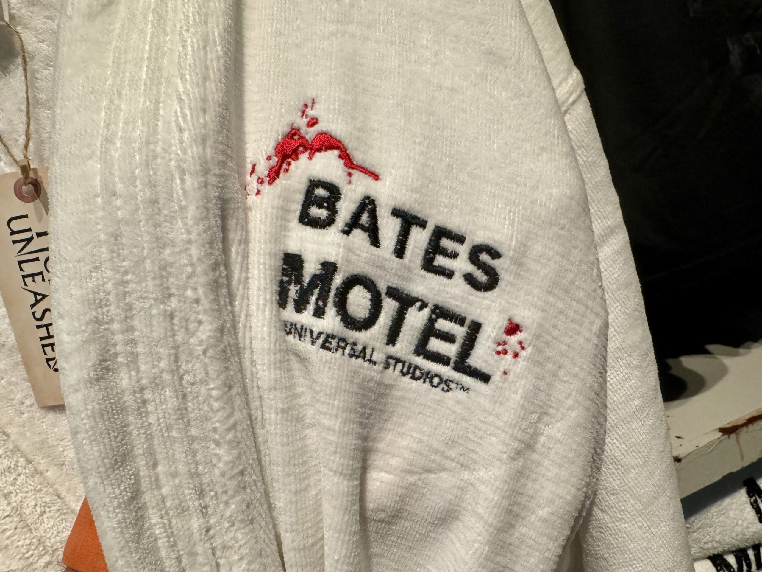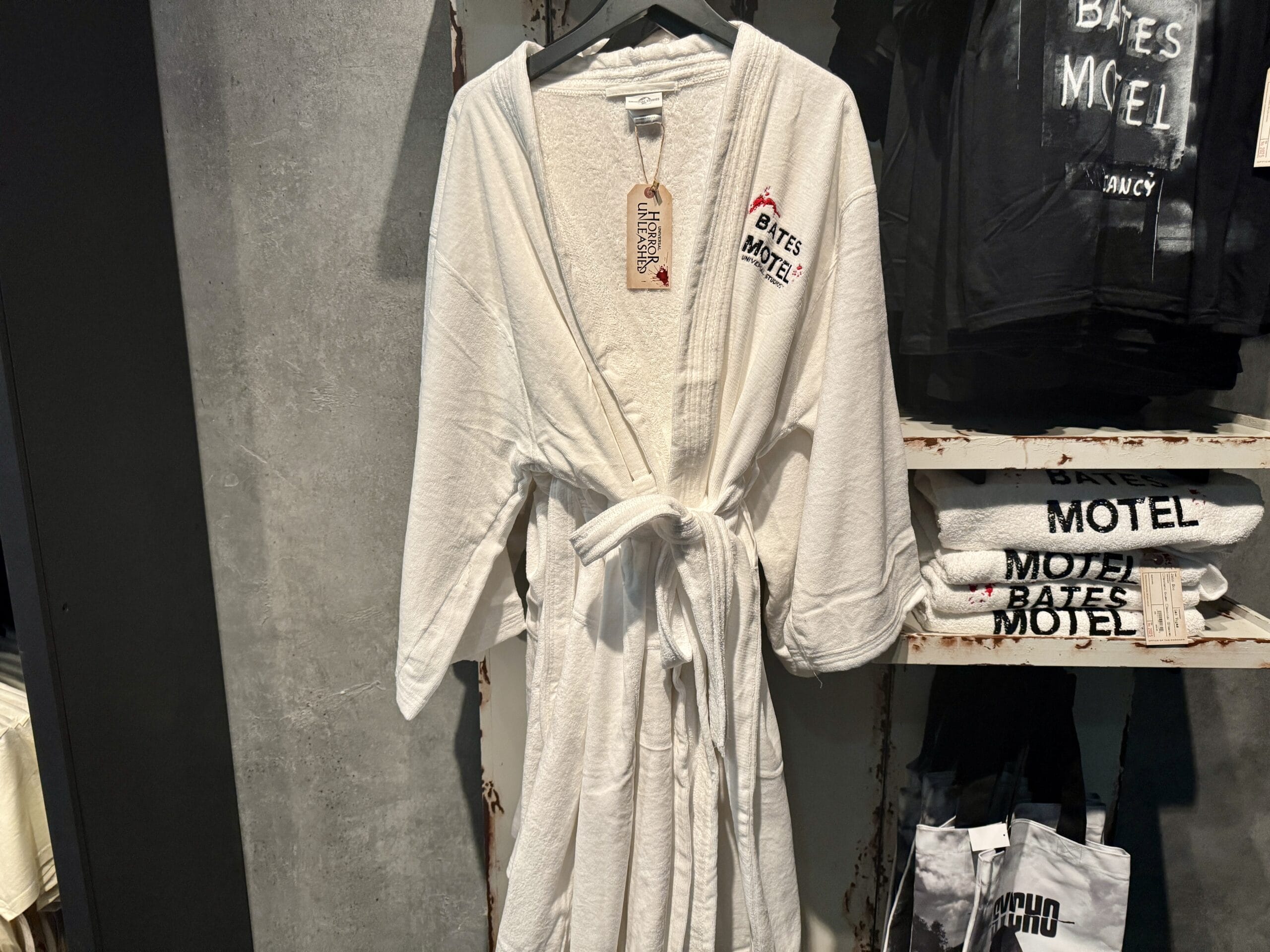 The white fluffy robe has “Bates Motel” and “Universal Studios” embroidered on the chest. Red blood splatter is also embroidered around the text.