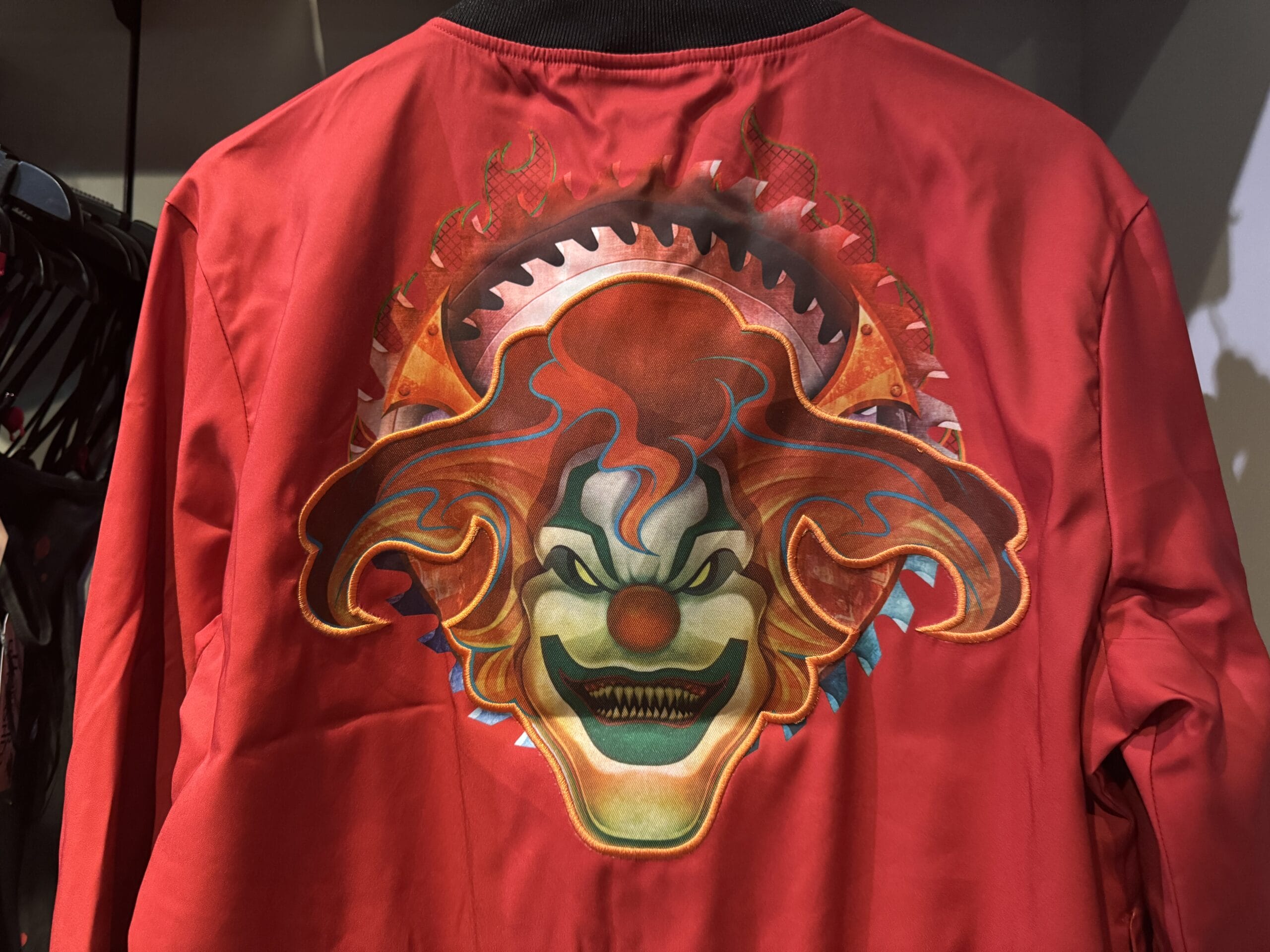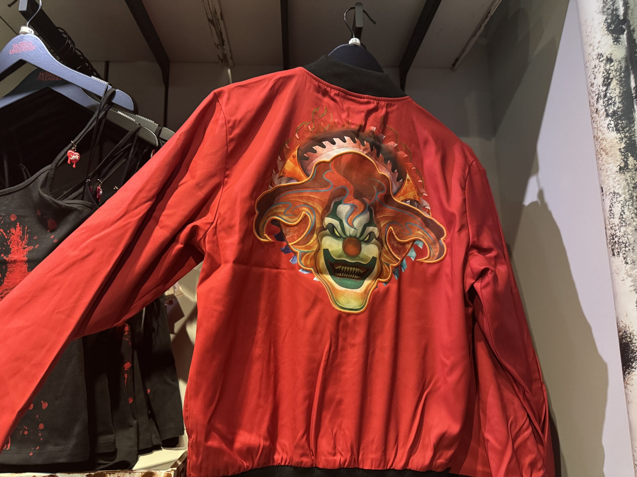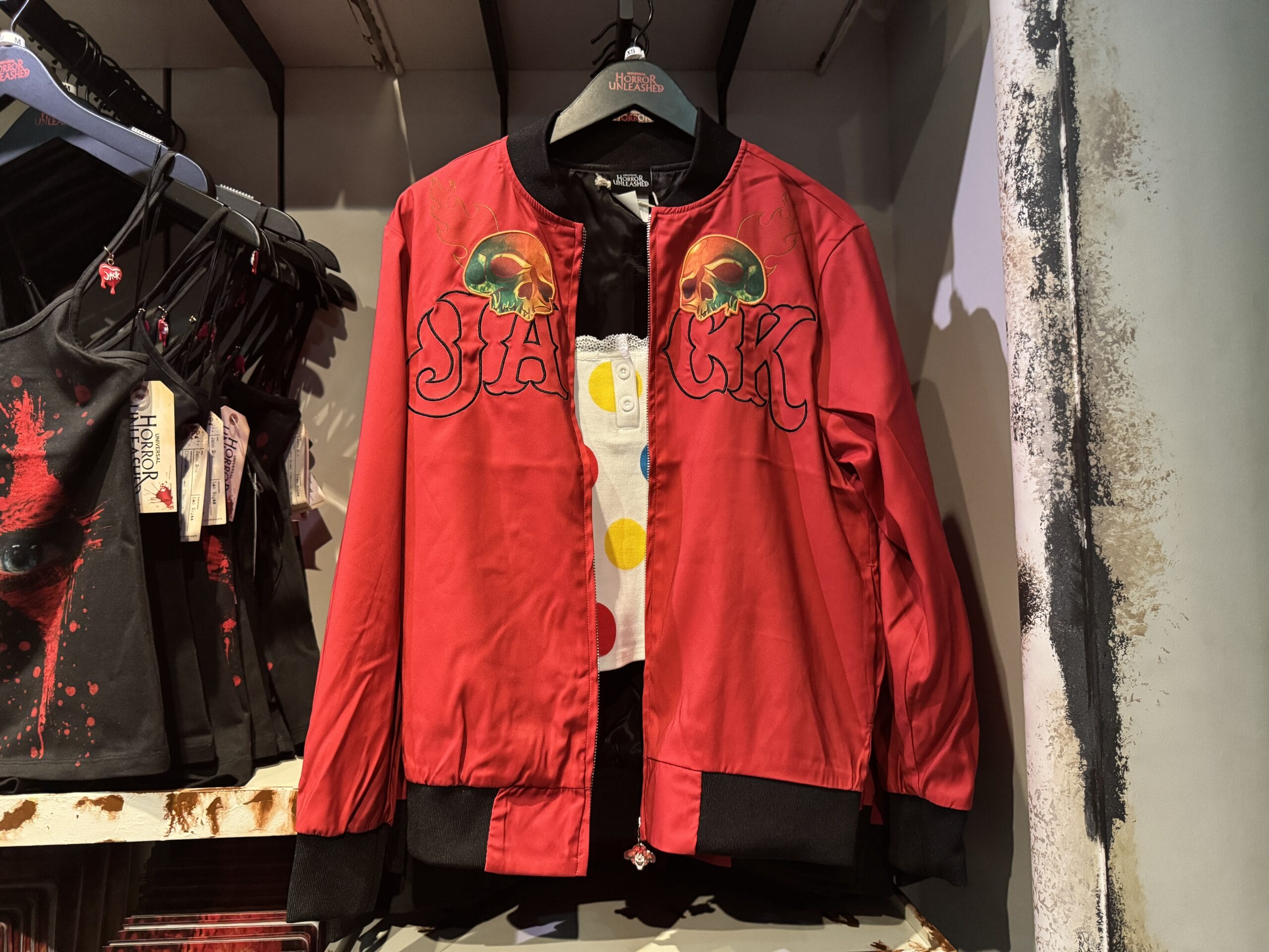 A red satin "Shark" jacket with skulls is on display among Universal Horror Unleashed merchandise in the store.