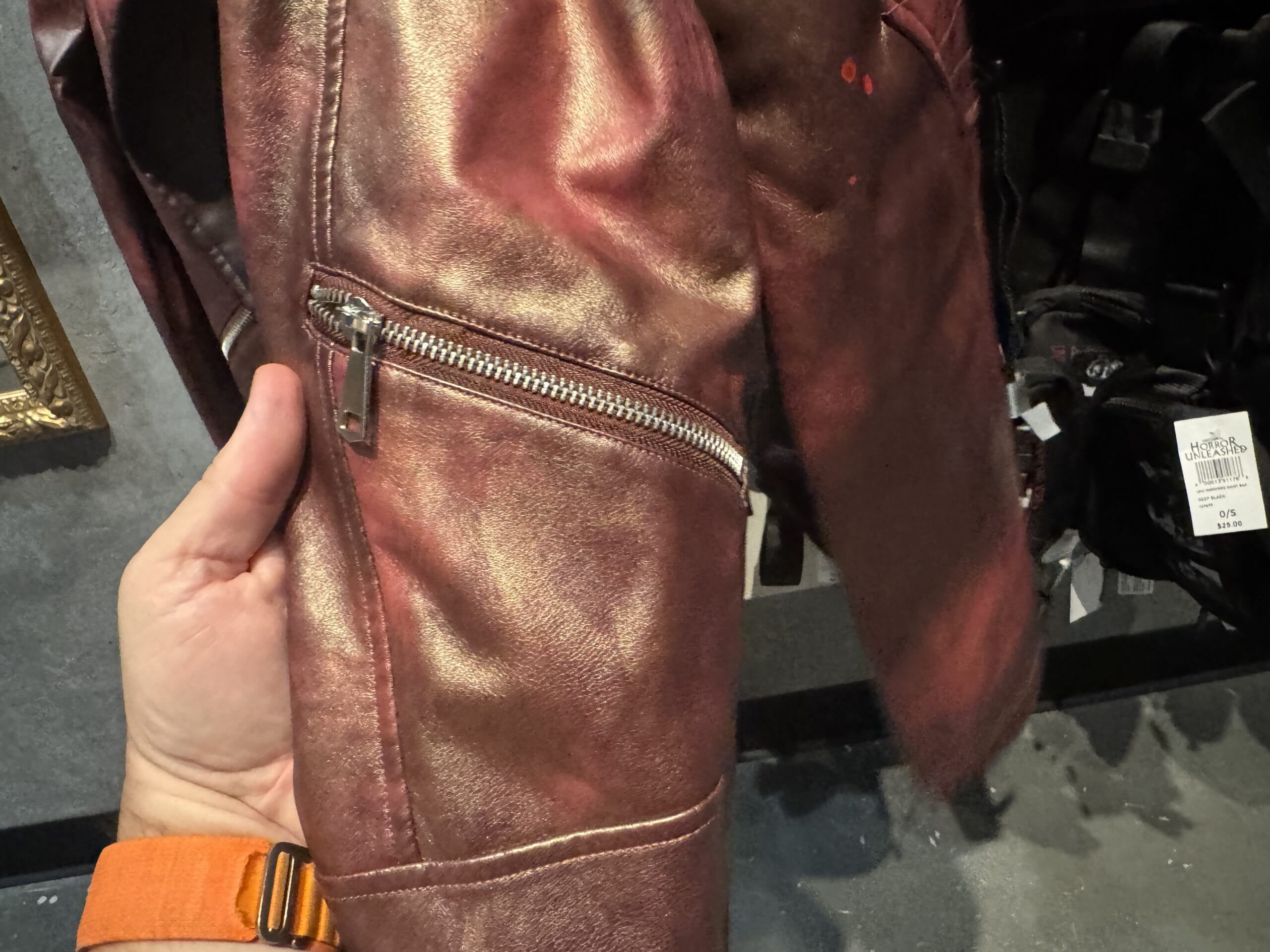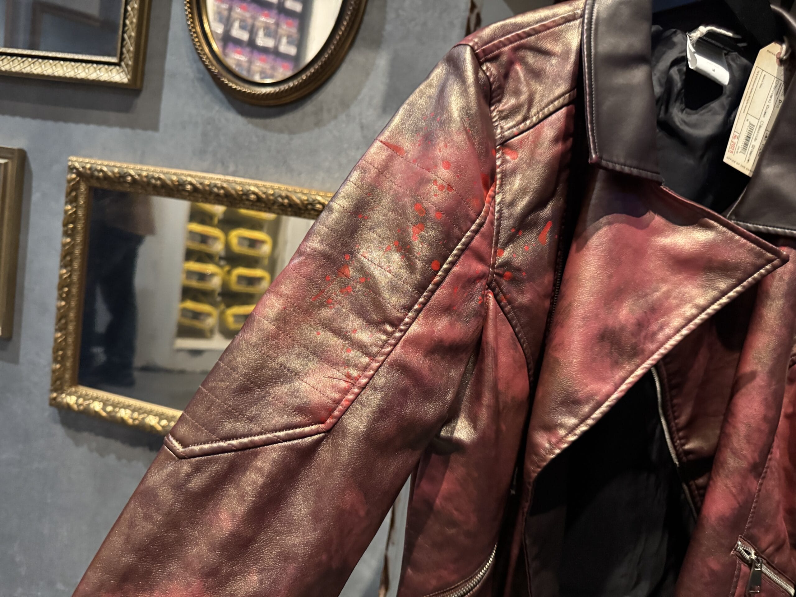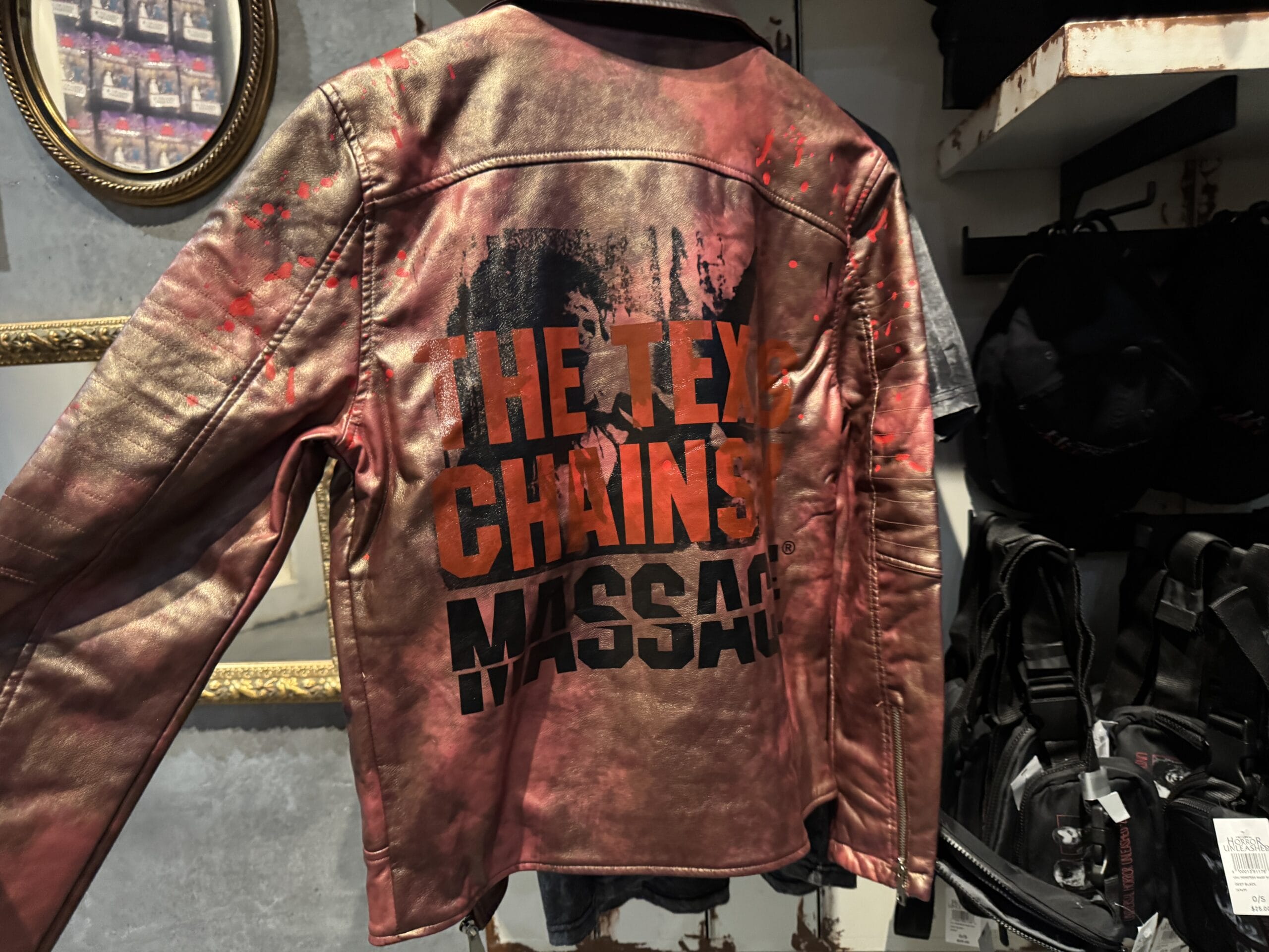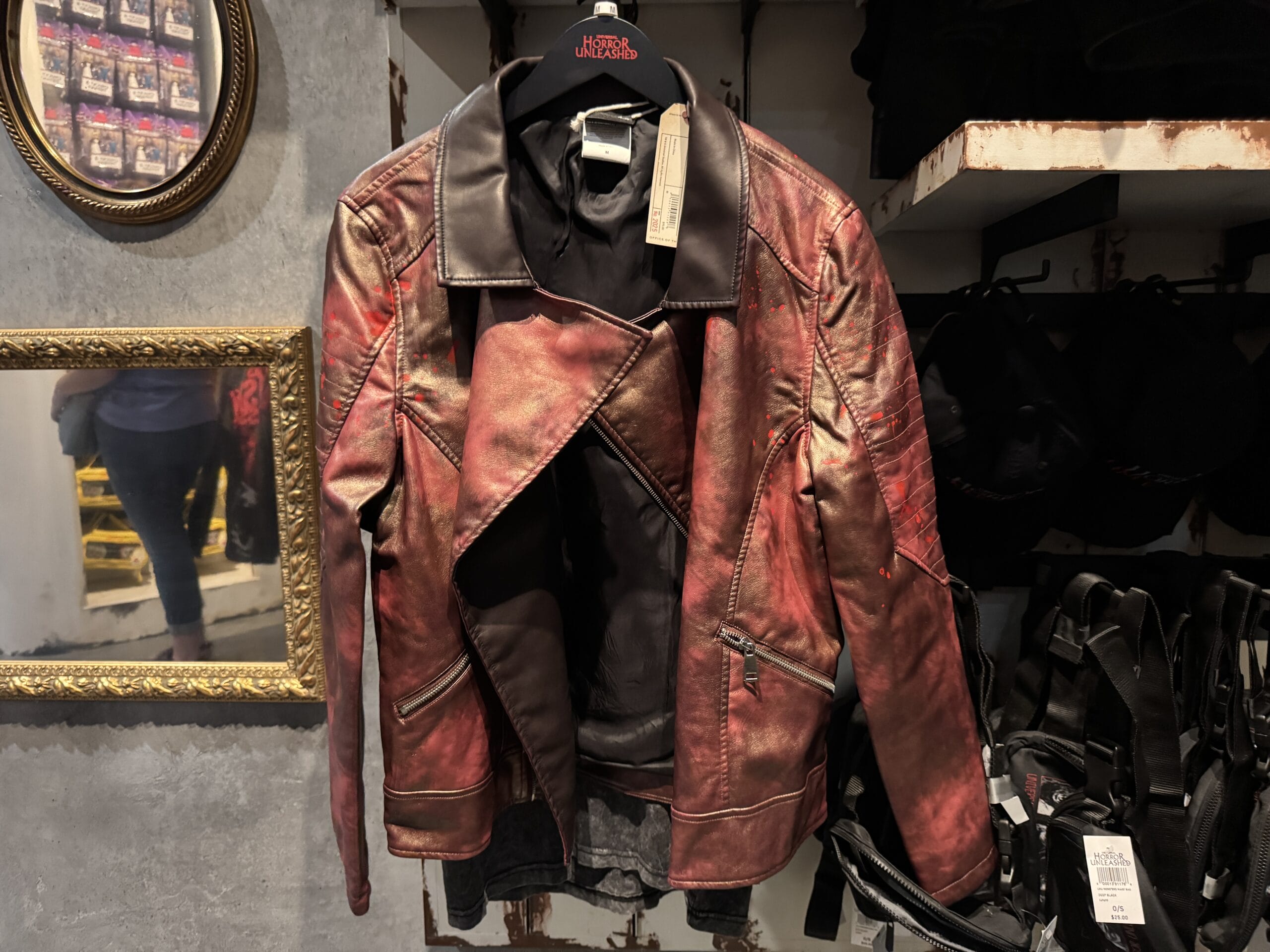A red satin "Shark" jacket with skulls is on display among Universal Horror Unleashed merchandise in the store.