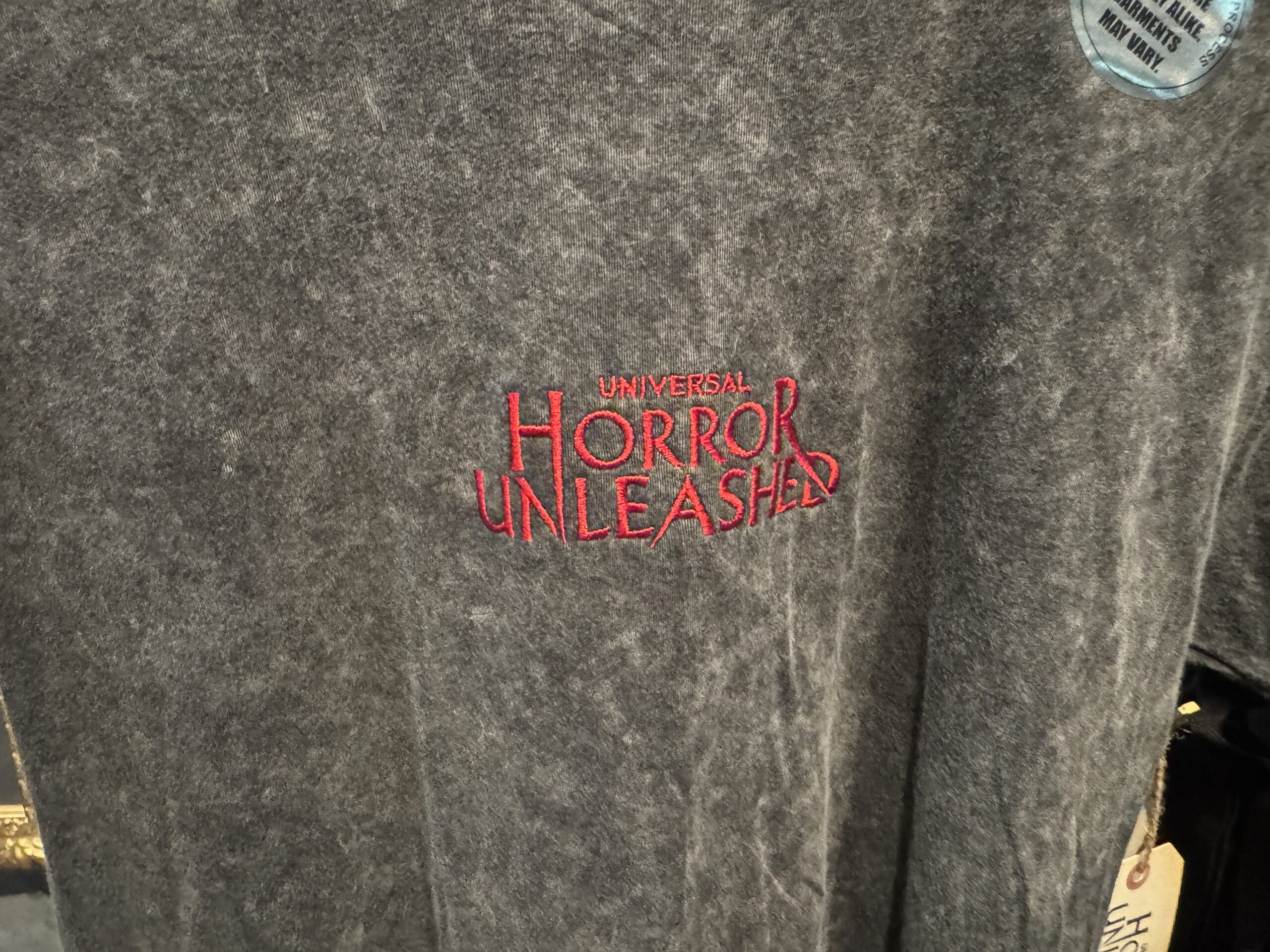 The T-shirt has a similar gray tie-dye finish. “Universal Horror Unleashed” is embroidered in red on the center chest.