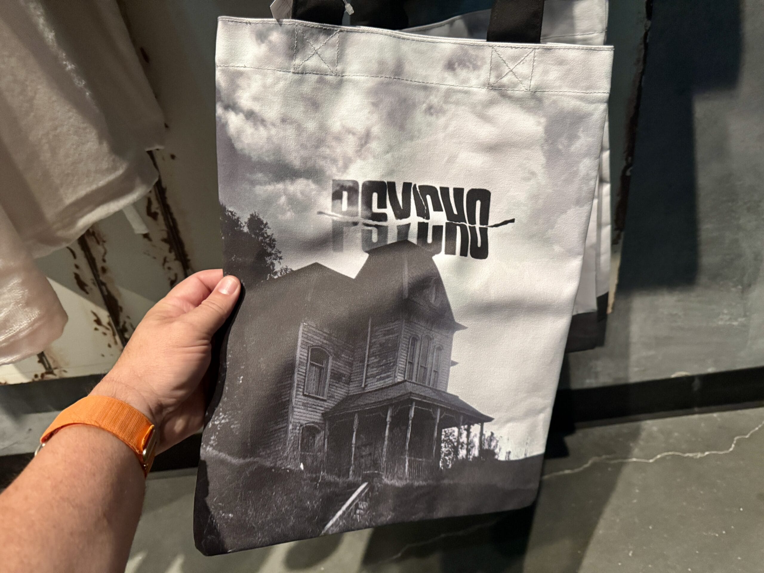 A merchandise tote bag featuring a house and "Psycho," held by a hand with an orange watch—Universal Horror Unleashed style.