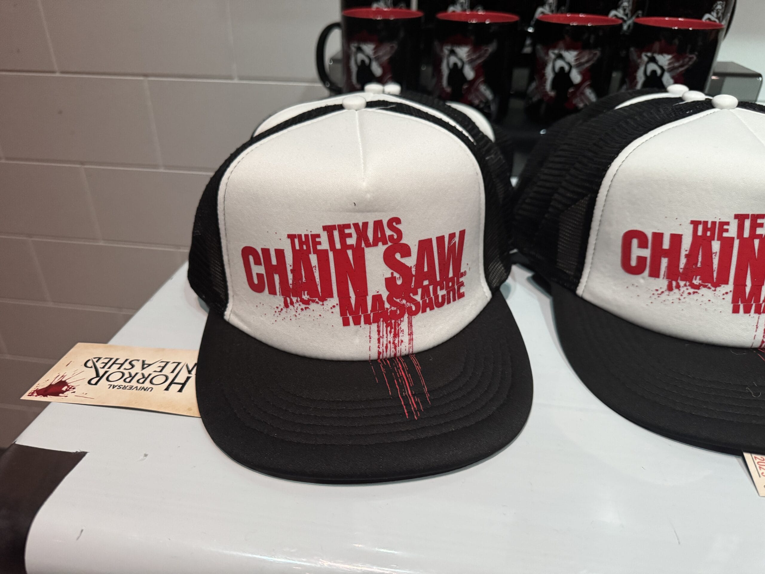 A black and white cap from the Universal Horror Unleashed merchandise line with "The Texas Chain Saw Massacre" in red font.