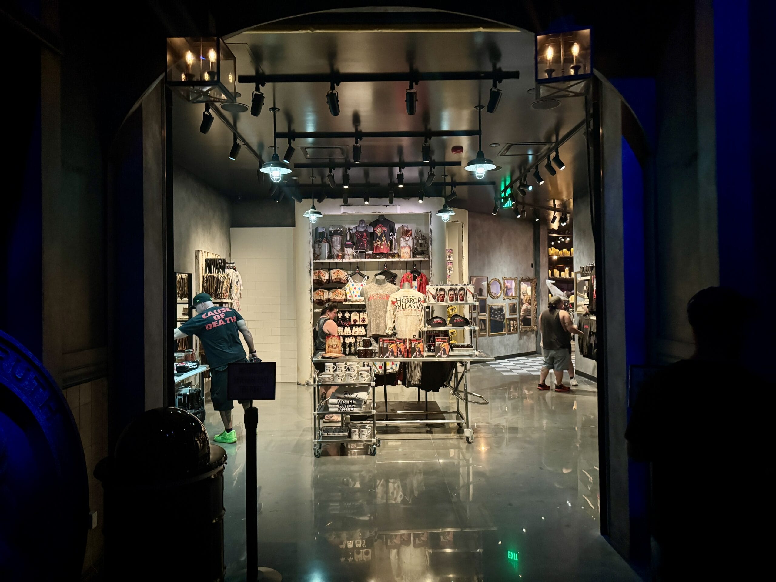 A store with a group of people walking through it, browsing Universal Horror Unleashed merchandise.