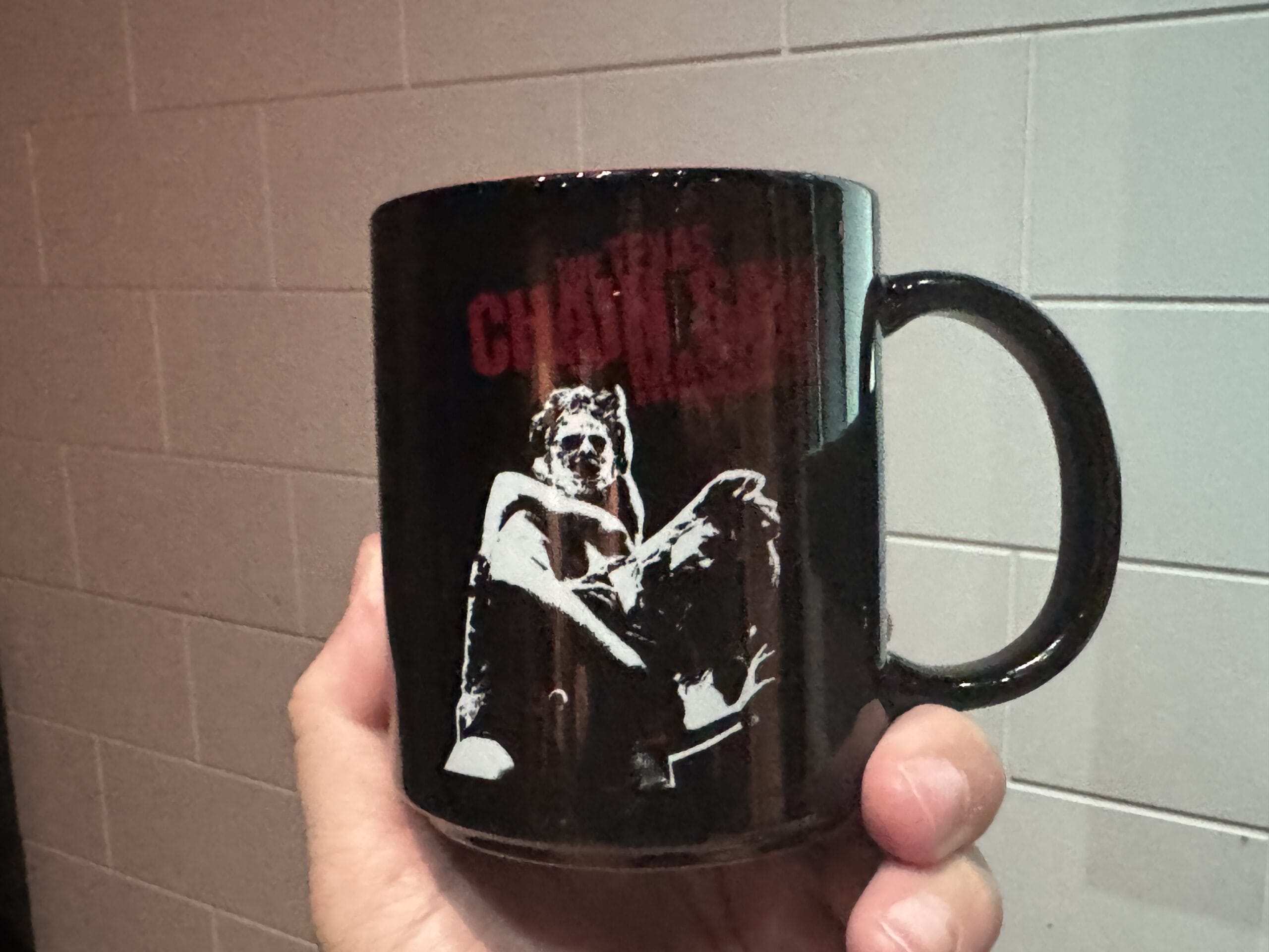 Leatherface is pictured on both sides of this mug. One has him in silhouette against a red splatter and crossed chainsaws. The other features him under the film’s name. The mug is black stoneware.