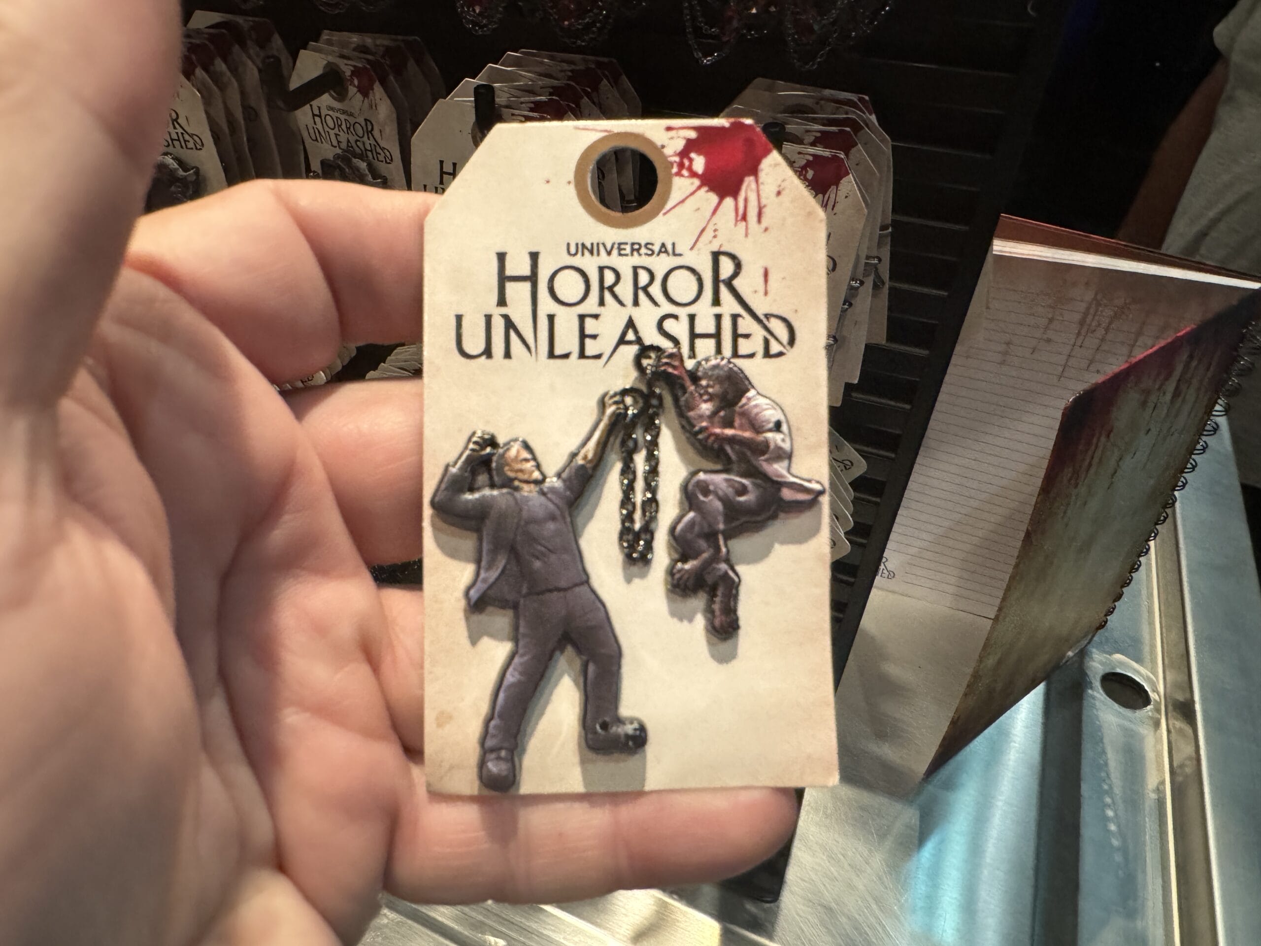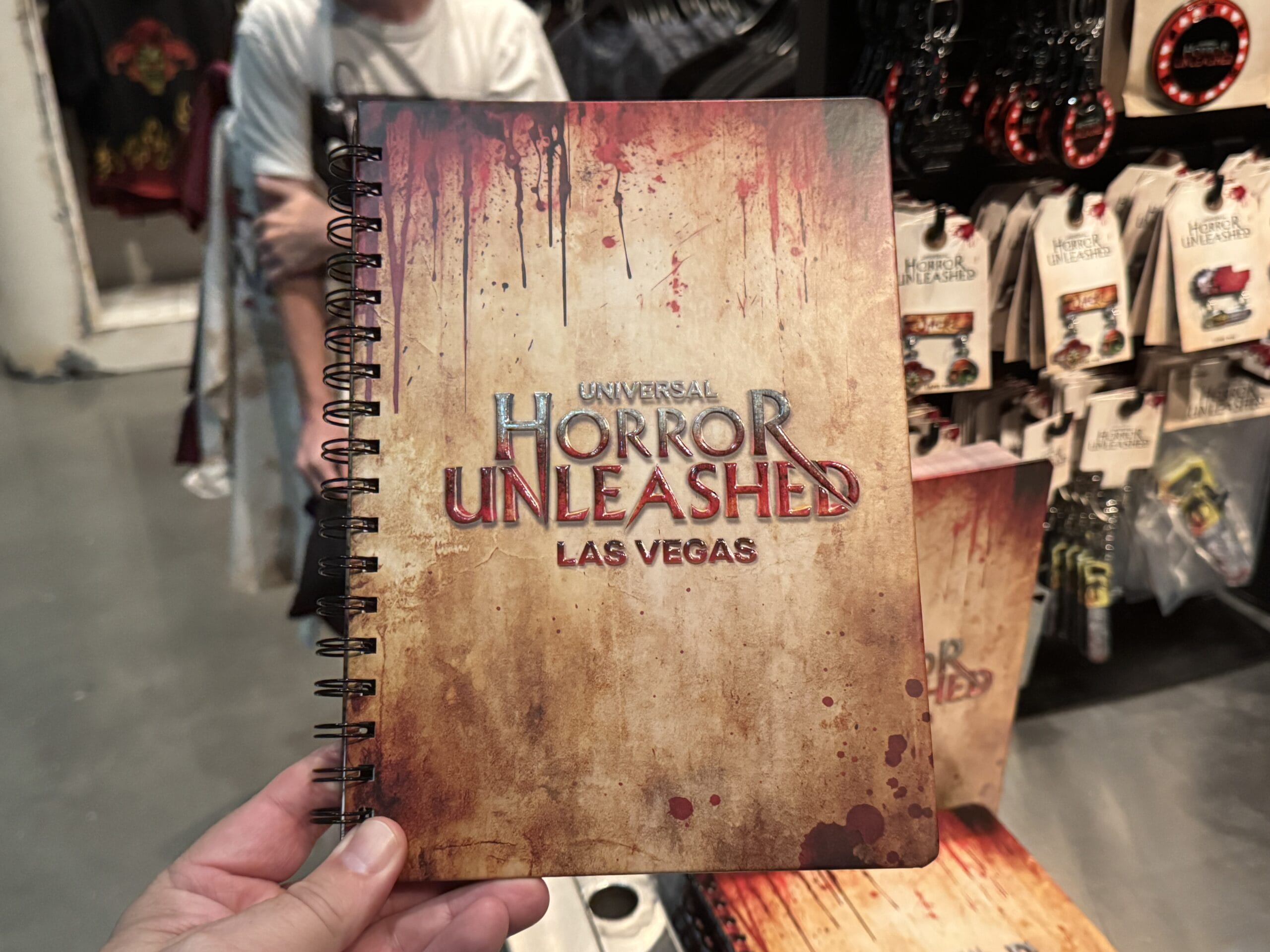 A hand holds a spiral notebook with Universal Horror Unleashed merchandise in a Las Vegas gift shop.