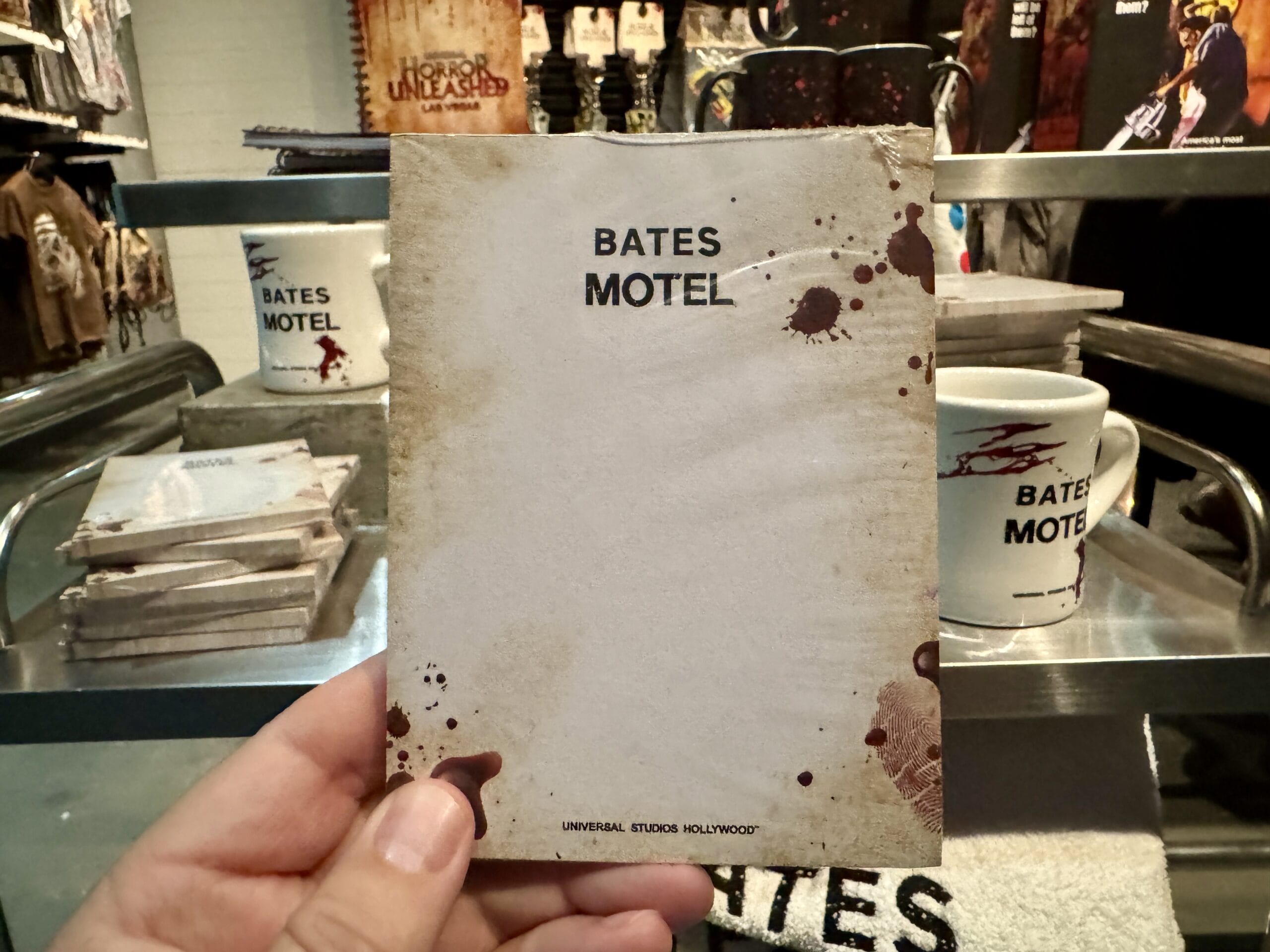 A hand holds a "Bates Motel" notepad in a gift shop with Universal Horror Unleashed merchandise and prices in view.