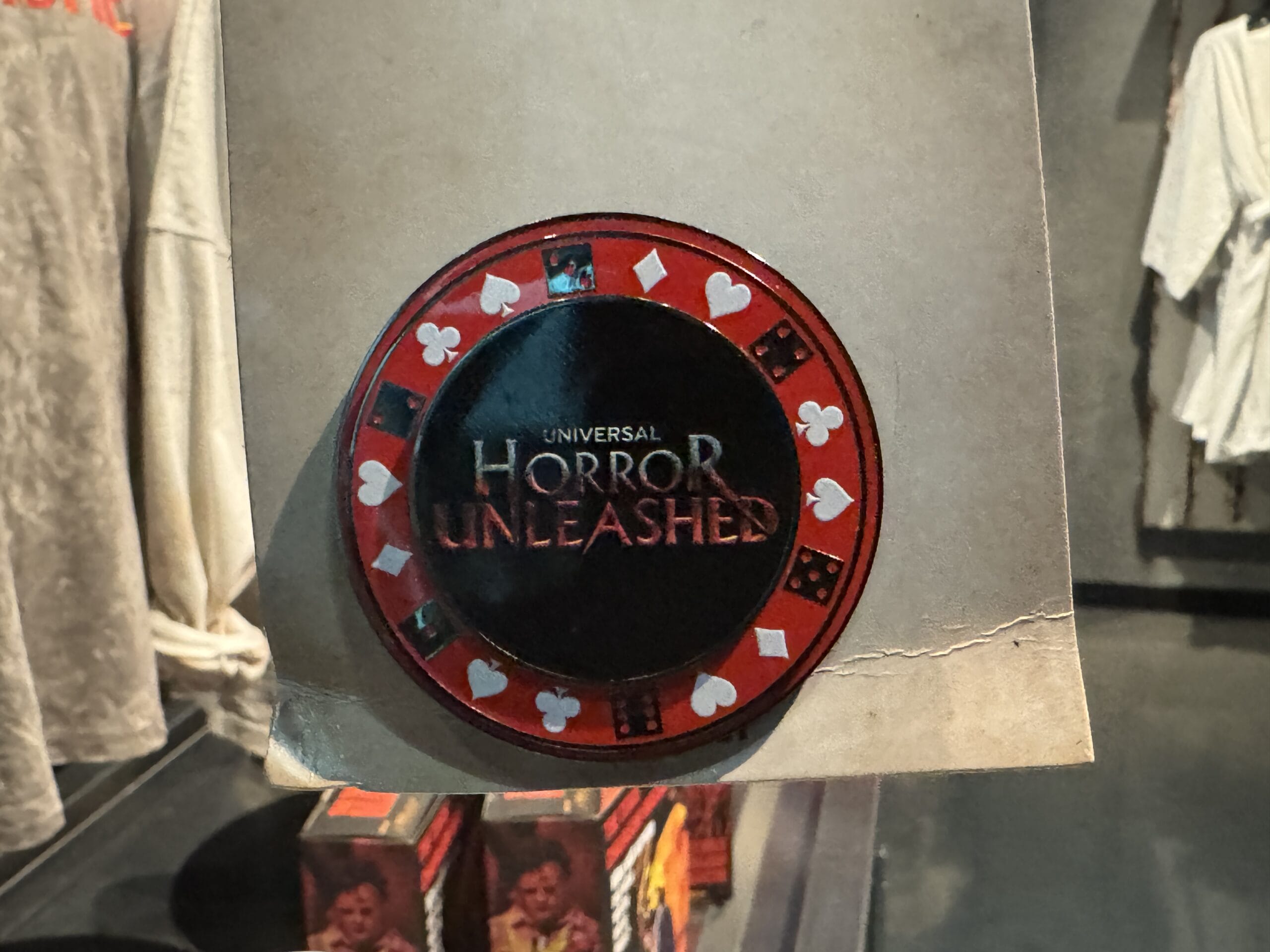 The collectible poker chip has a similar design as the keychain. It’s black, red, and white with card symbols around the edge and “Universal Horror Unleashed” in the center.