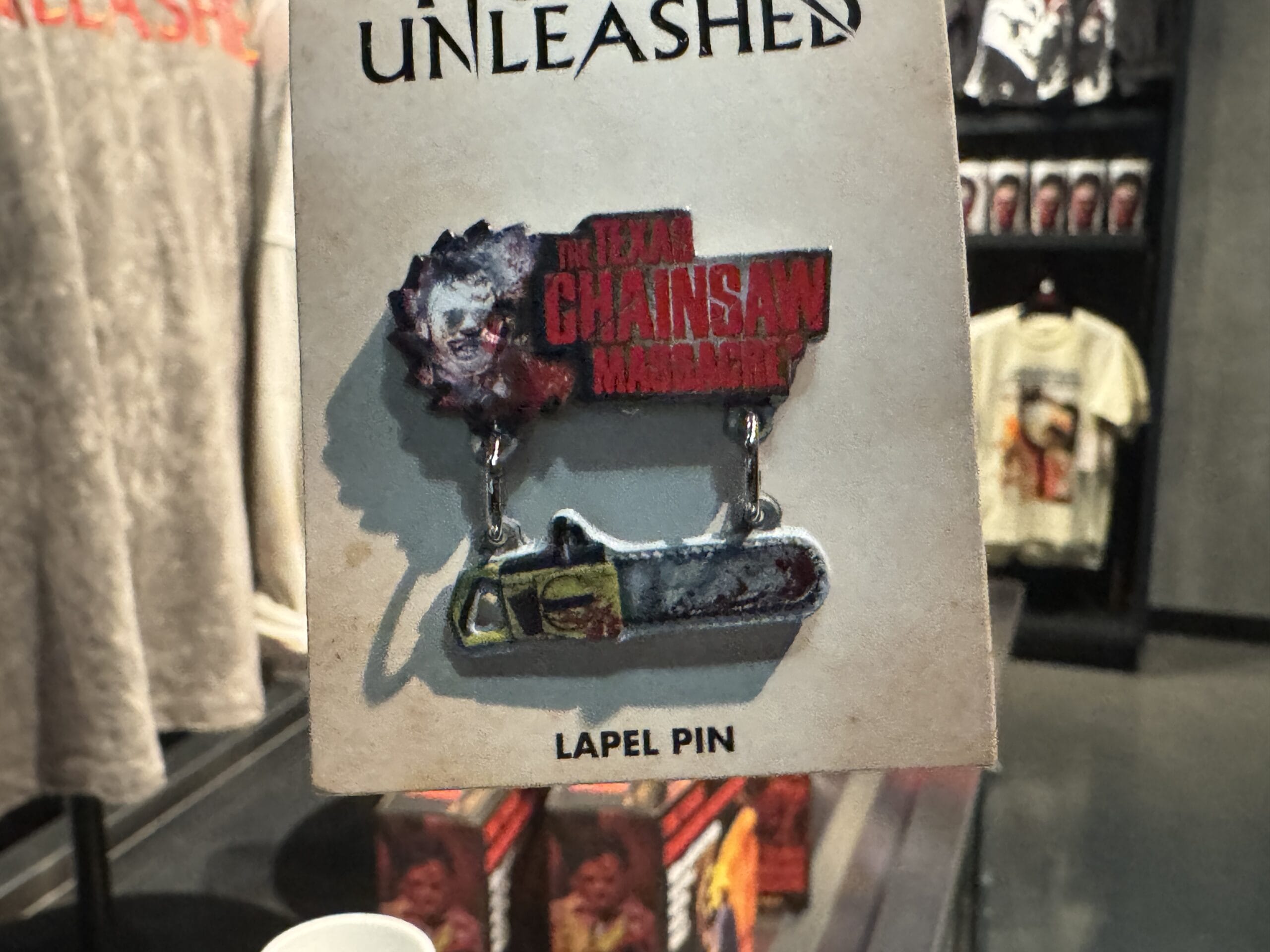 Leatherface is pictured on this pin with the film’s name in red. A dangling chainsaw charm hangs below.