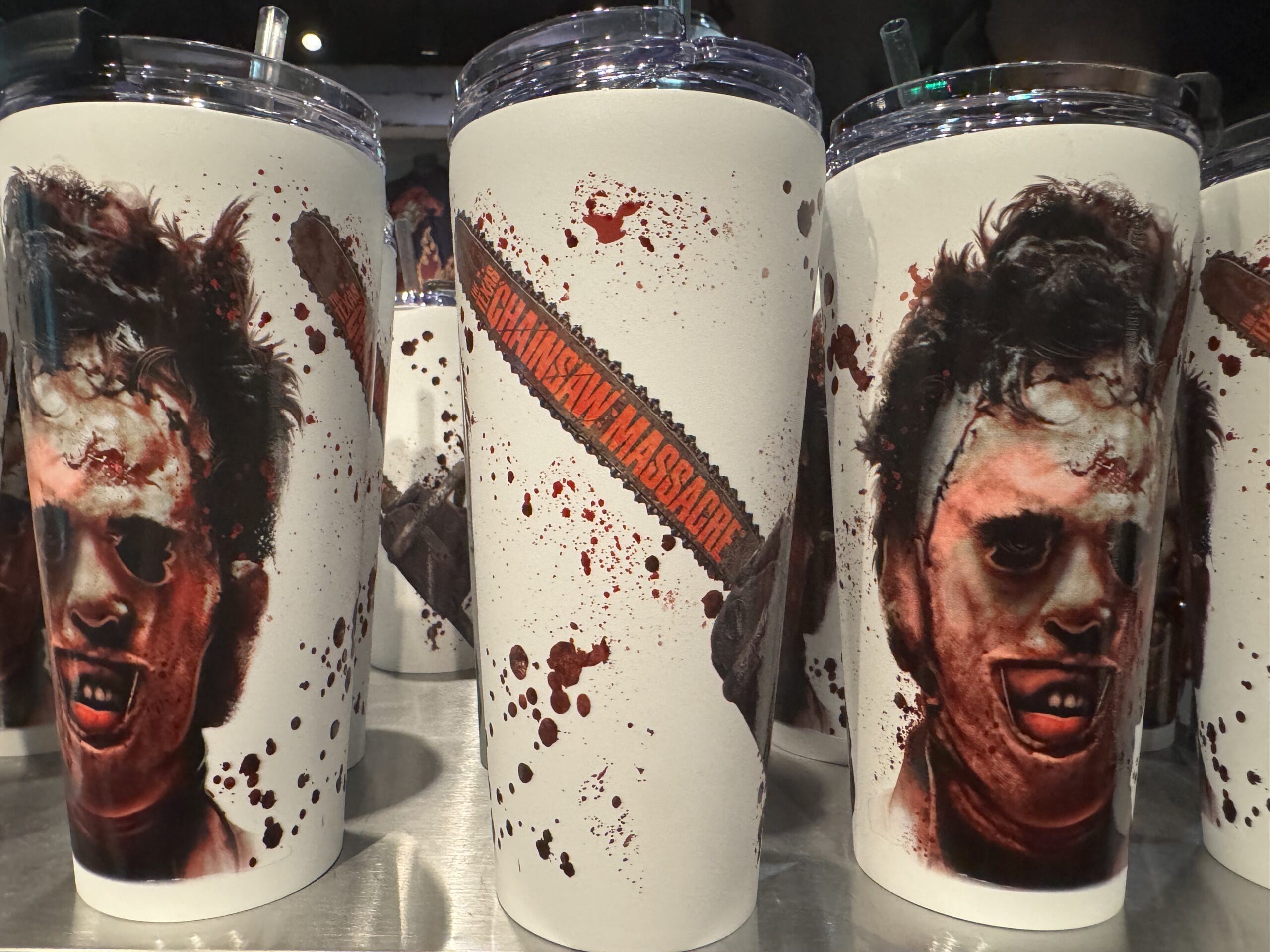Leatherface’s face is pictured in full color on one side of this white tumbler. A chainsaw with the film’s name in red is pictured on the reverse, surrounded by blood splatters. It has a clear lid with a straw.