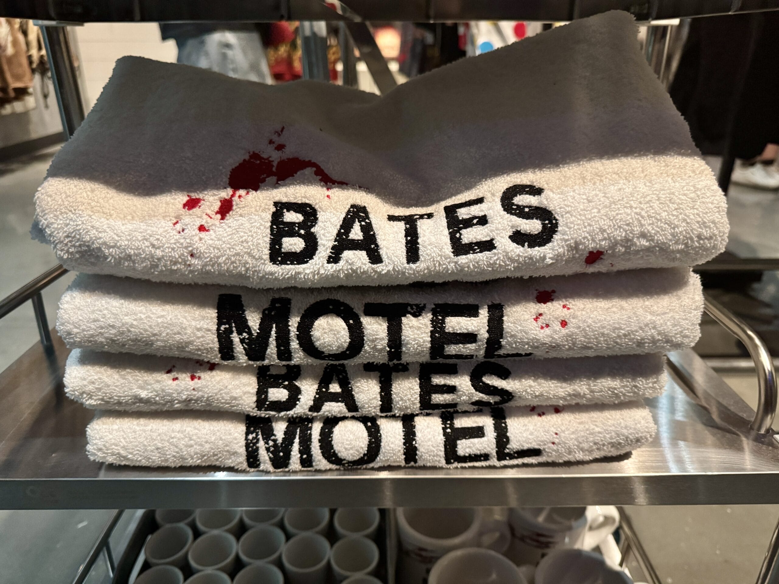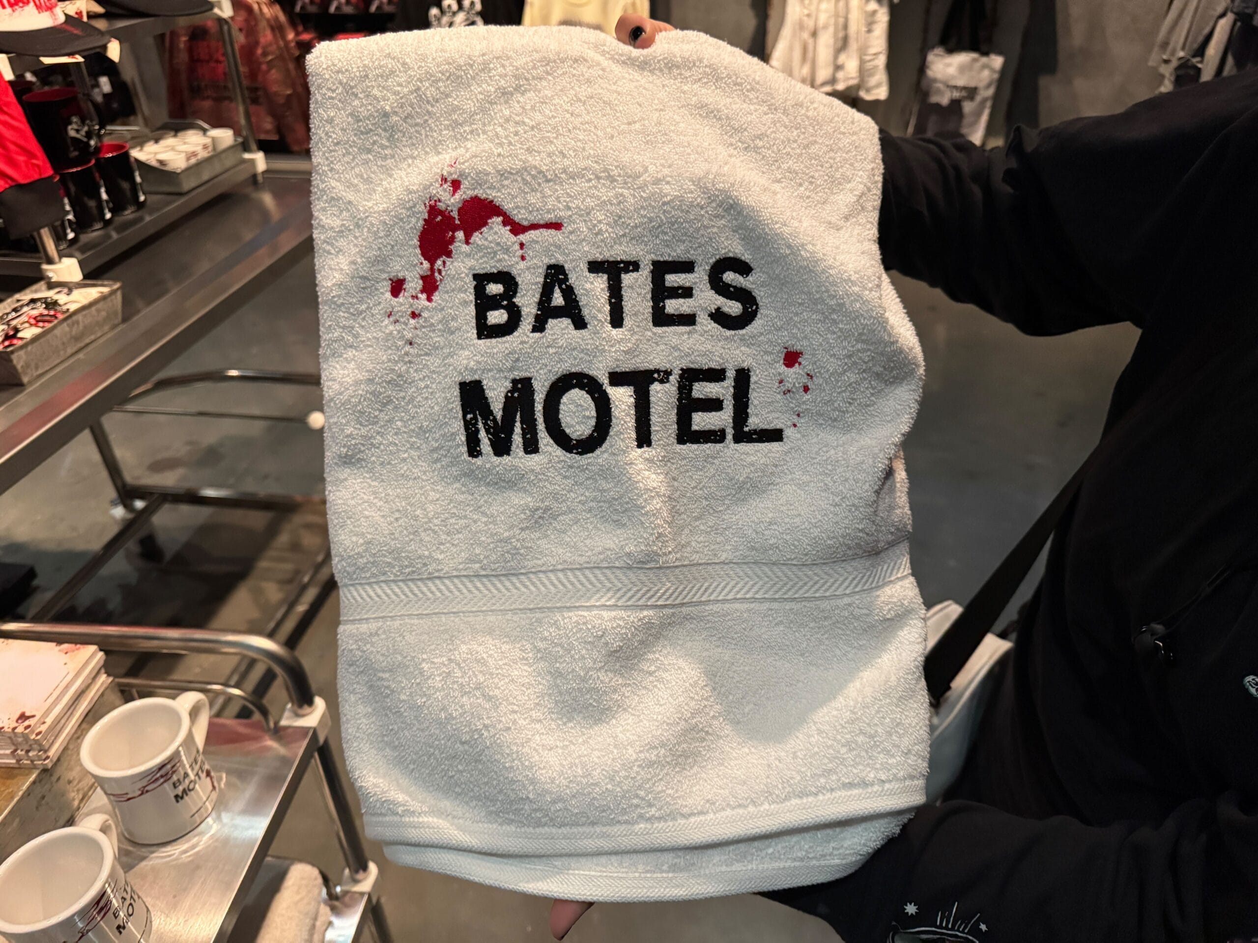 White towels with “Bates Motel” and blood splatter embroidery can also be purchased.