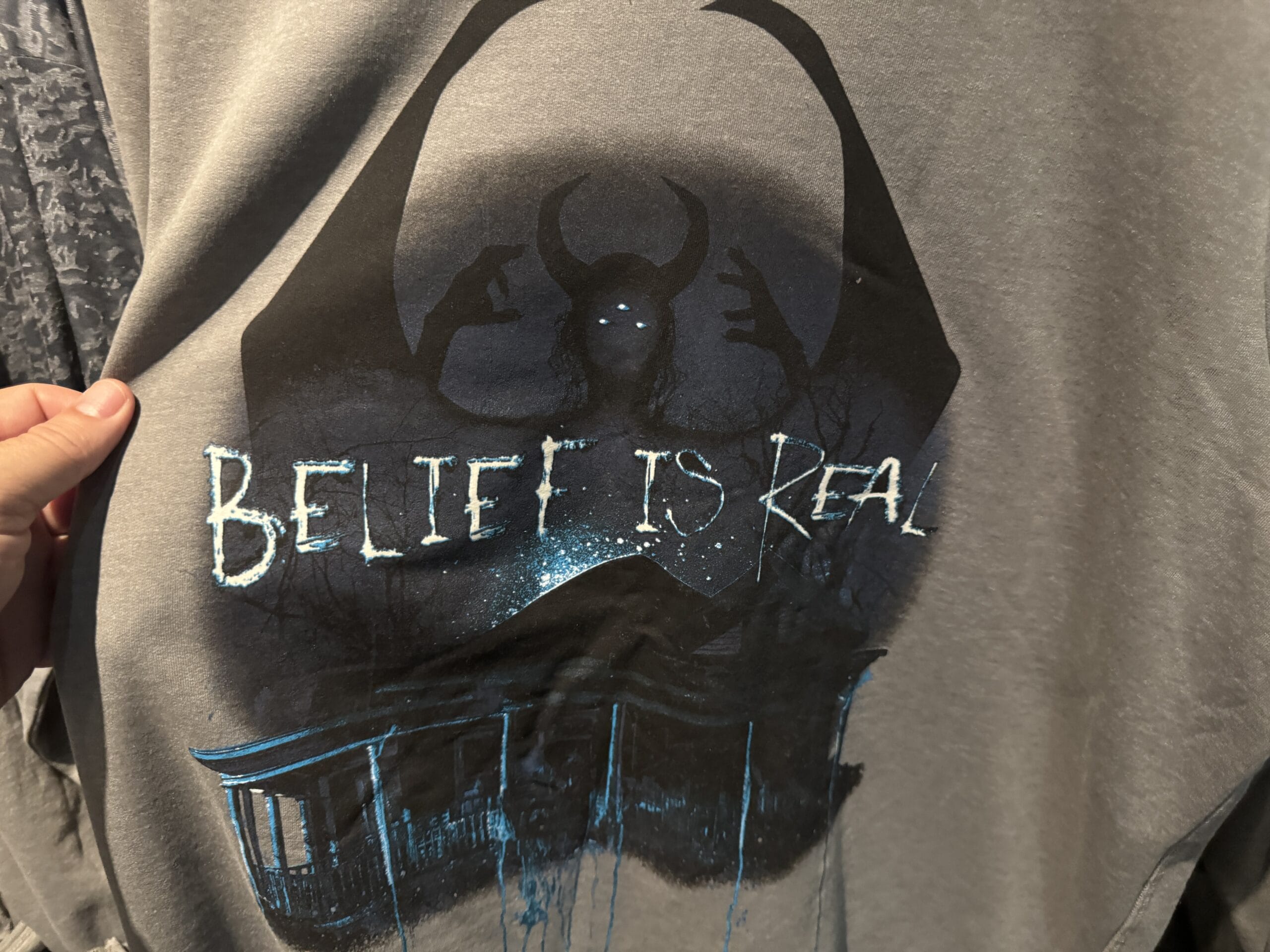 The long-sleeved shirt features the demon’s true form with horns, wings, and three glowing eyes. “Belief is Real” is written across the image.