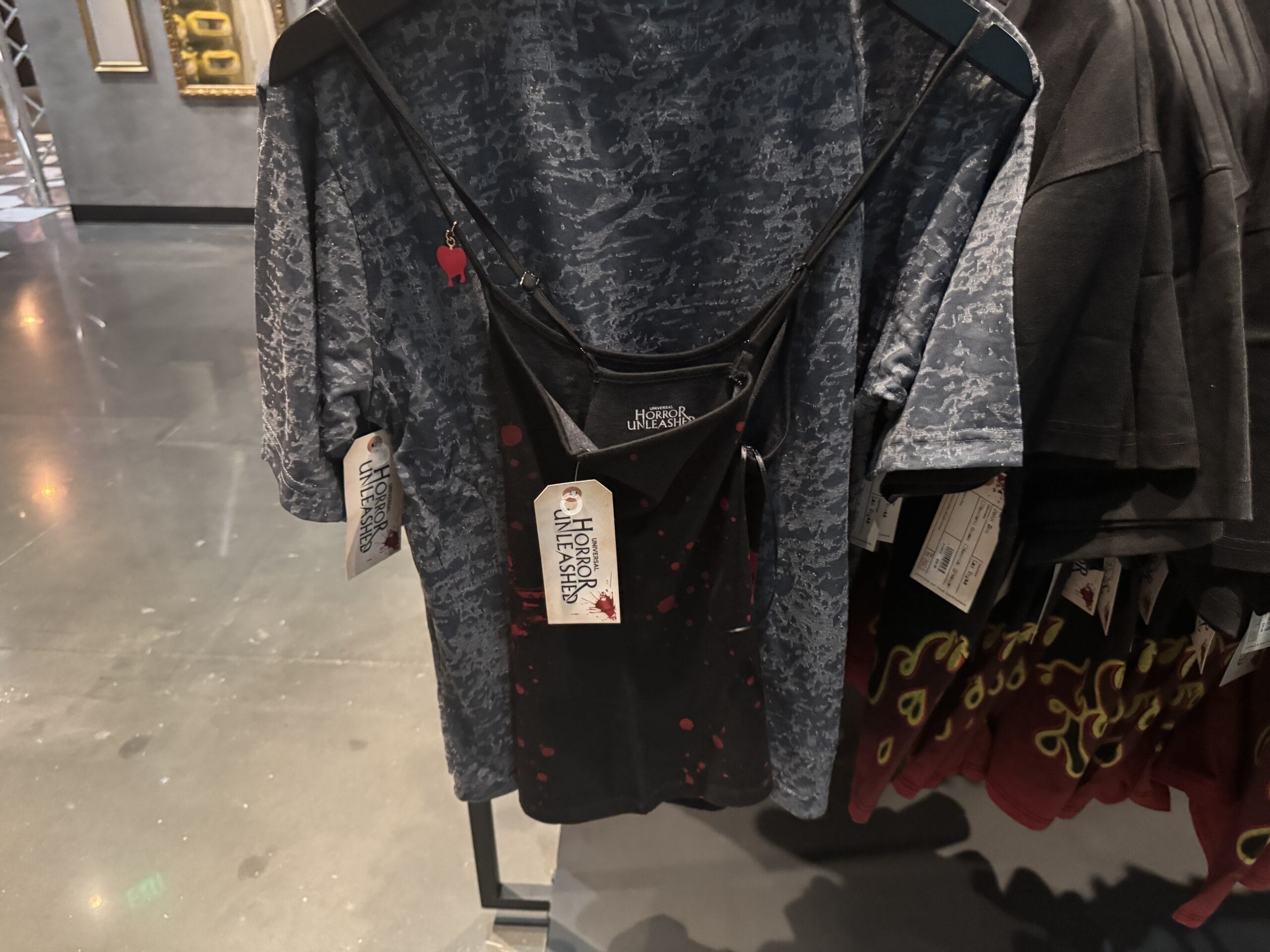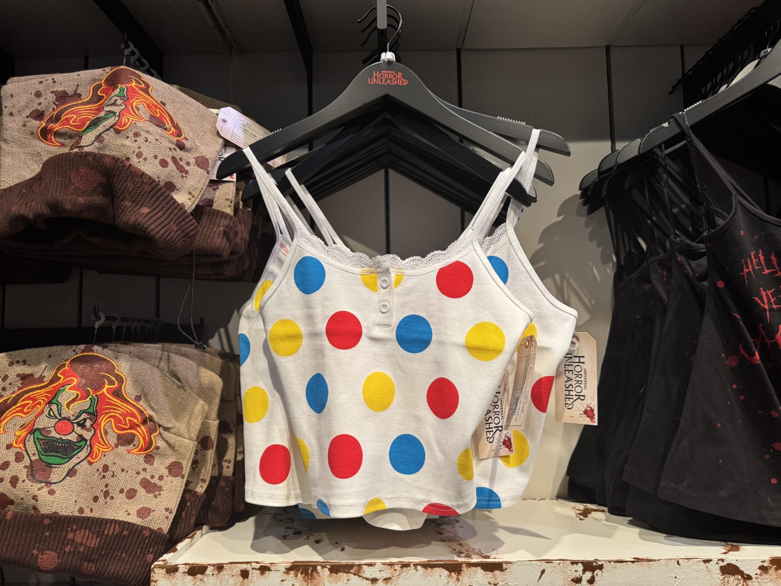 White crop top with red, yellow, and blue polka dots—Universal Horror Unleashed merchandise—hanging between printed shirts.