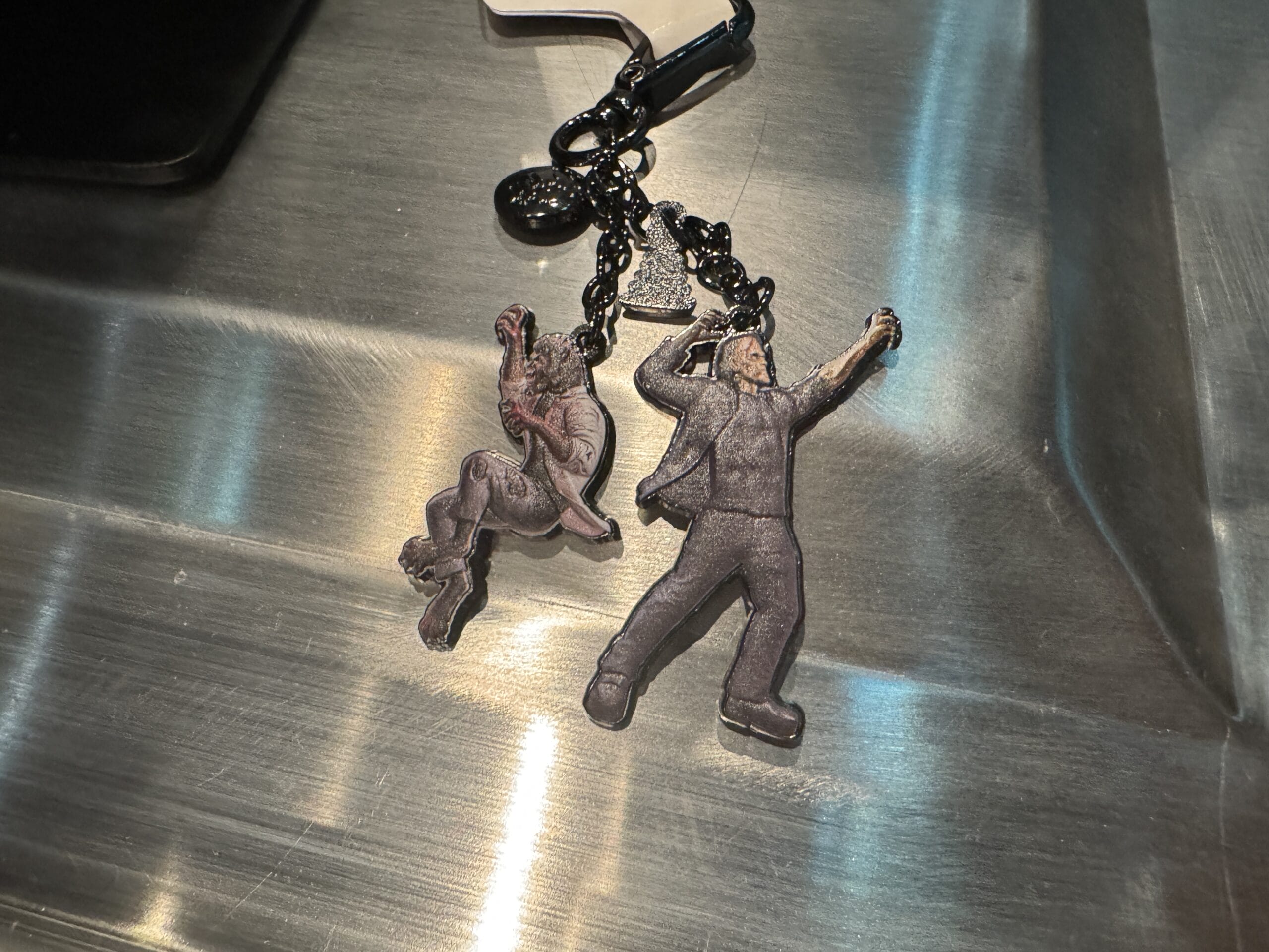 The Jack keychain has two charms on a chain hanging from a split ring. One charm is Jack’s face. It’s flat with a textured front.