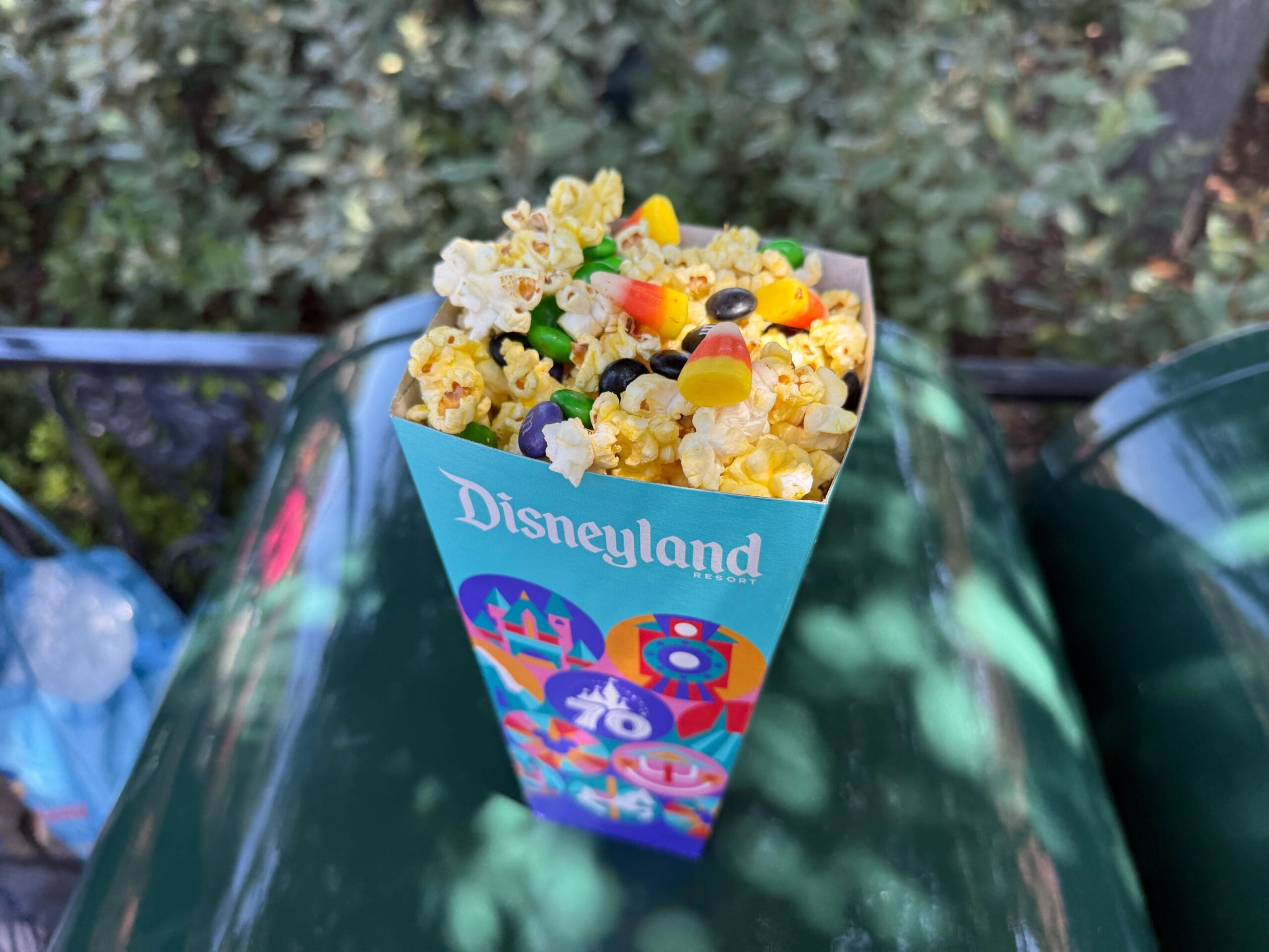A colorful Disneyland Halloween Treat Mix-in Popcorn box, filled with popcorn and candy, rests on a green bench outdoors.