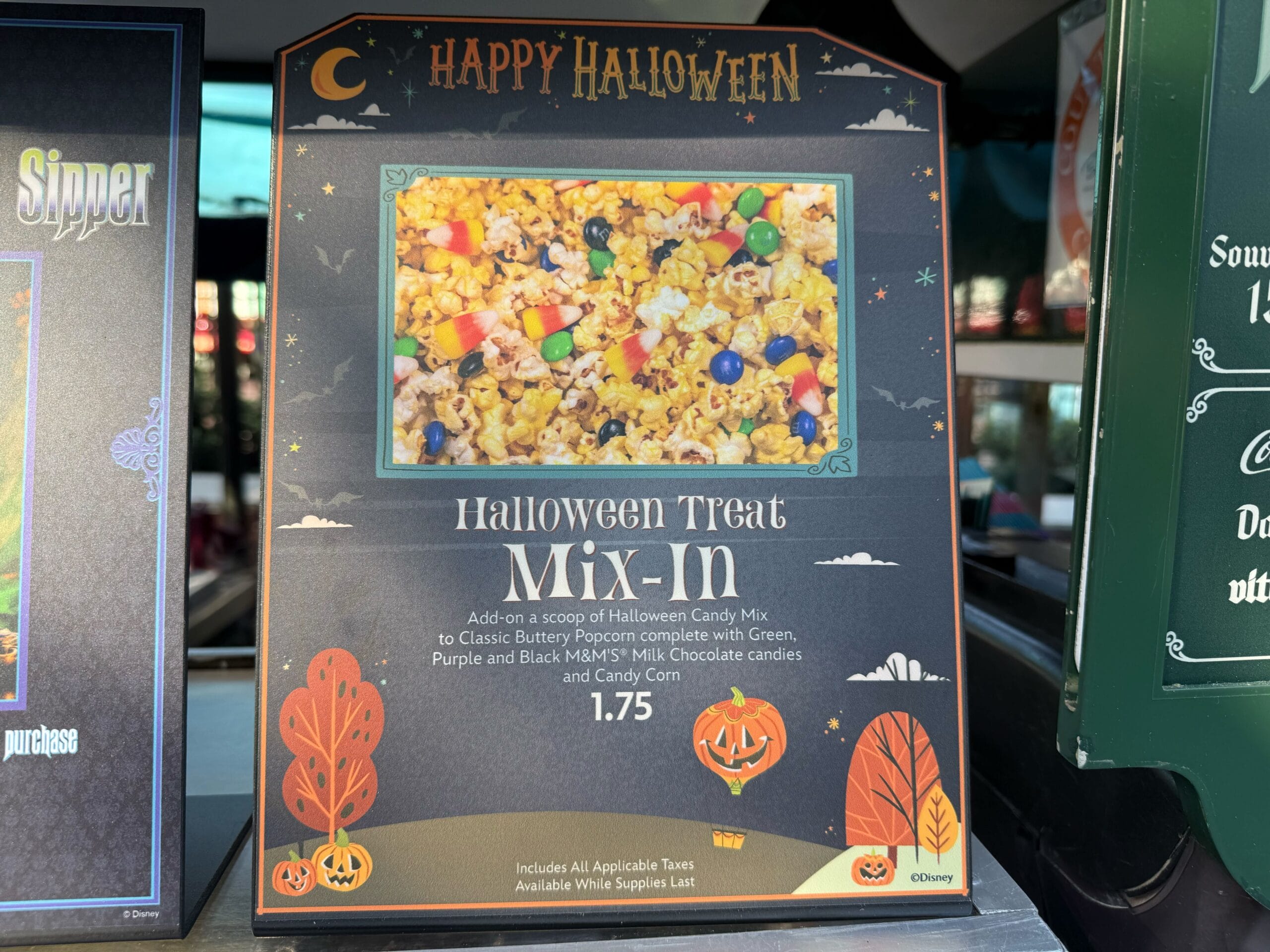 A sign at Disneyland advertises a Halloween Treat Mix with popcorn, M&M’s, and candy corn for $1.75, featuring pumpkins.