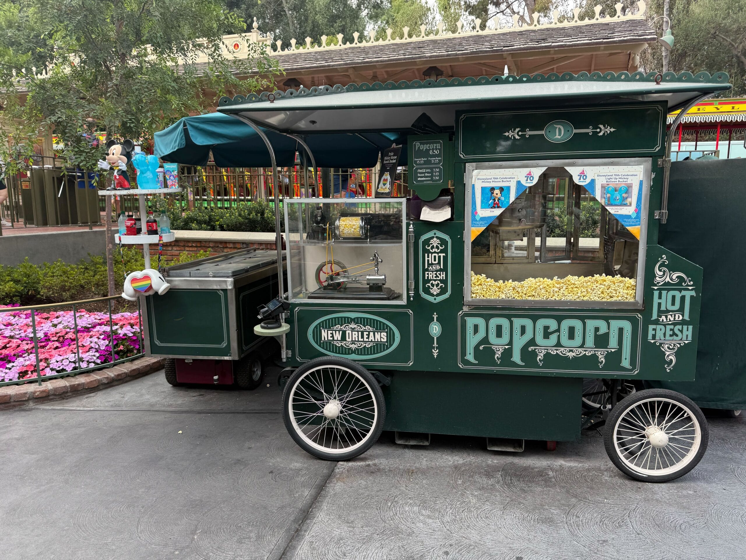 A vintage green popcorn cart labeled "Hot and Fresh" sits near flowers and colorful decor in an outdoor setting.