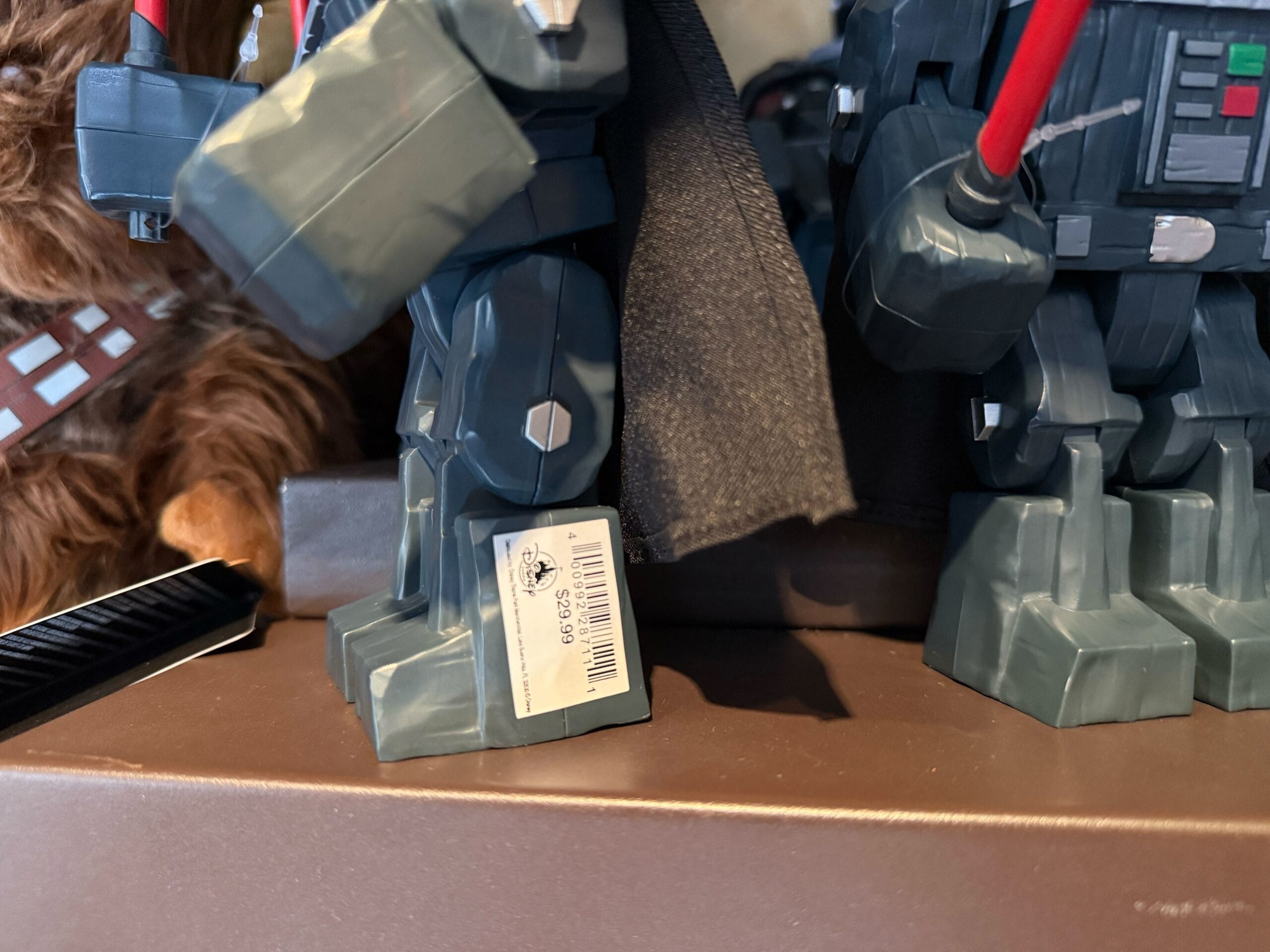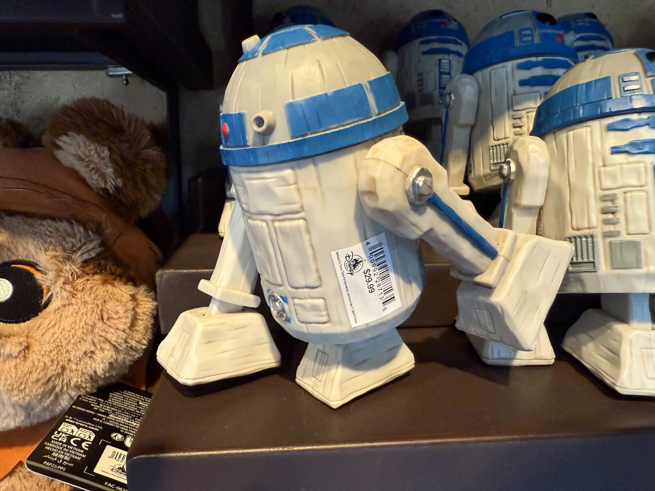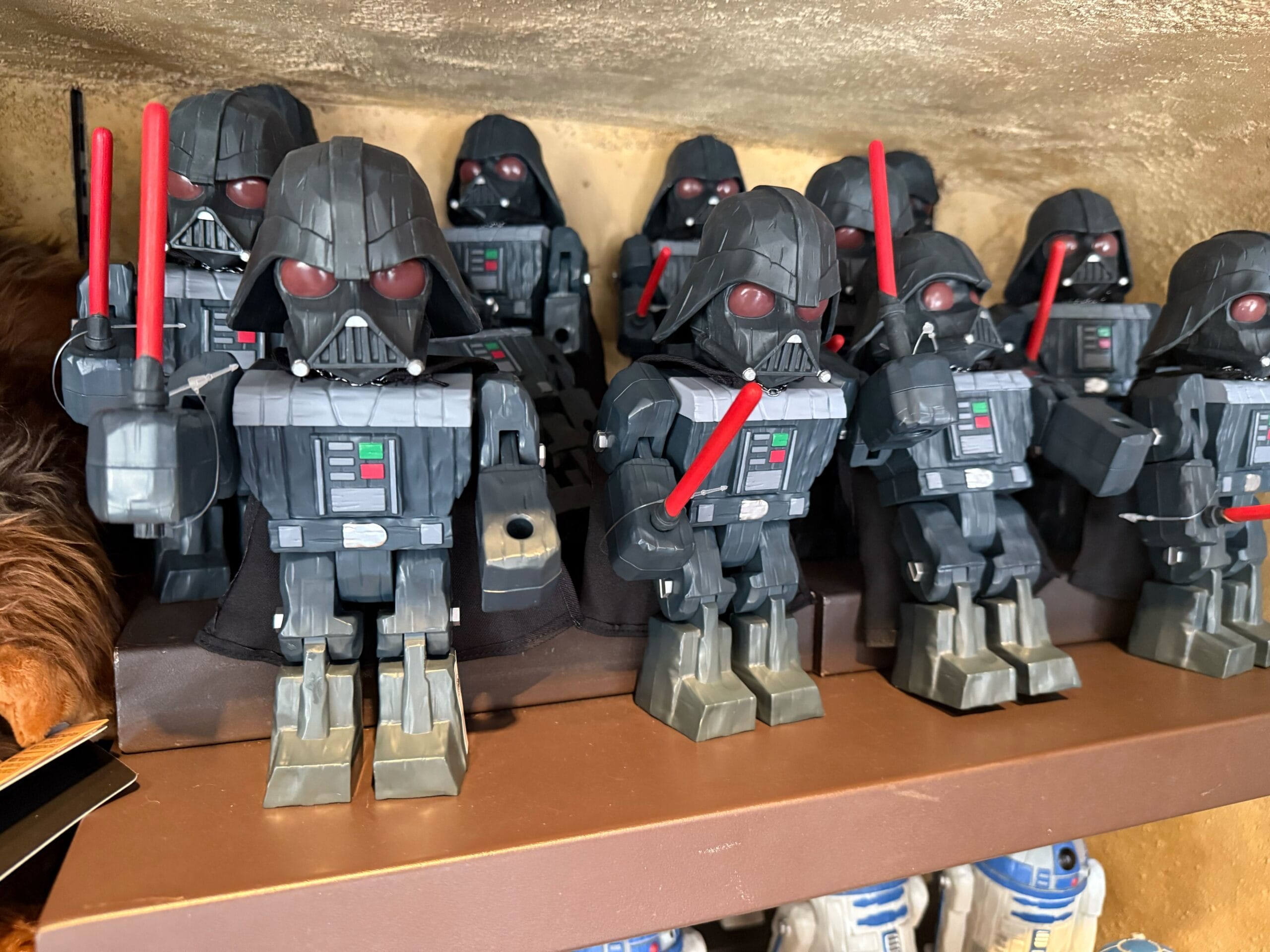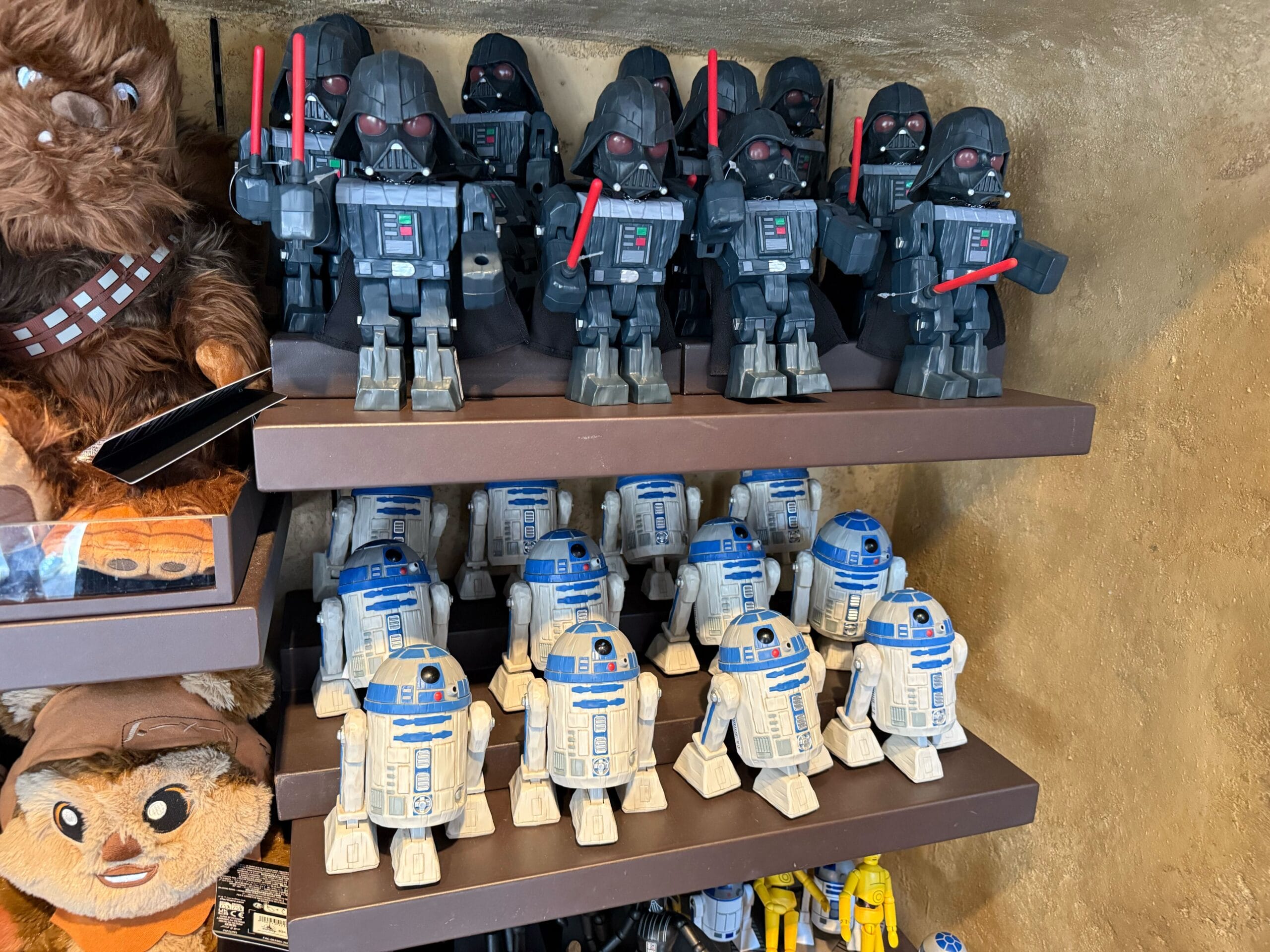 Shelves display Darth Vader and R2-D2 toys, with Chewbacca and Ewok plushies visible on the side.