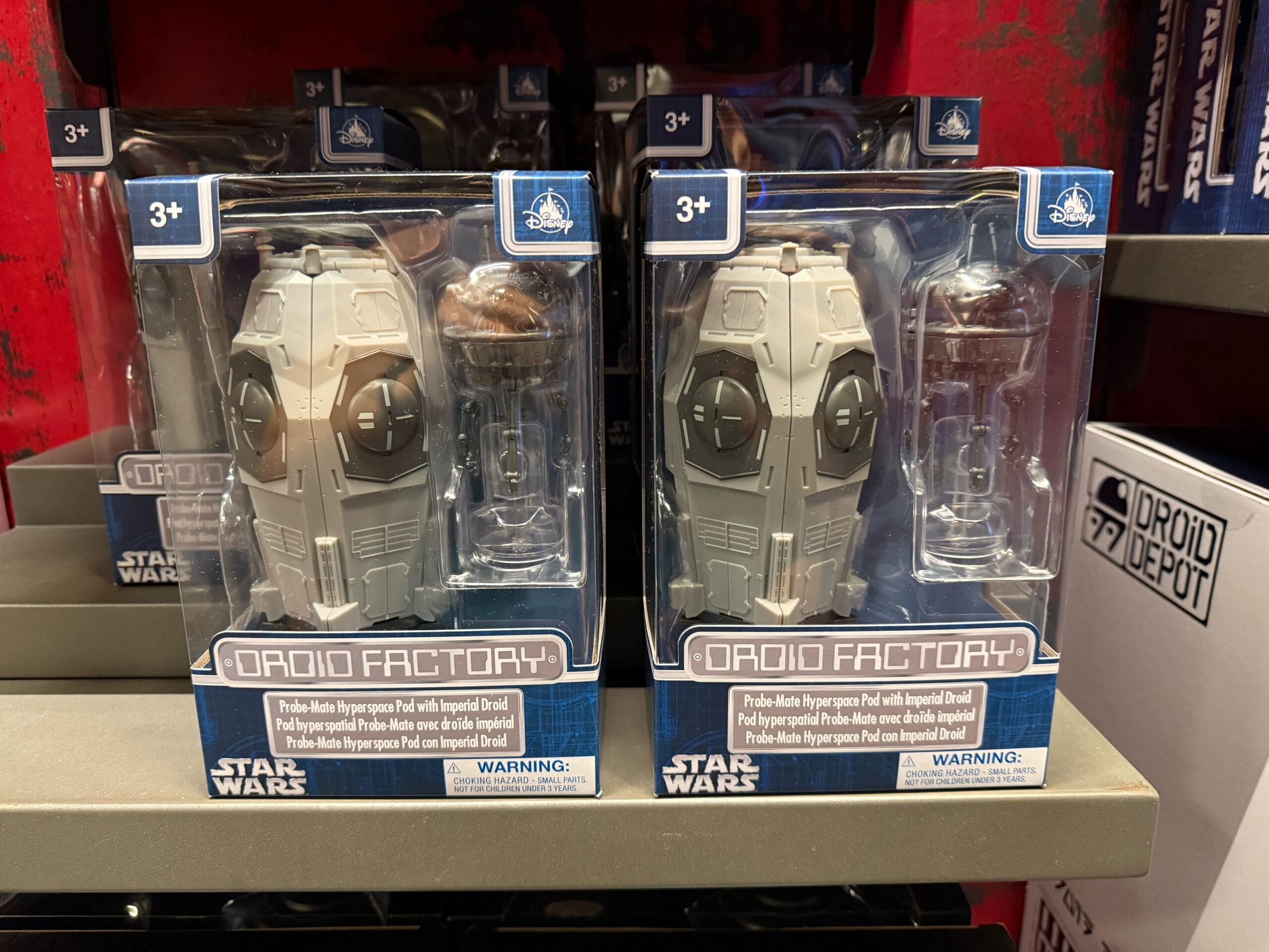 Two Star Wars Droid Factory toy packs on a store shelf, each containing a gray droid and a small silver accessory.