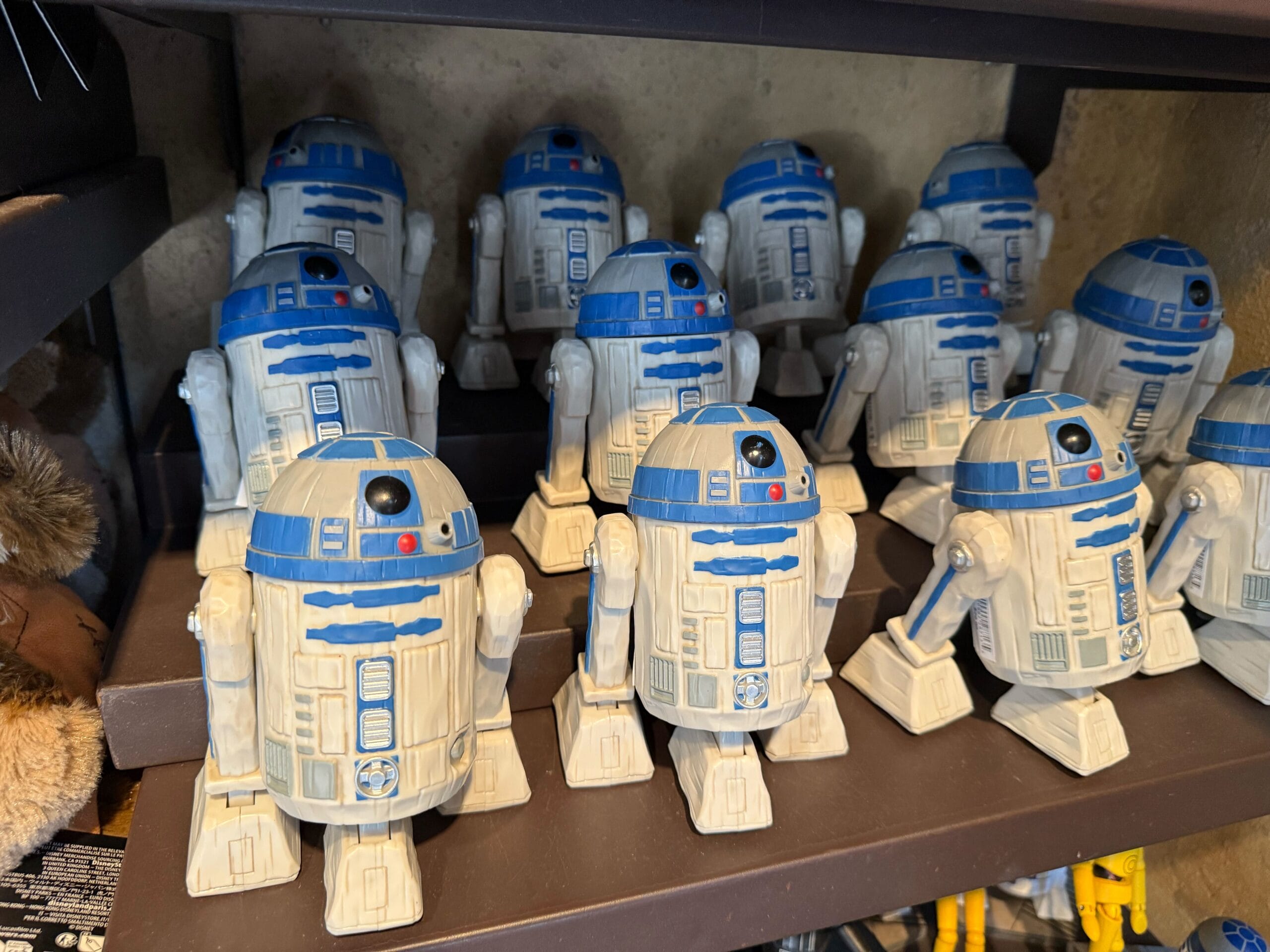 Shelves and packaging of Star Wars droid toys and Darth Vader figures, including R2-D2 and R2-B0025.