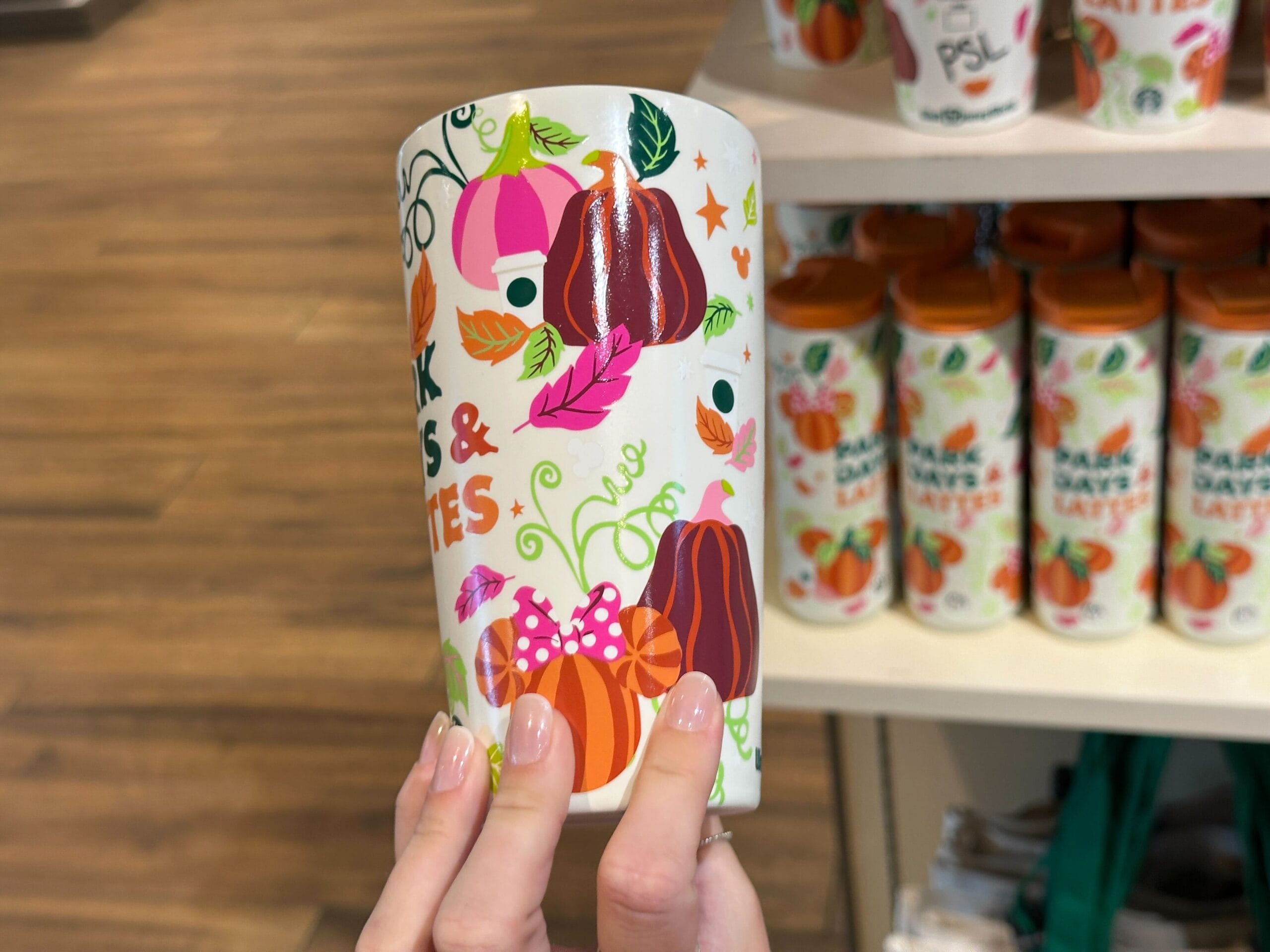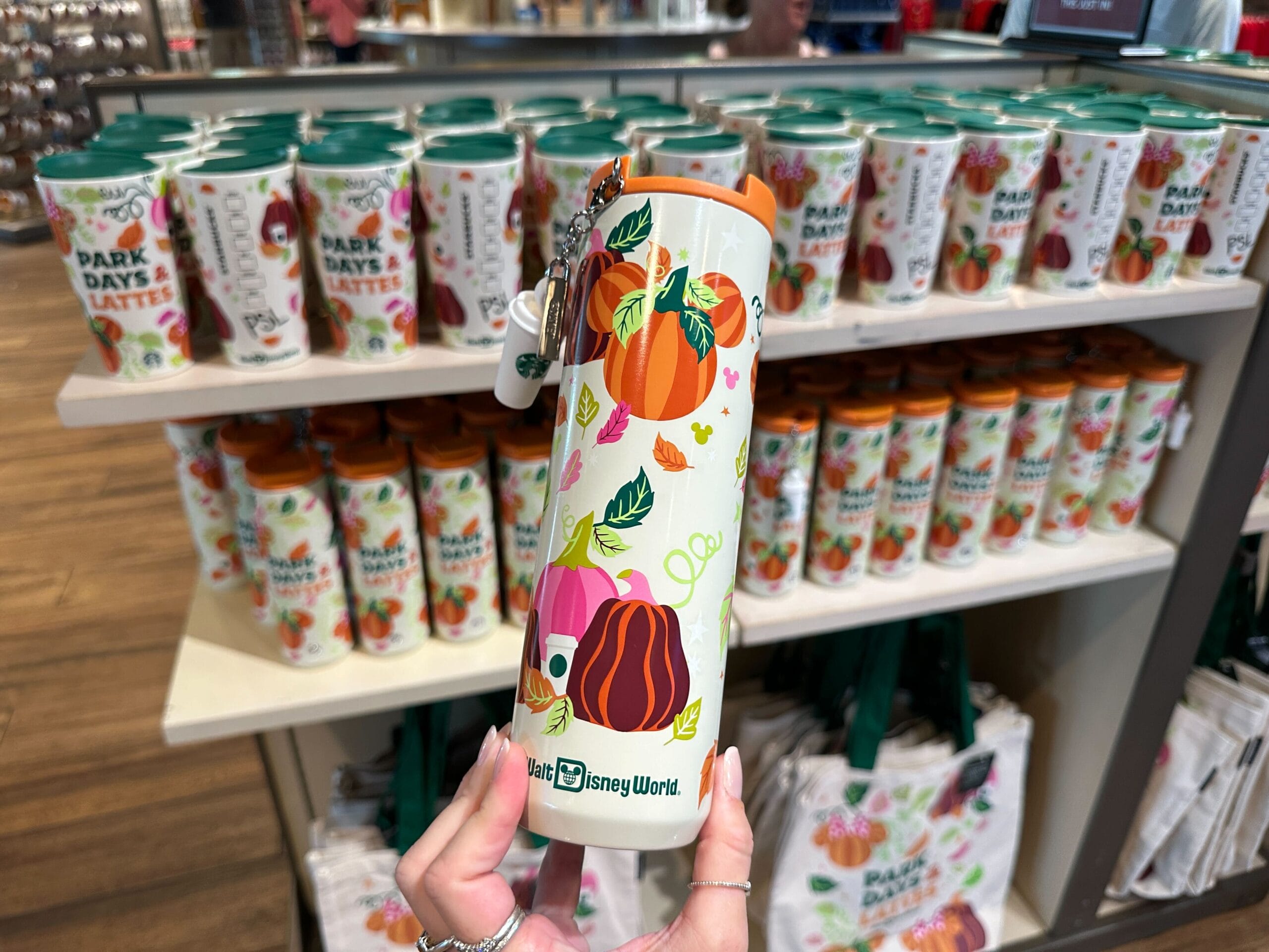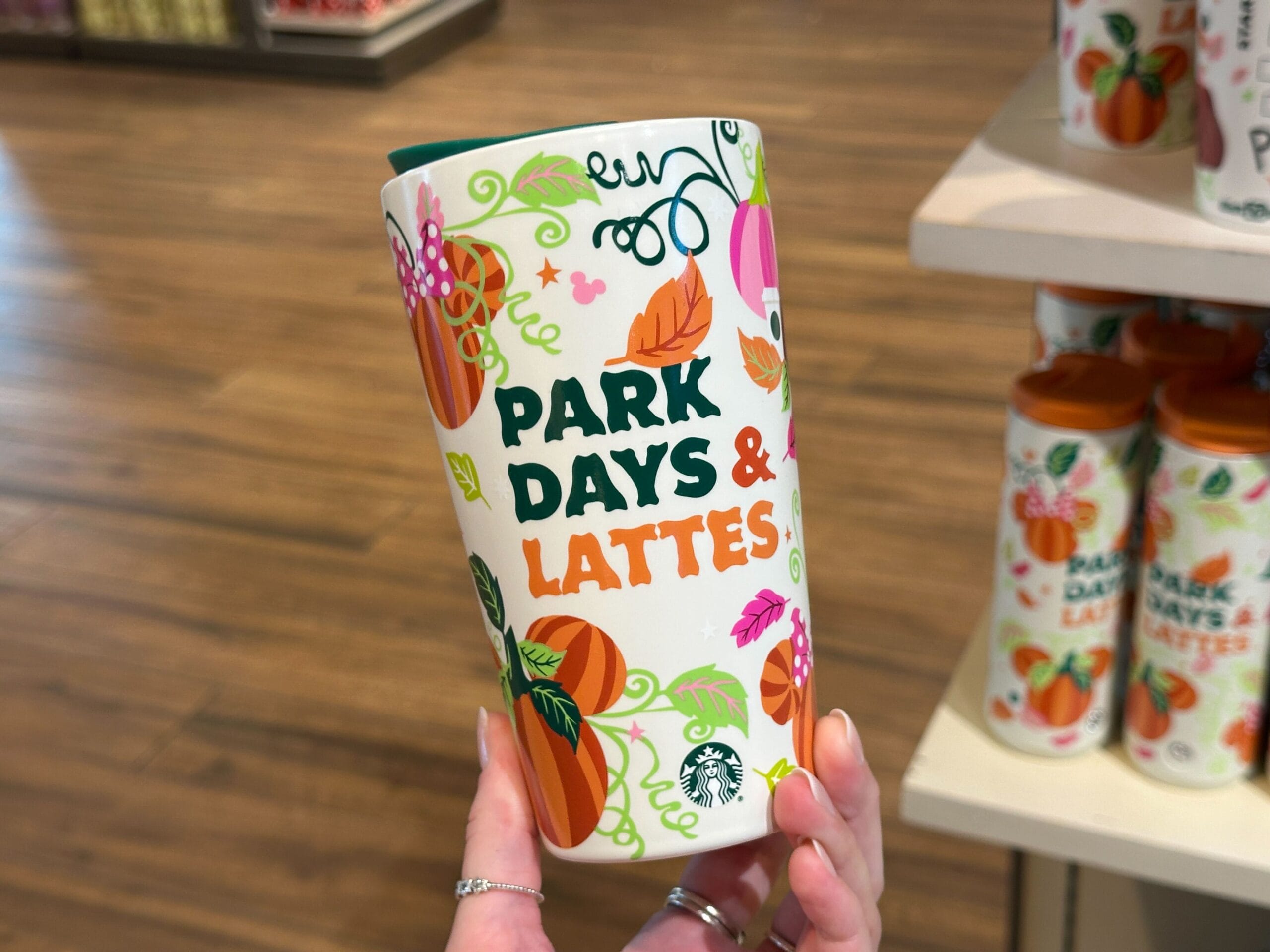 This tall tumbler is also white and covered in fall-themed iconography. “Park Days & Lattes” is printed in green and orange on the front. The Walt Disney World wordmark is in green near the bottom.